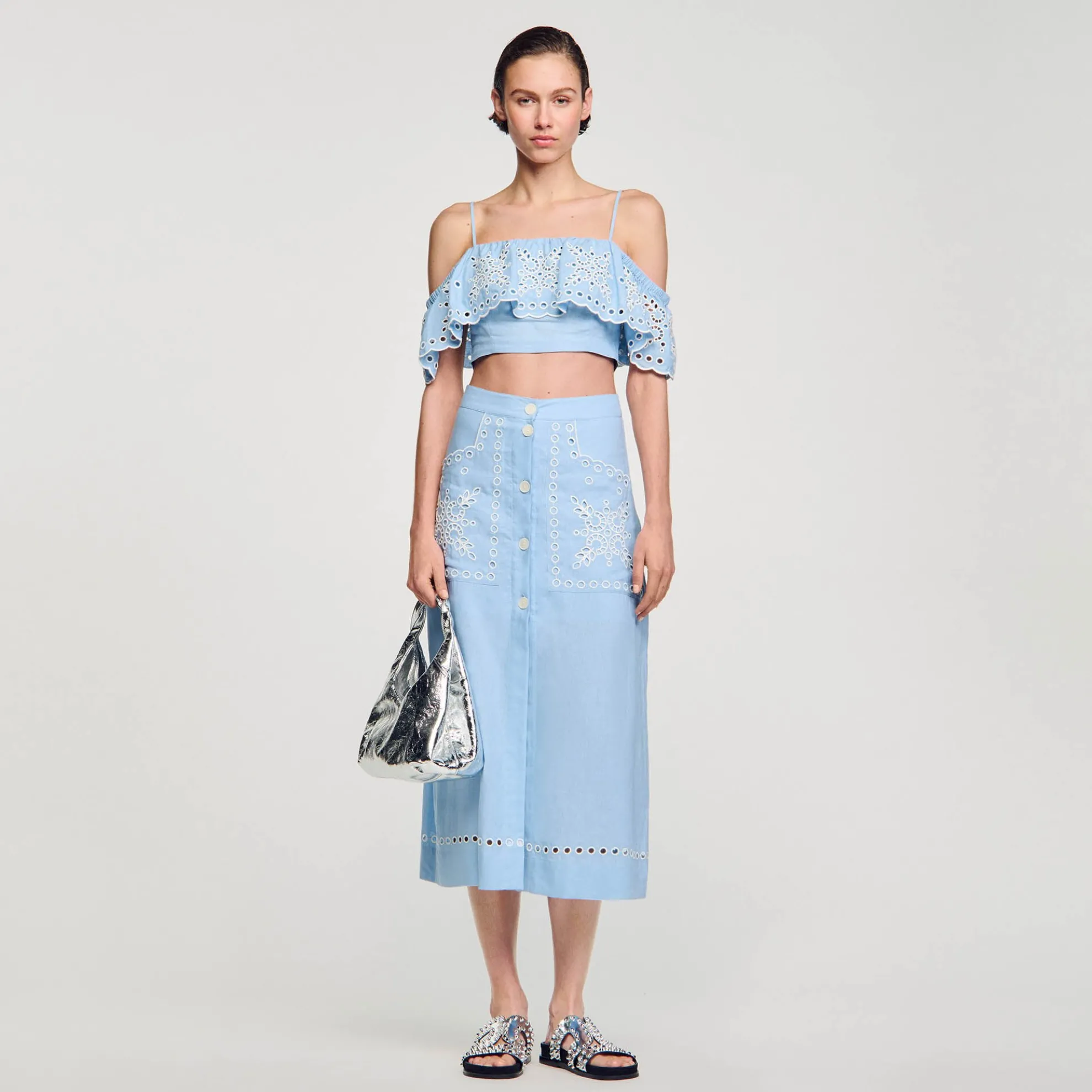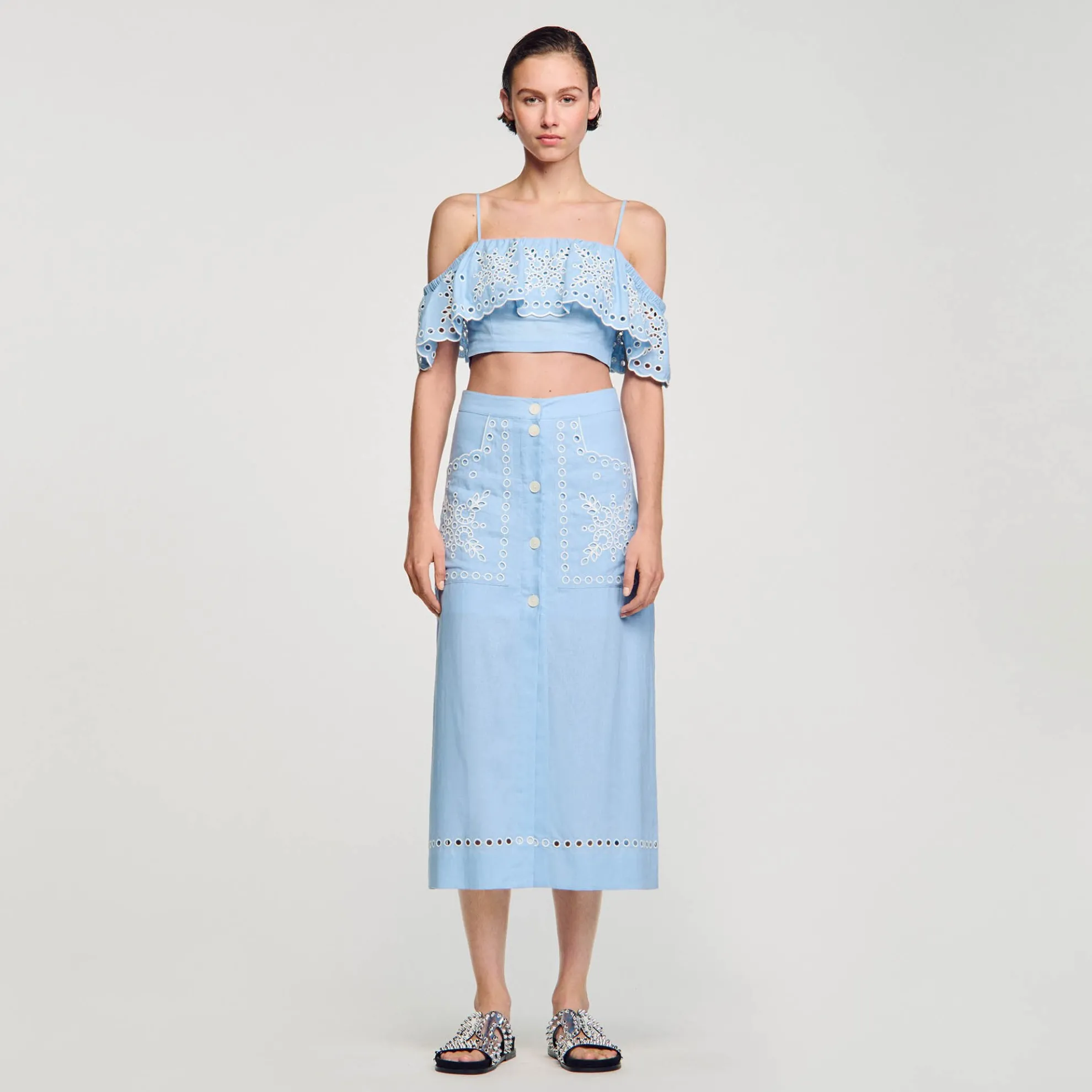 Lange rok met knoopsluiting, versierd met contrasterende broderie anglaise met bloemmotief op de zakken en zoom.