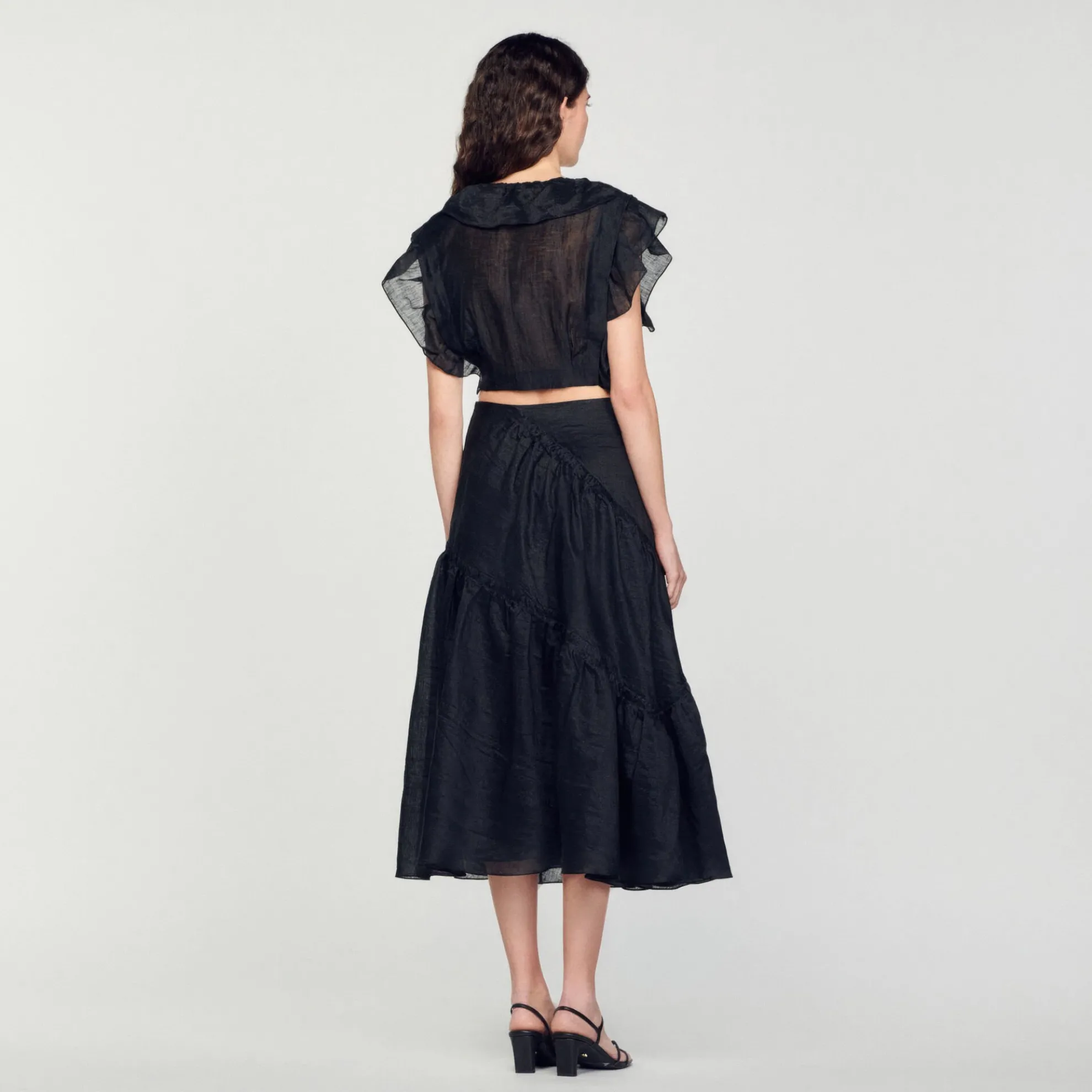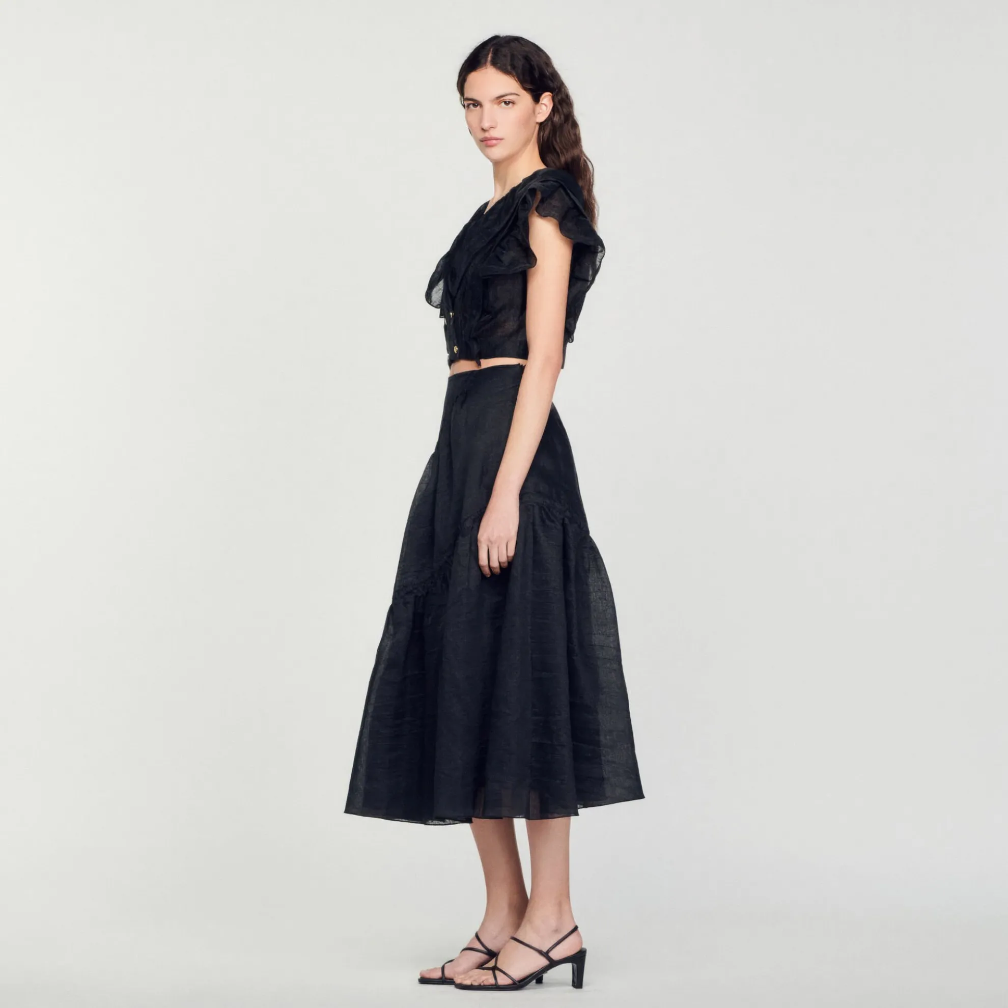Lange, enigszins wijd uitlopende rok met volants en plooitjes, en een ritssluiting aan de zijkant.