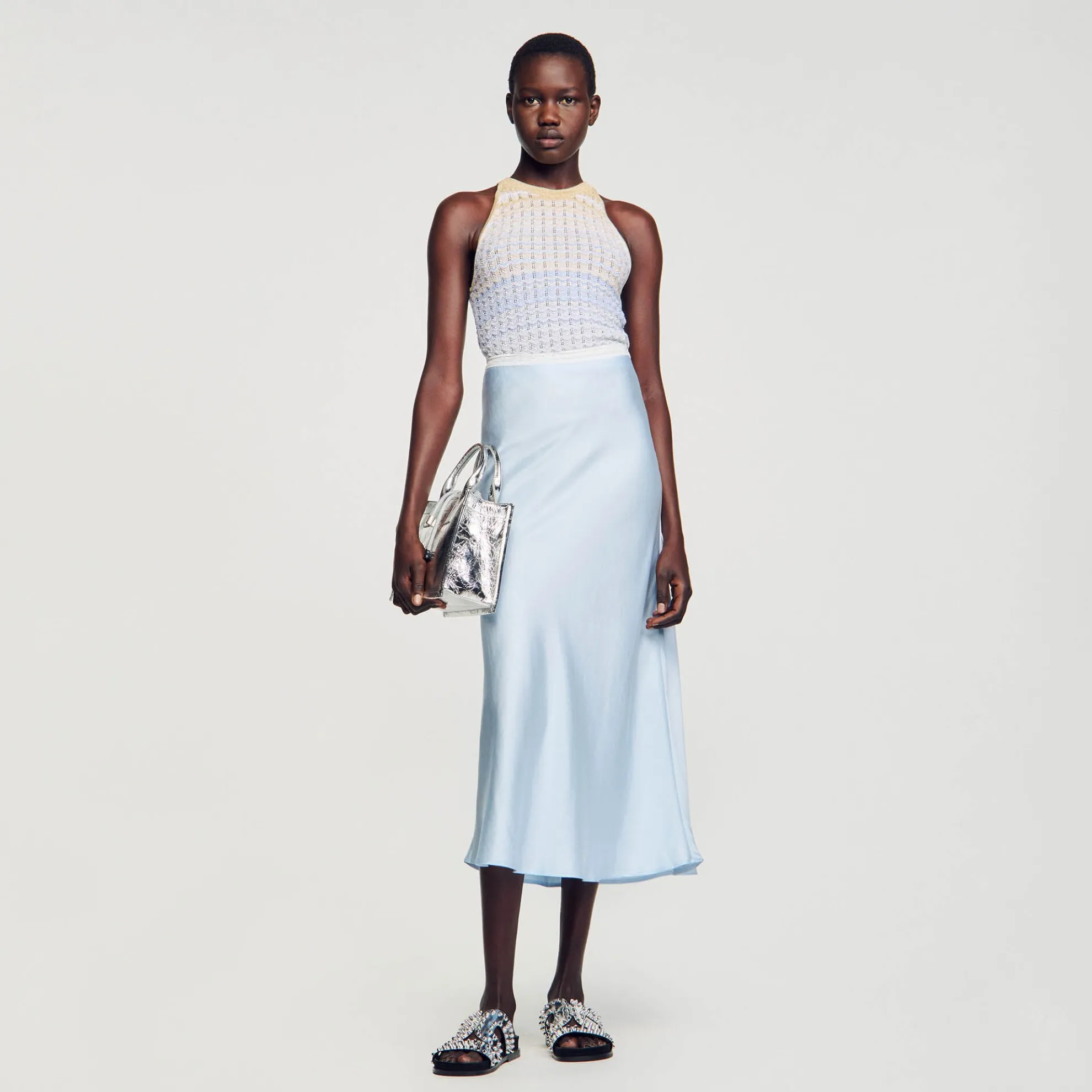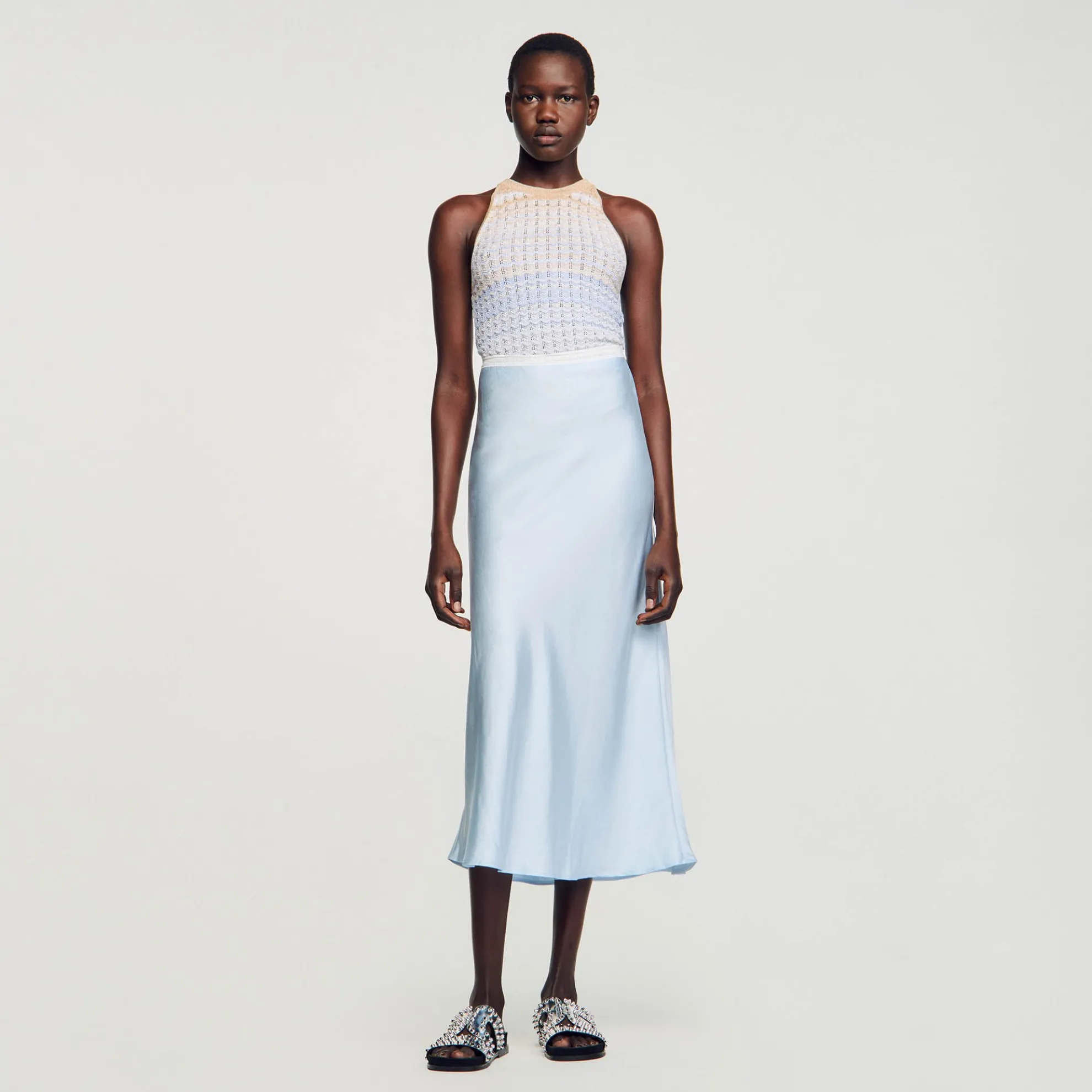 Rechte soepelvallende rok van mix van satijn en linnen met een kanten SANDRO ceintuur in de taille.