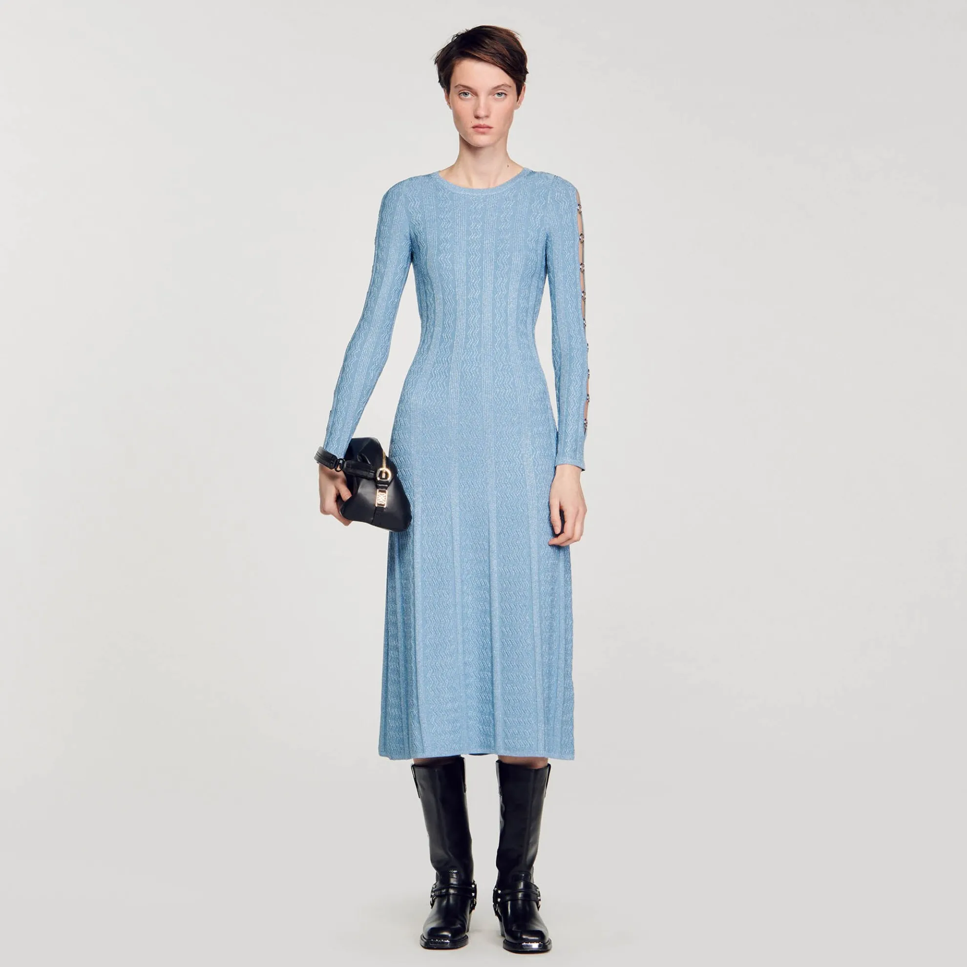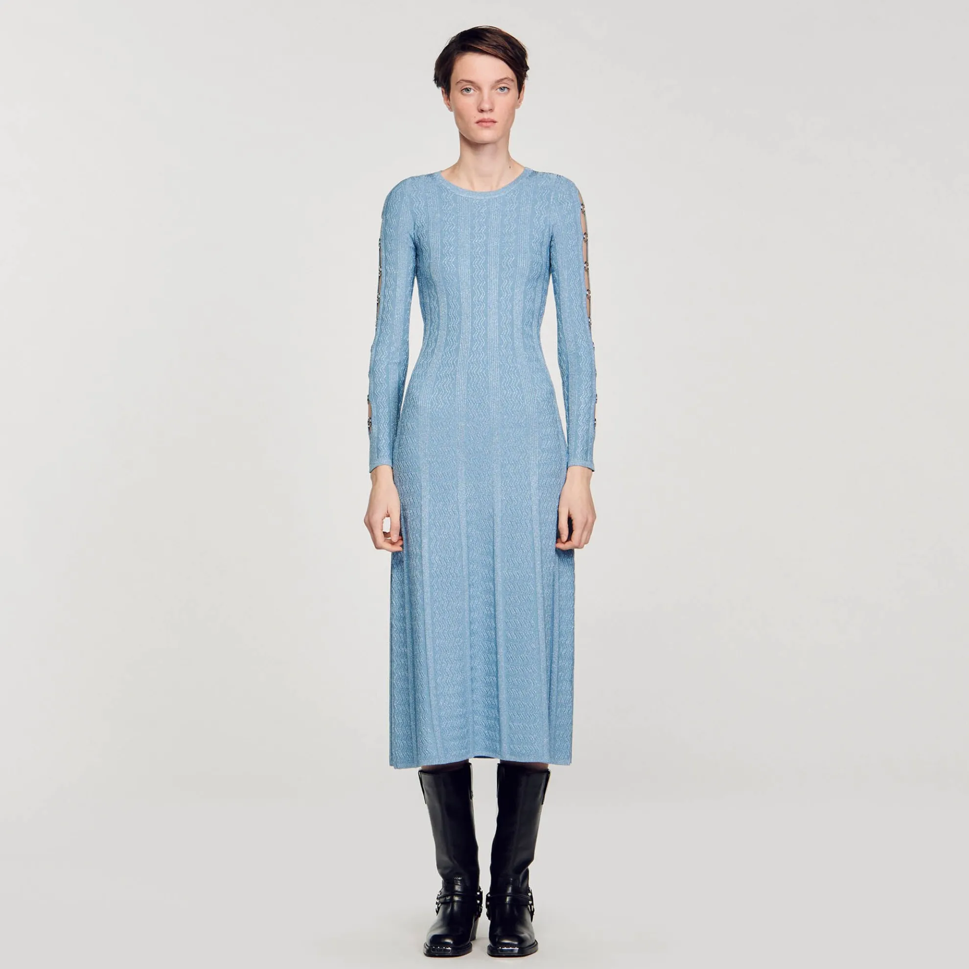 Kabelgebreide midi jurk iriserend met ronde hals en lange mouwen versierd met metalen ringen op de mouwen.