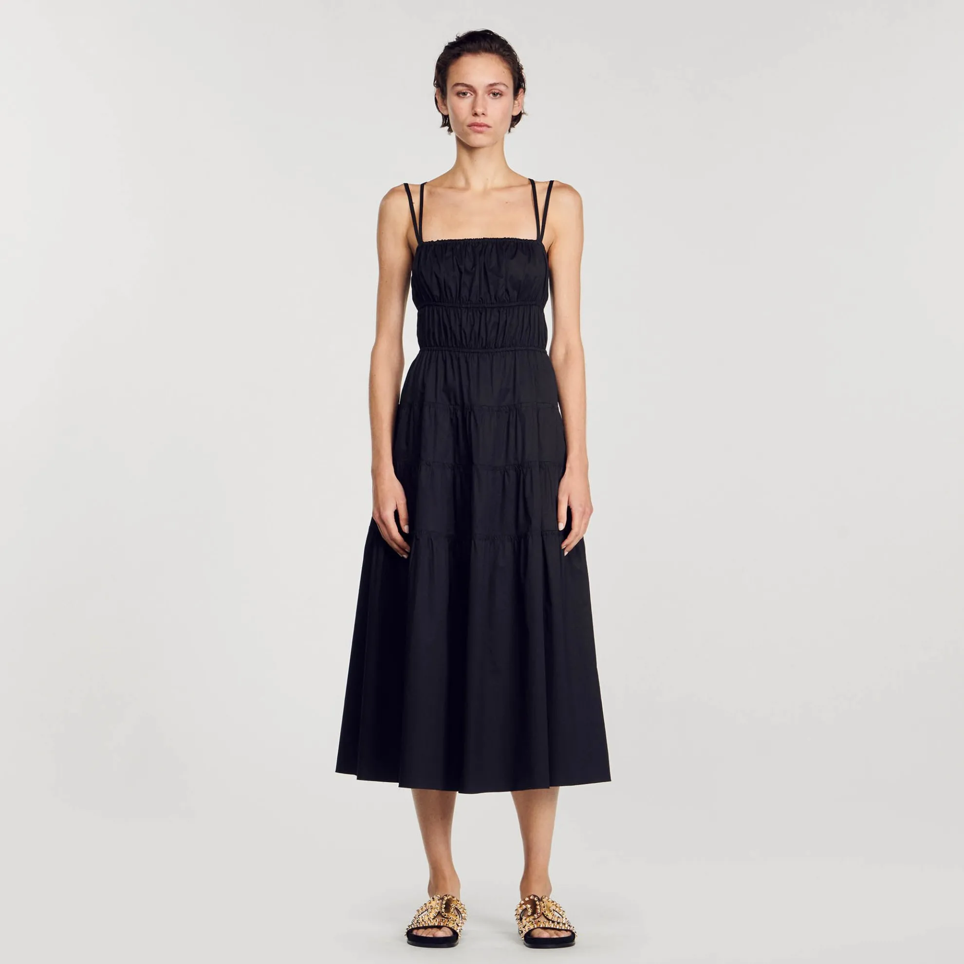 Katoenen midi jurk met gerimpelde elastische banden, dubbele schouderbandjes, een recht decolleté en uitlopend rokgedeelte.