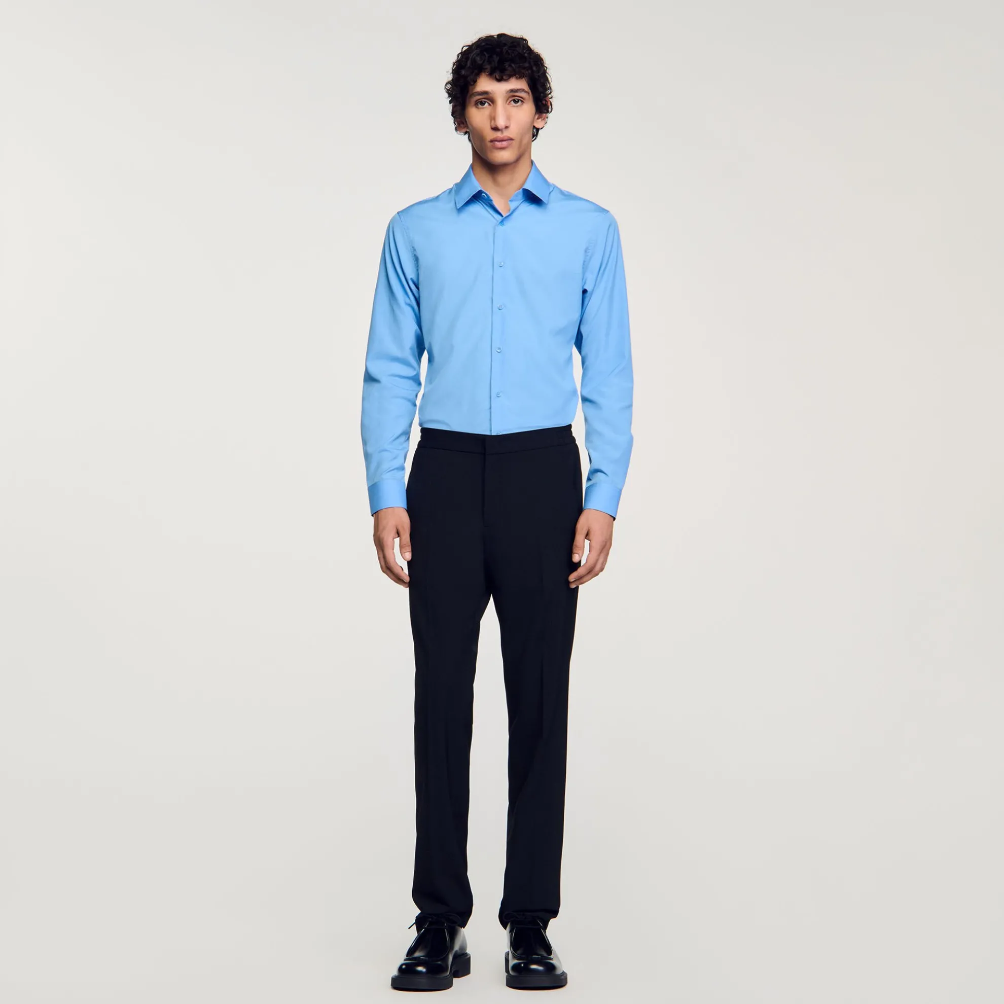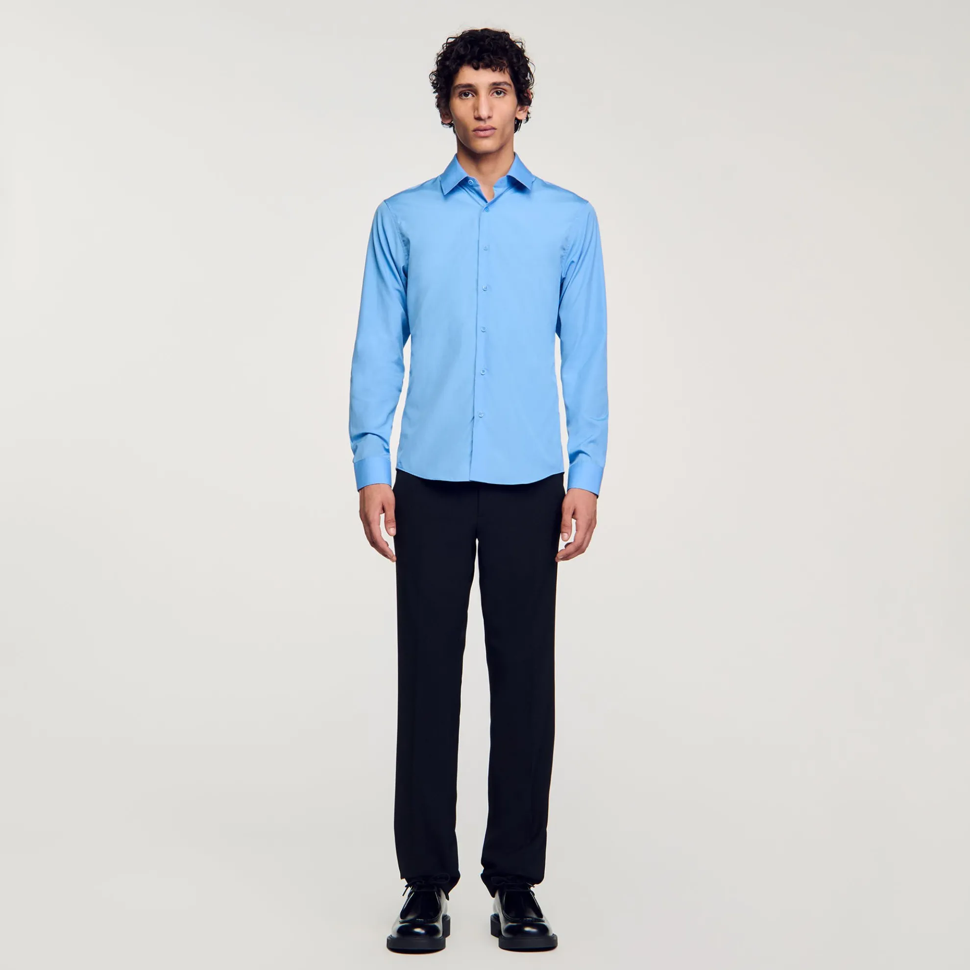 Overhemd met klassieke kraag, lange mouwen met knoopmanchetten, een knoopsluiting en een lange afgeronde onderkant.
