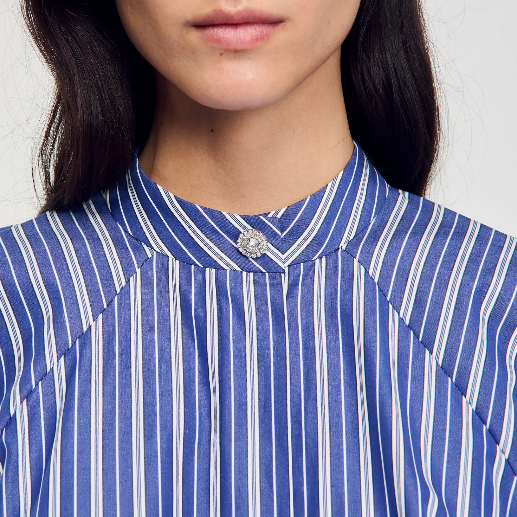 Kort gestreept overhemd met lange mouwen, knoopsluiting en ronde hals met sieraadknoop.