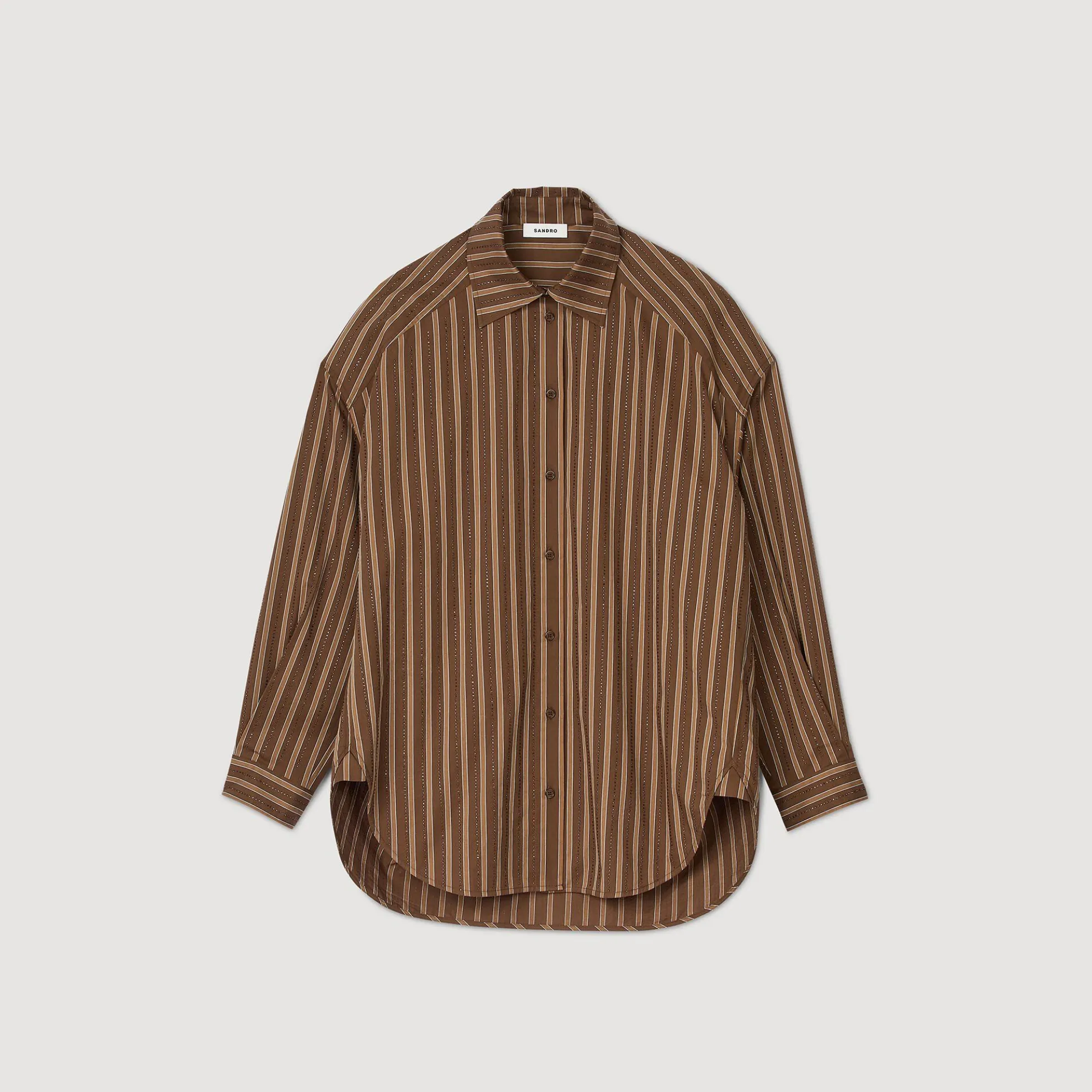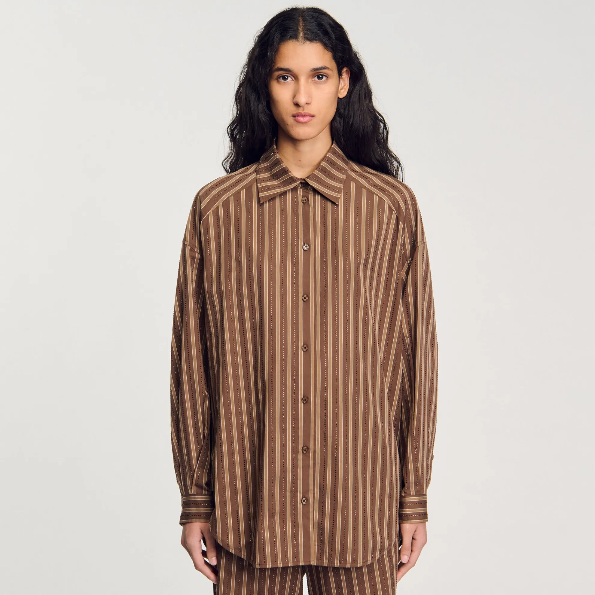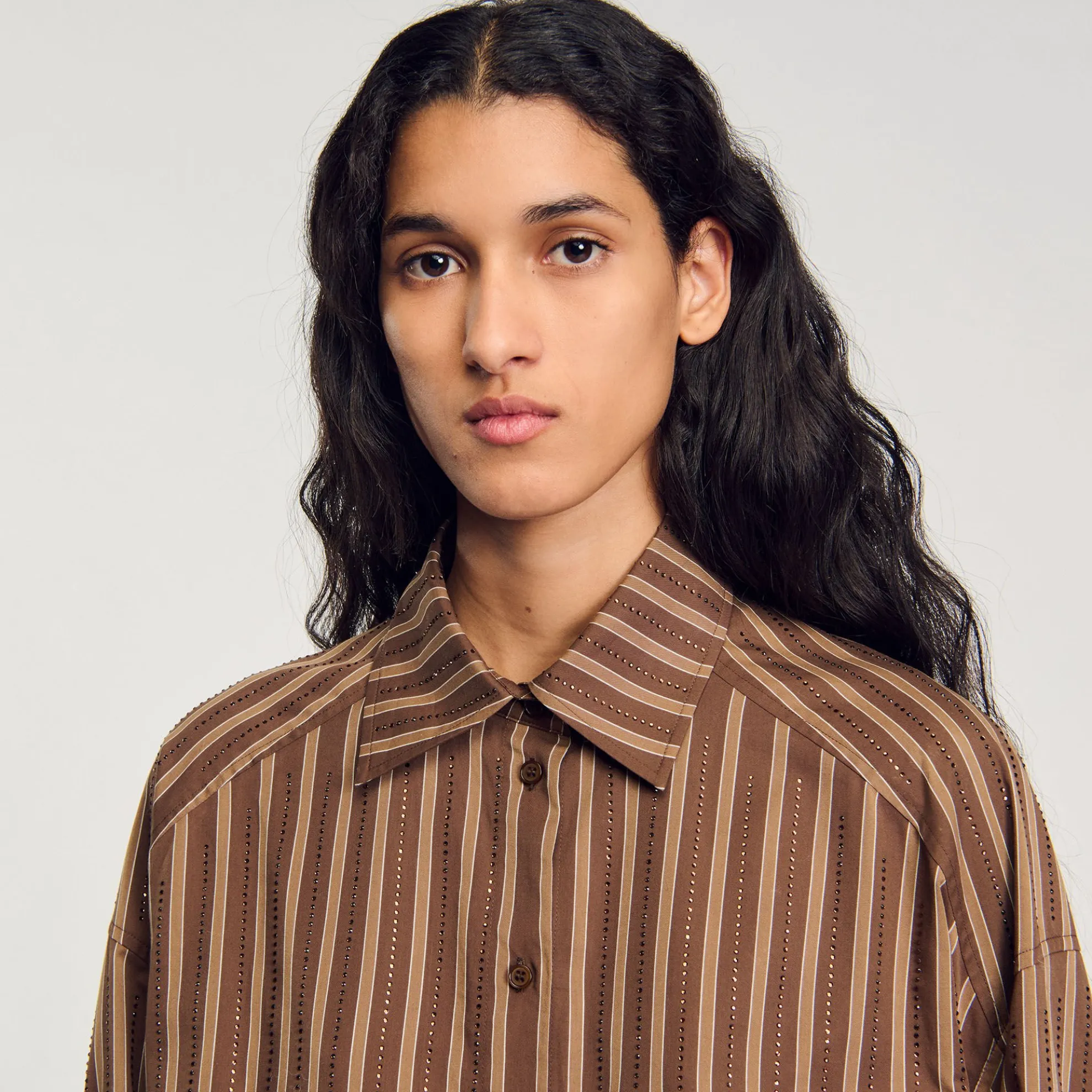 Oversized overhemd met verticale strepen volledig versierd met stras, lange mouwen, een knoopsluiting en een lange afgeronde onderkant.