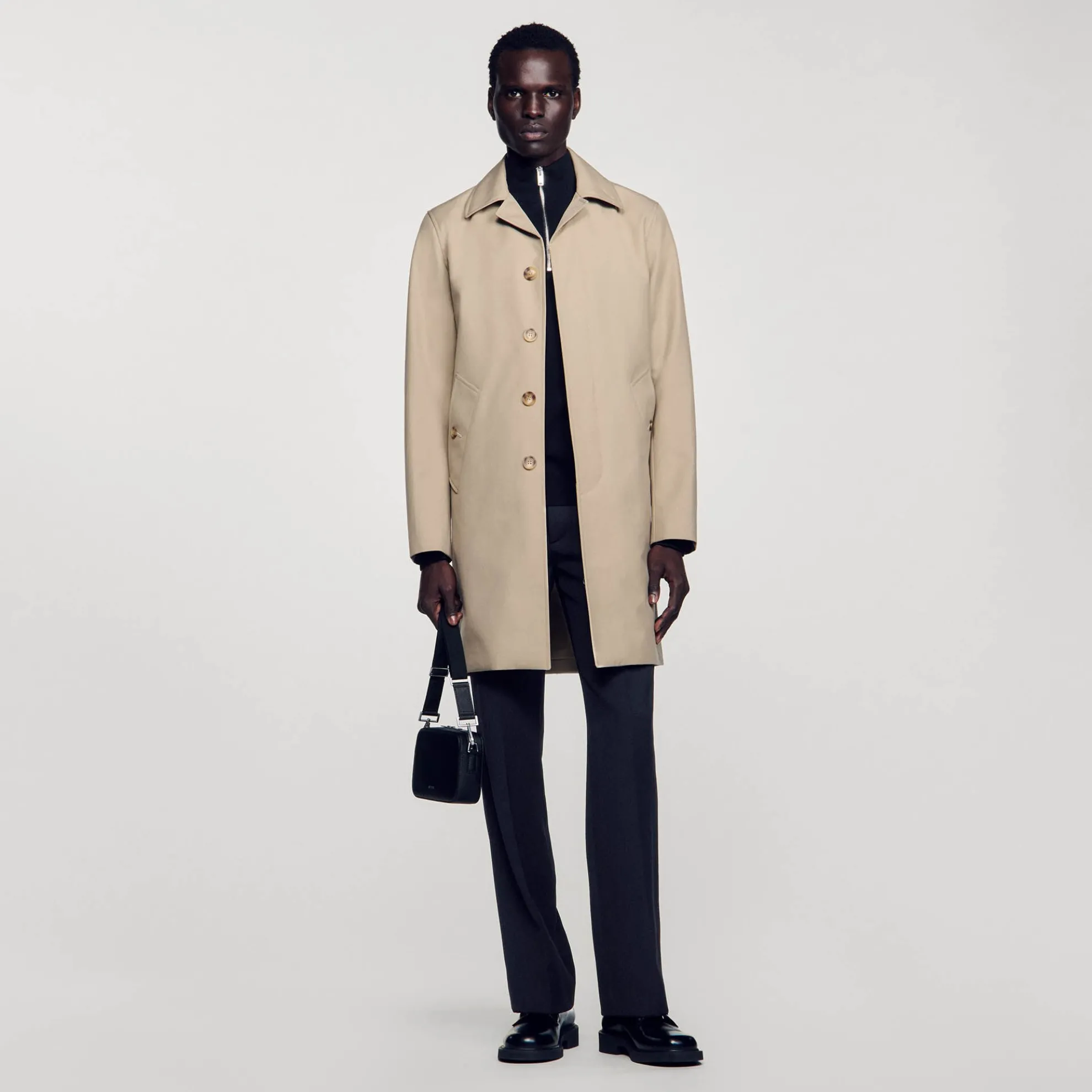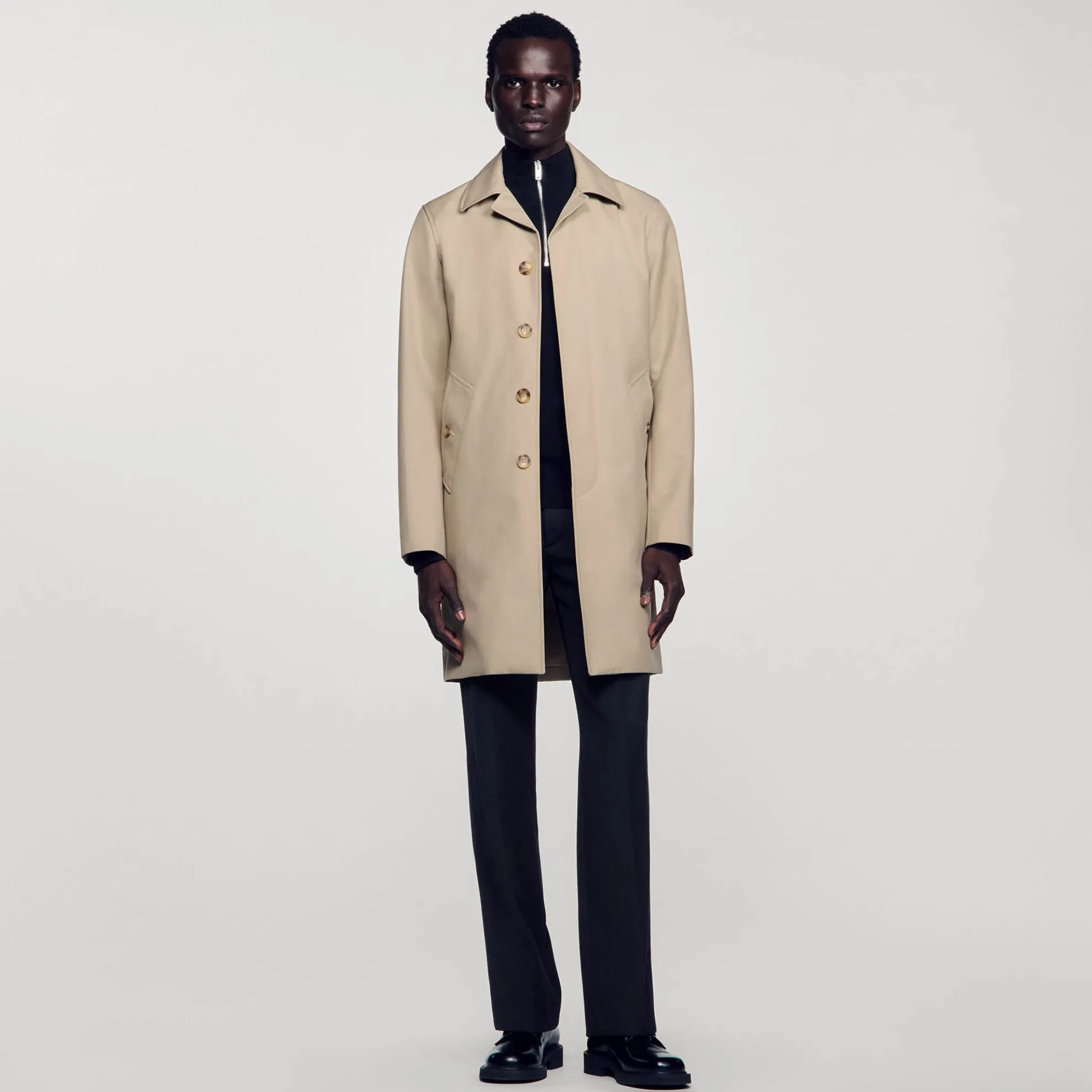 Halflange regenjas met lange mouwen, een overhemdkraag en een knoopsluiting.