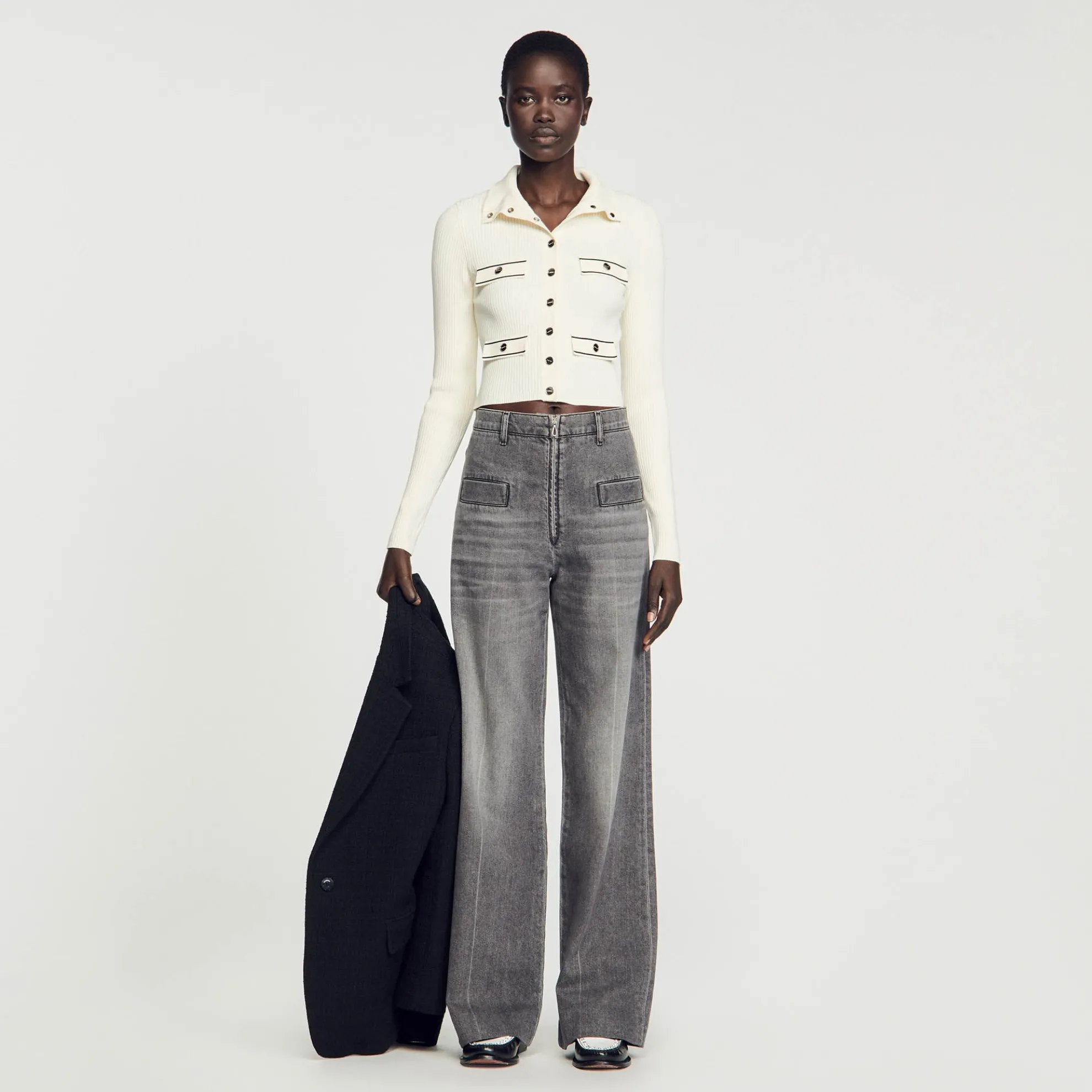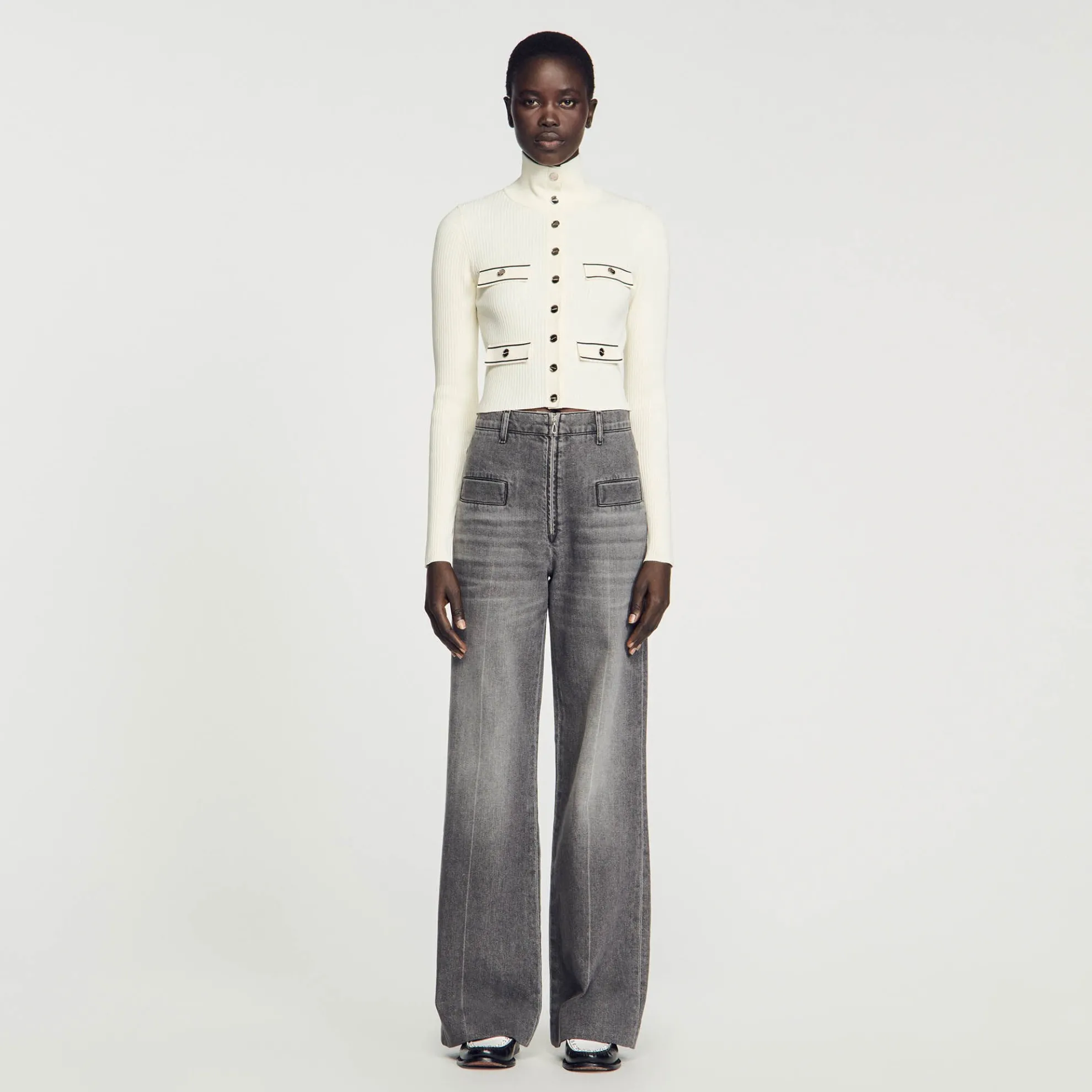 Ribgebreid cardigan vest met opstaande schipperskraag, lange mouwen, drukknoopsluiting en zakken met contrasterende biezen.