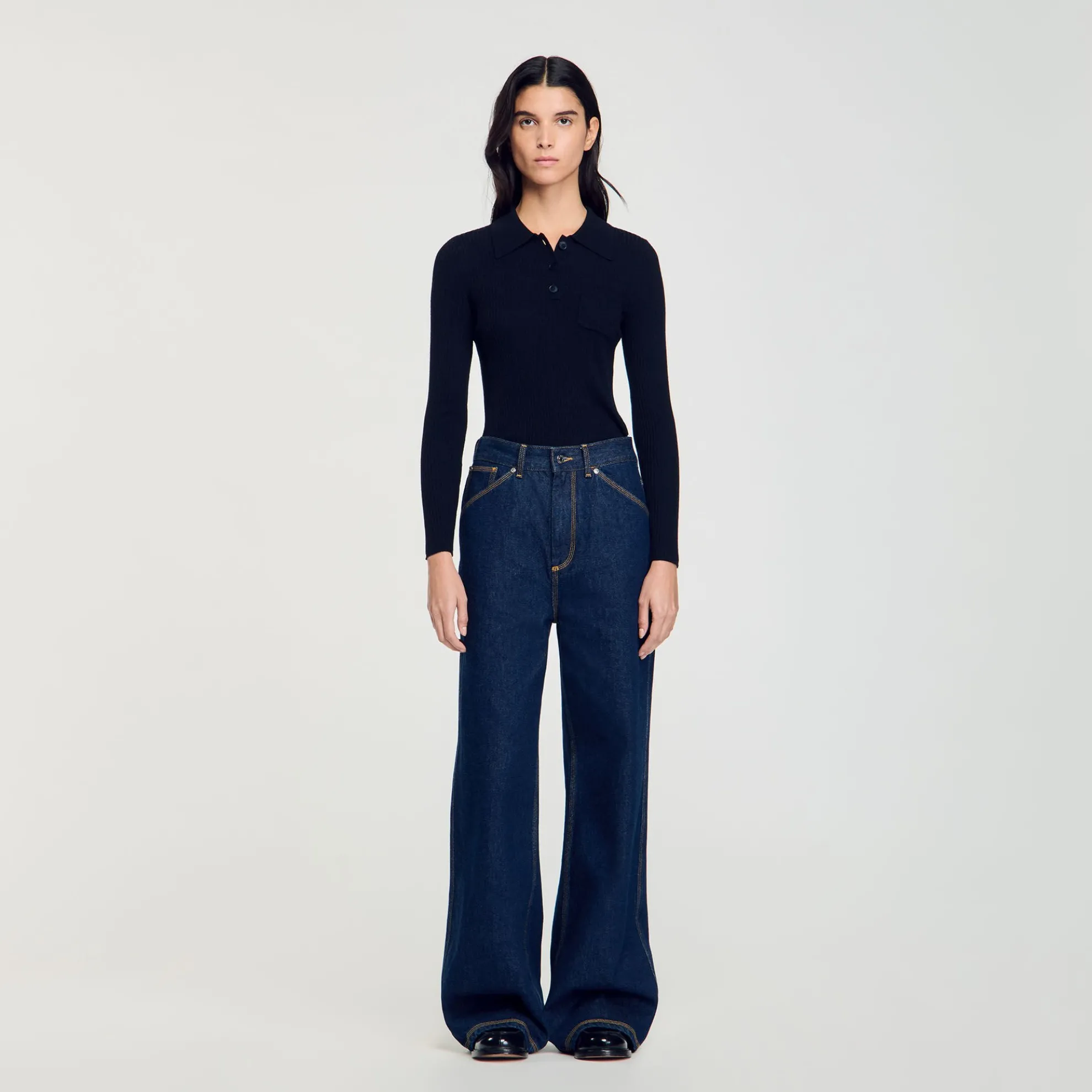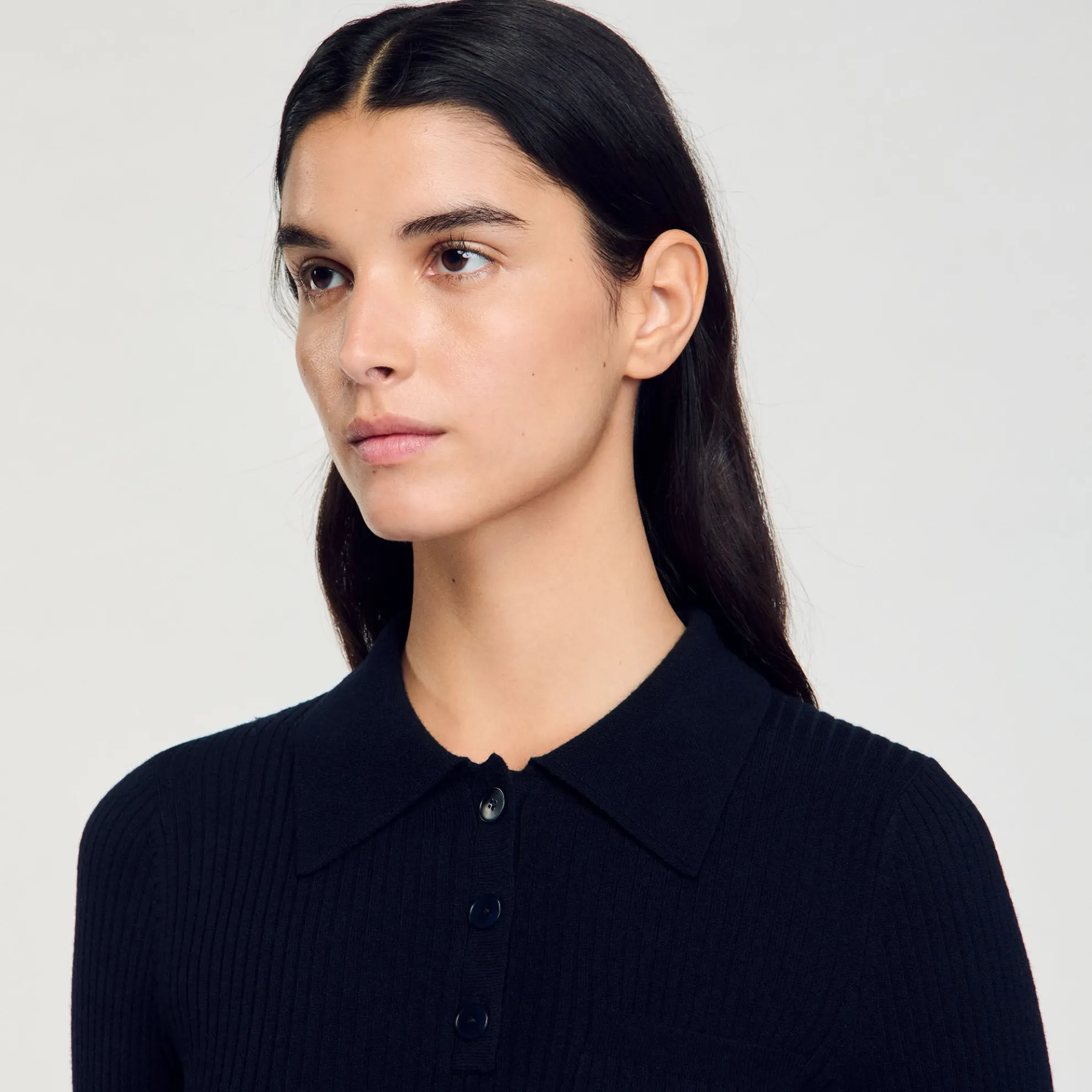 Geribde trui met gevlekt effect, button-down polokraag, lange mouwen en opgestikte zak op de borst.