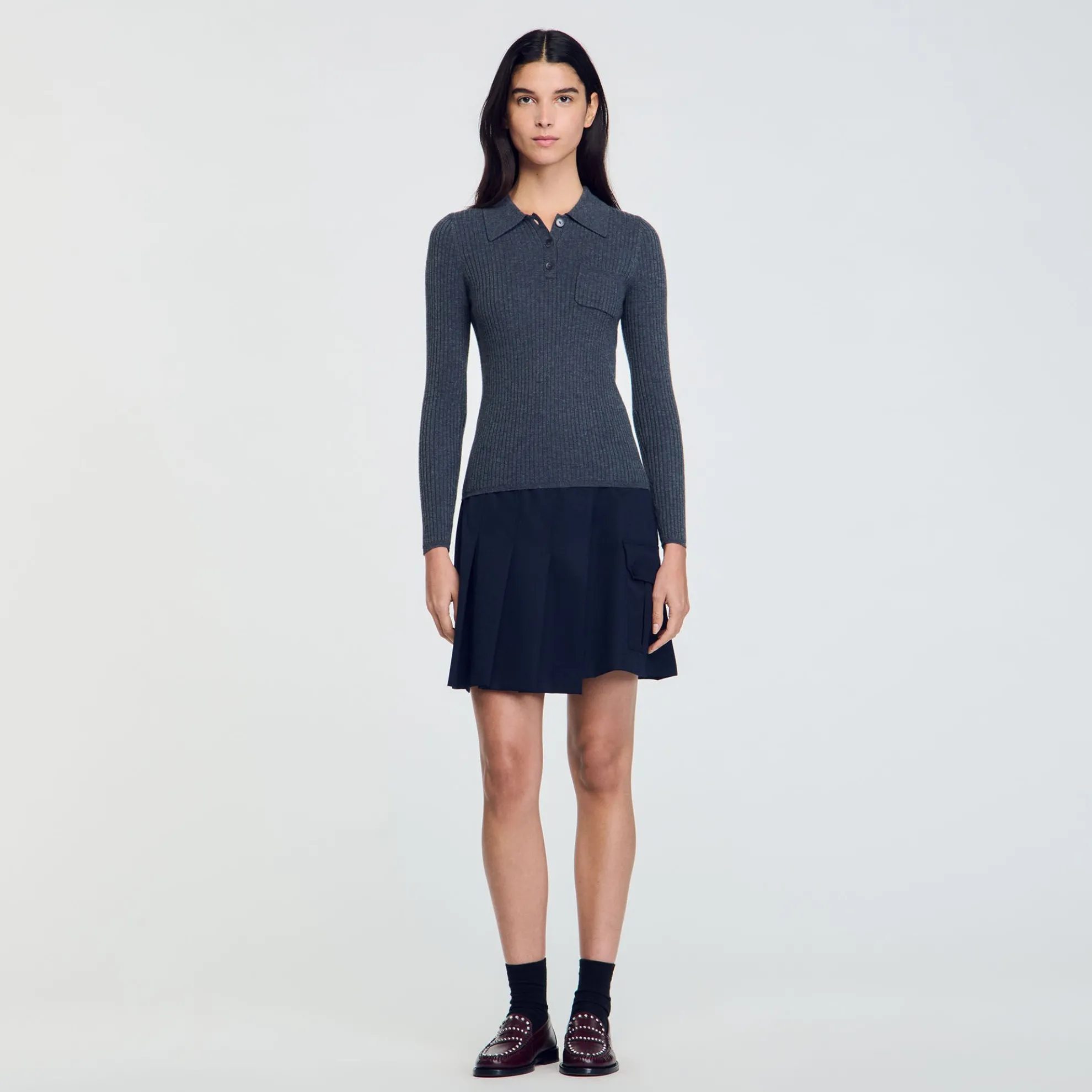 Geribde trui met gevlekt effect, button-down polokraag, lange mouwen en opgestikte zak op de borst.