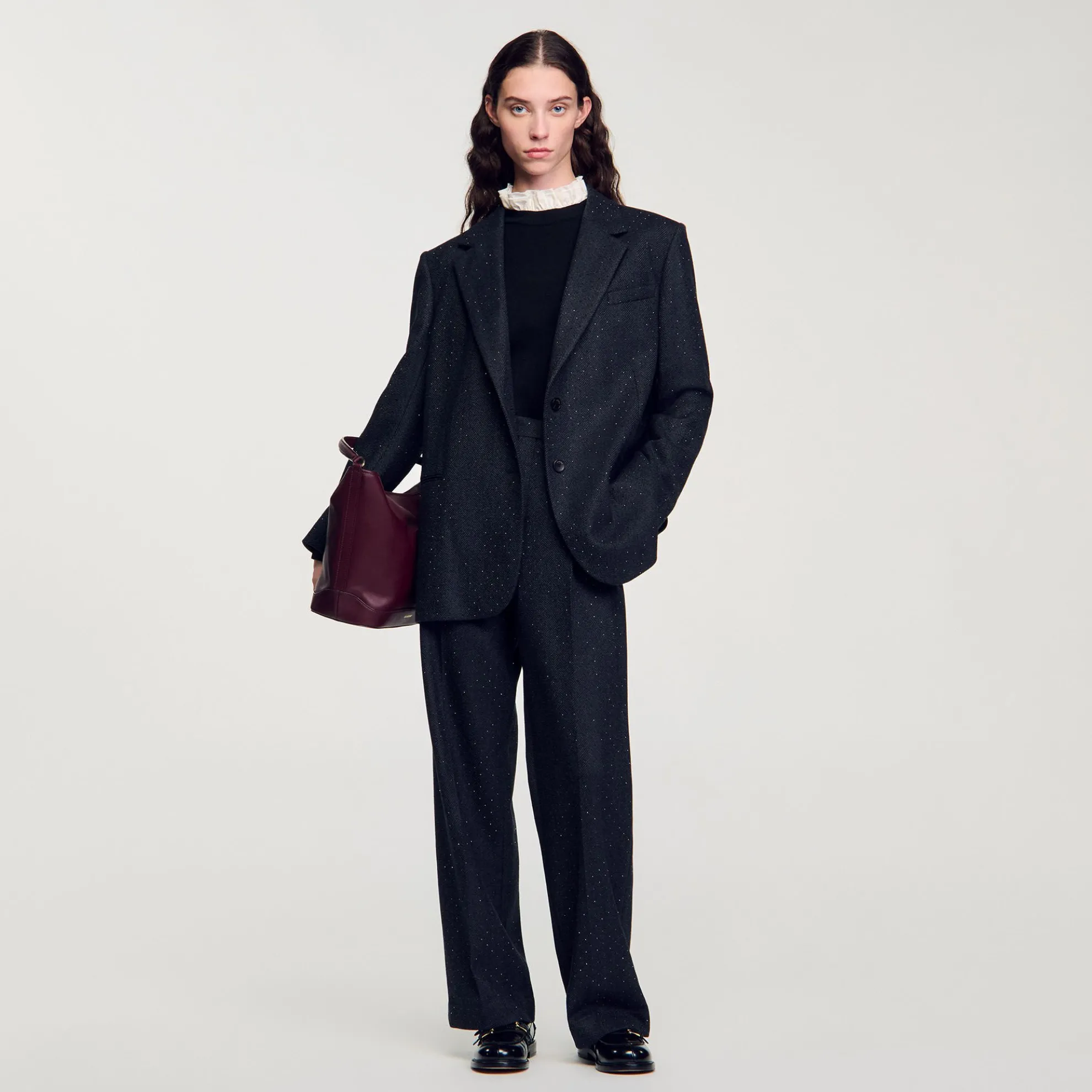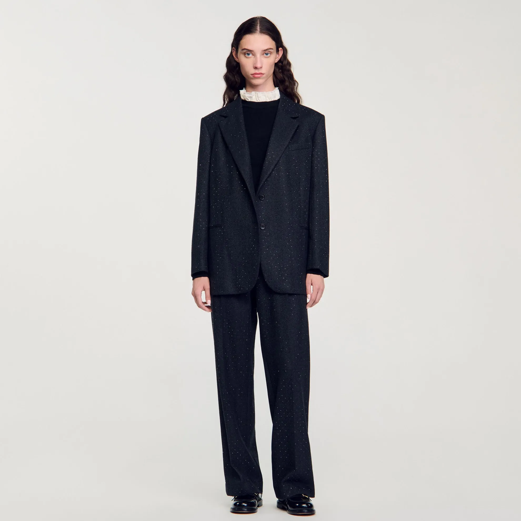 Ruimvallend colbert met visgraatmotief volledig versierd met stras, uitgevoerd met lange mouwen, paspelzakken en een split aan de achterkant.