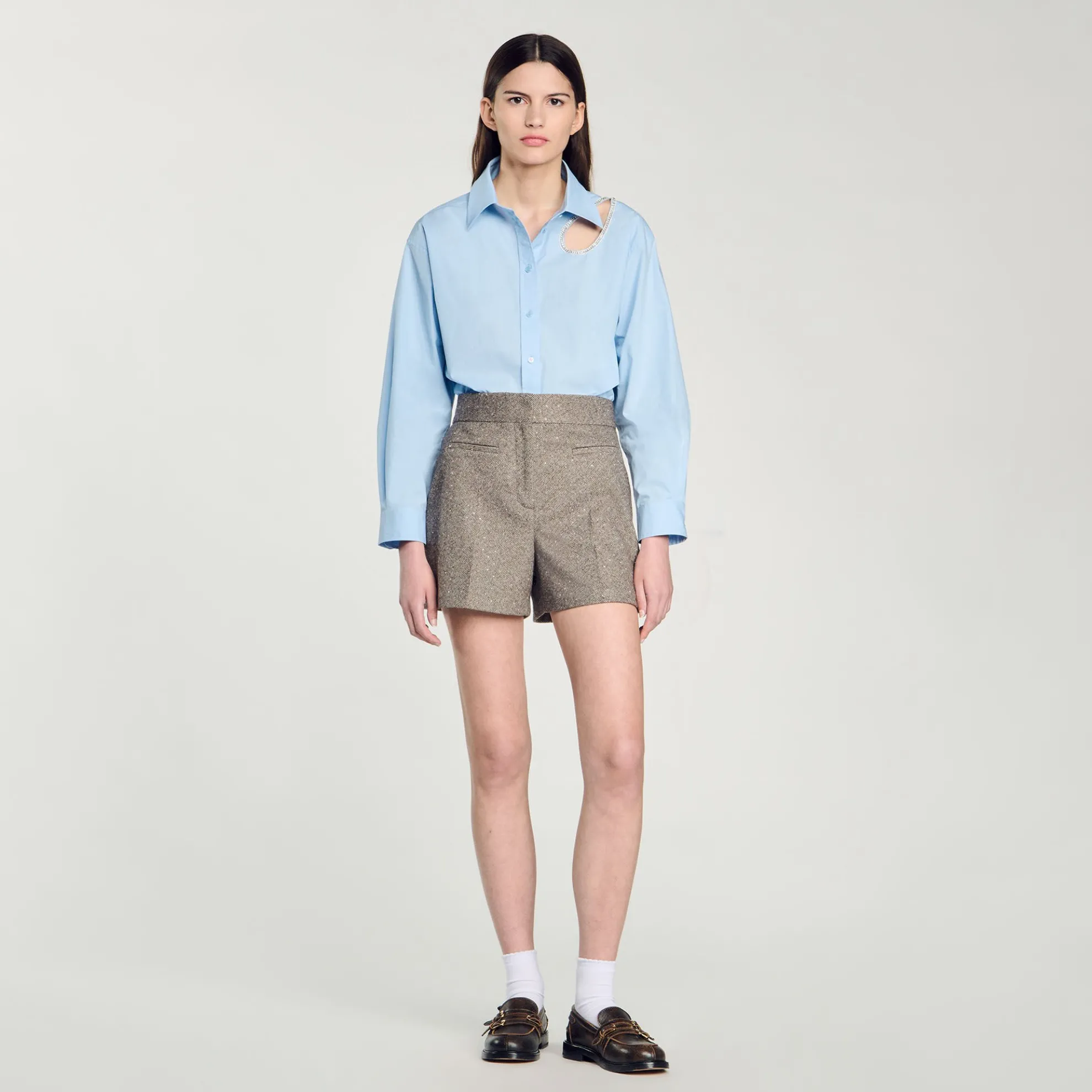Short à motifs chevrons orné de studs muni de fausses poches passepoilées à la taille et d’une fermeture.
