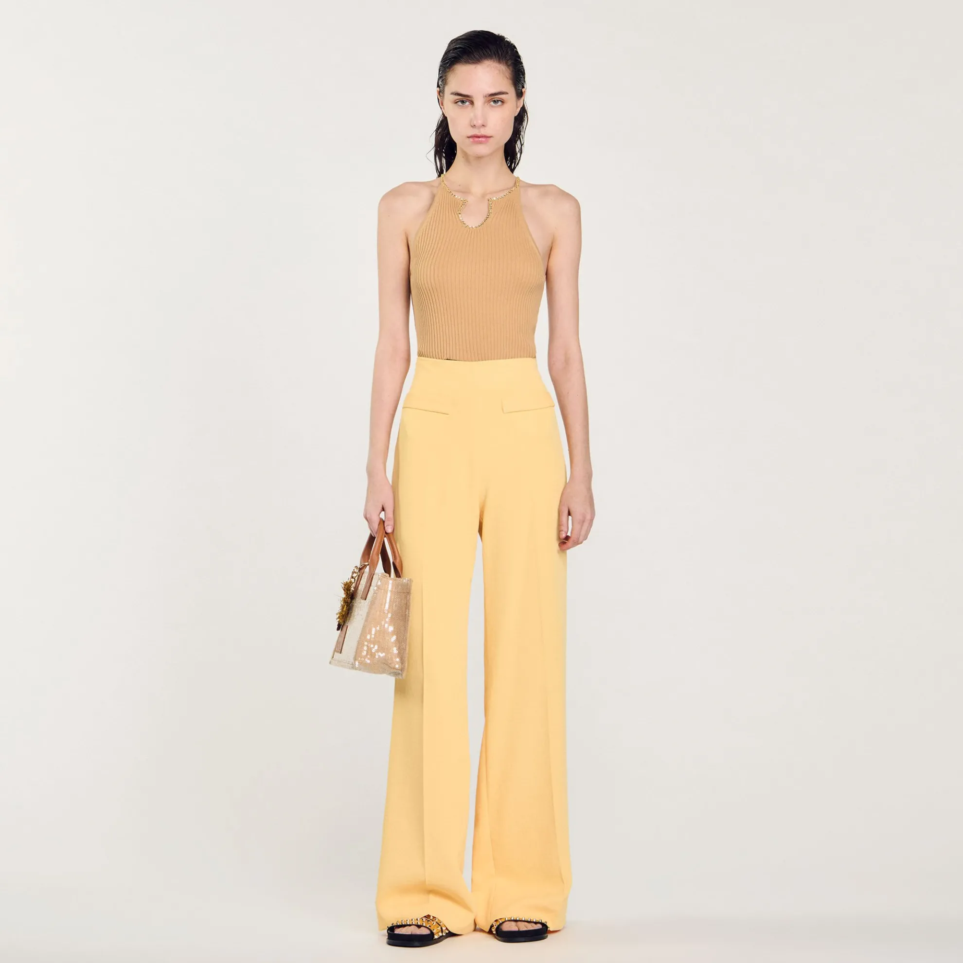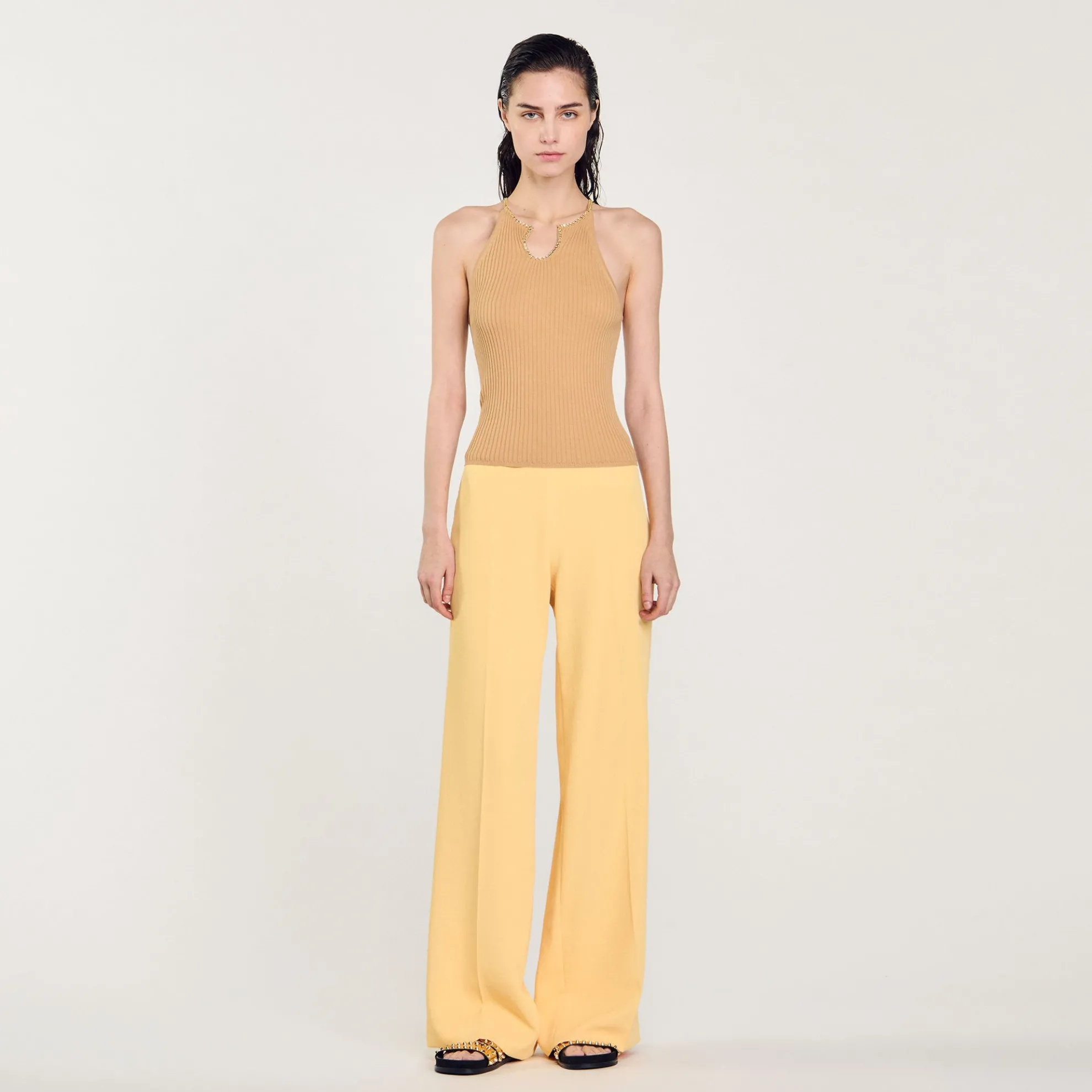 Mouwloos ribgebreid spencer vest met een kraag versierd met strassteentjes in druppelvorm.