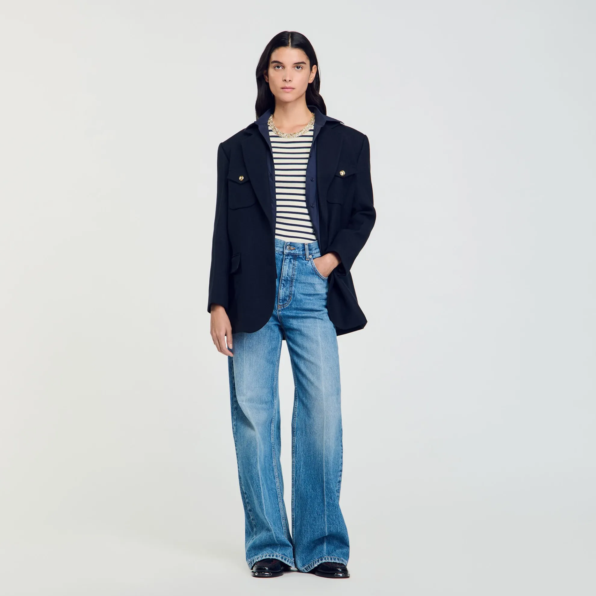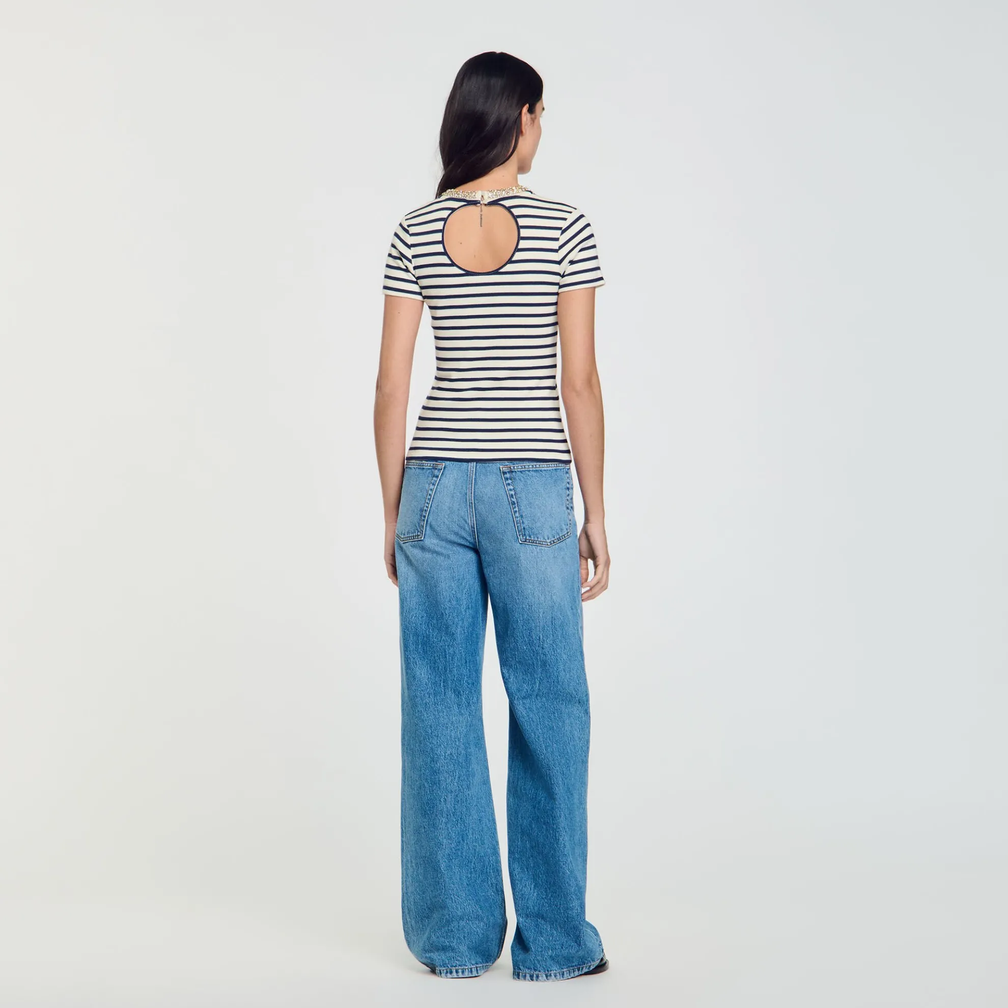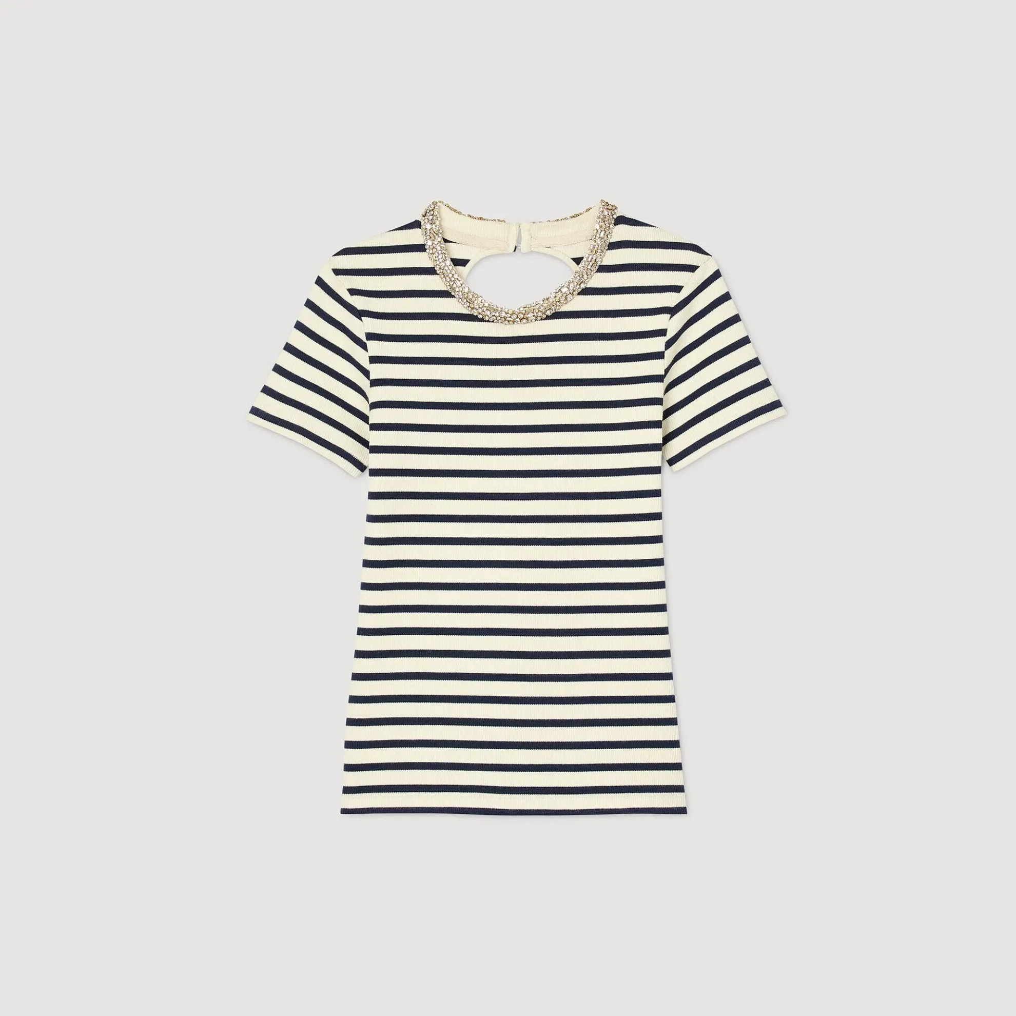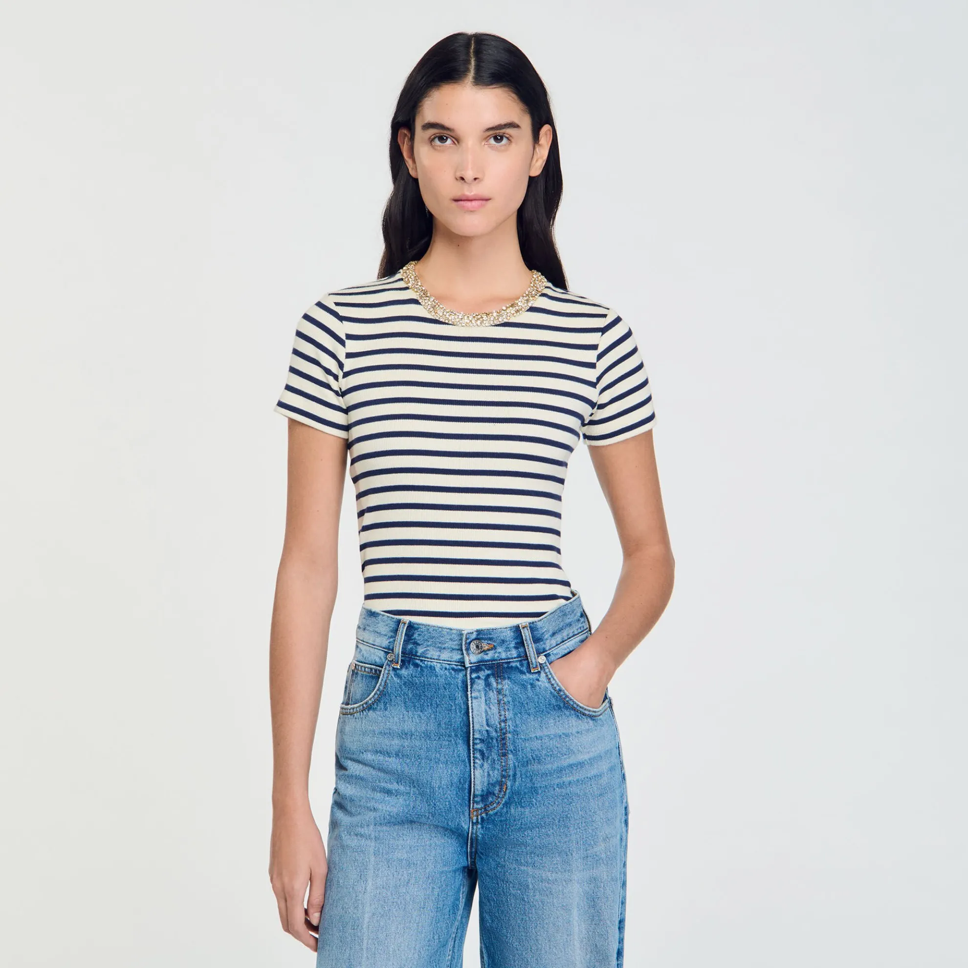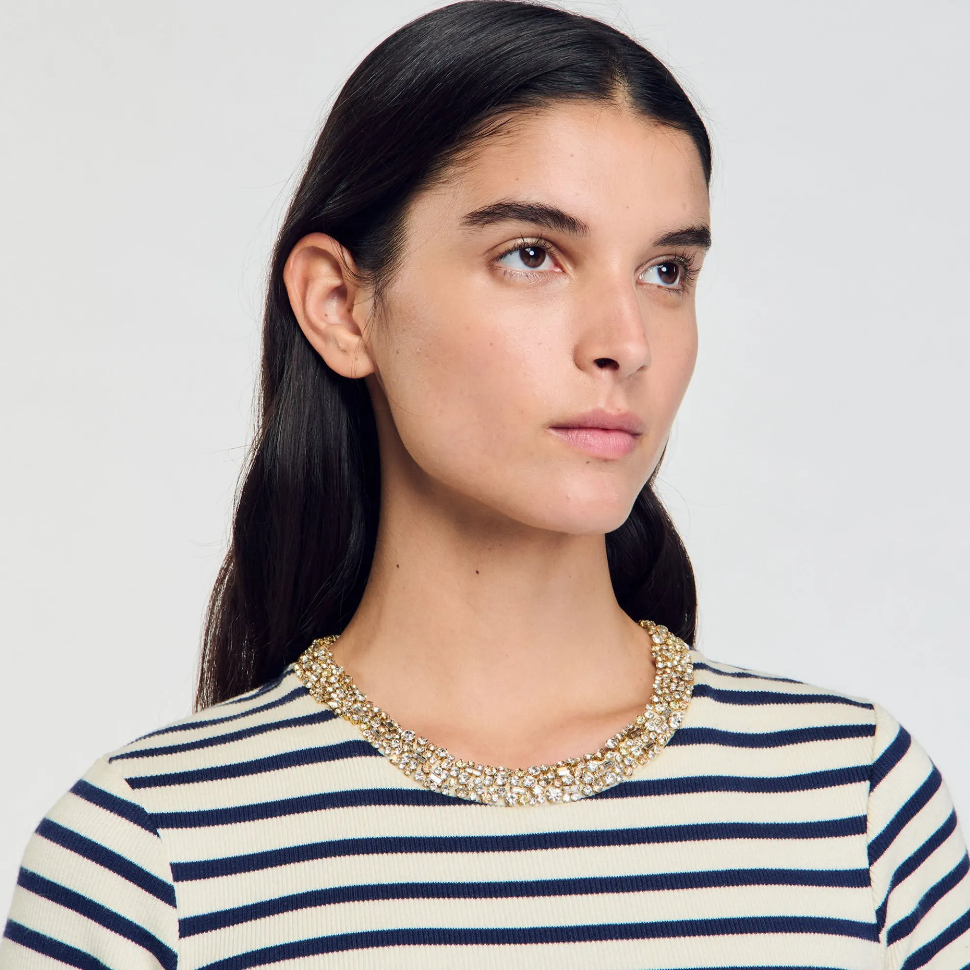 Gestreept T-shirt met korte mouwen en ronde hals versierd met stras.