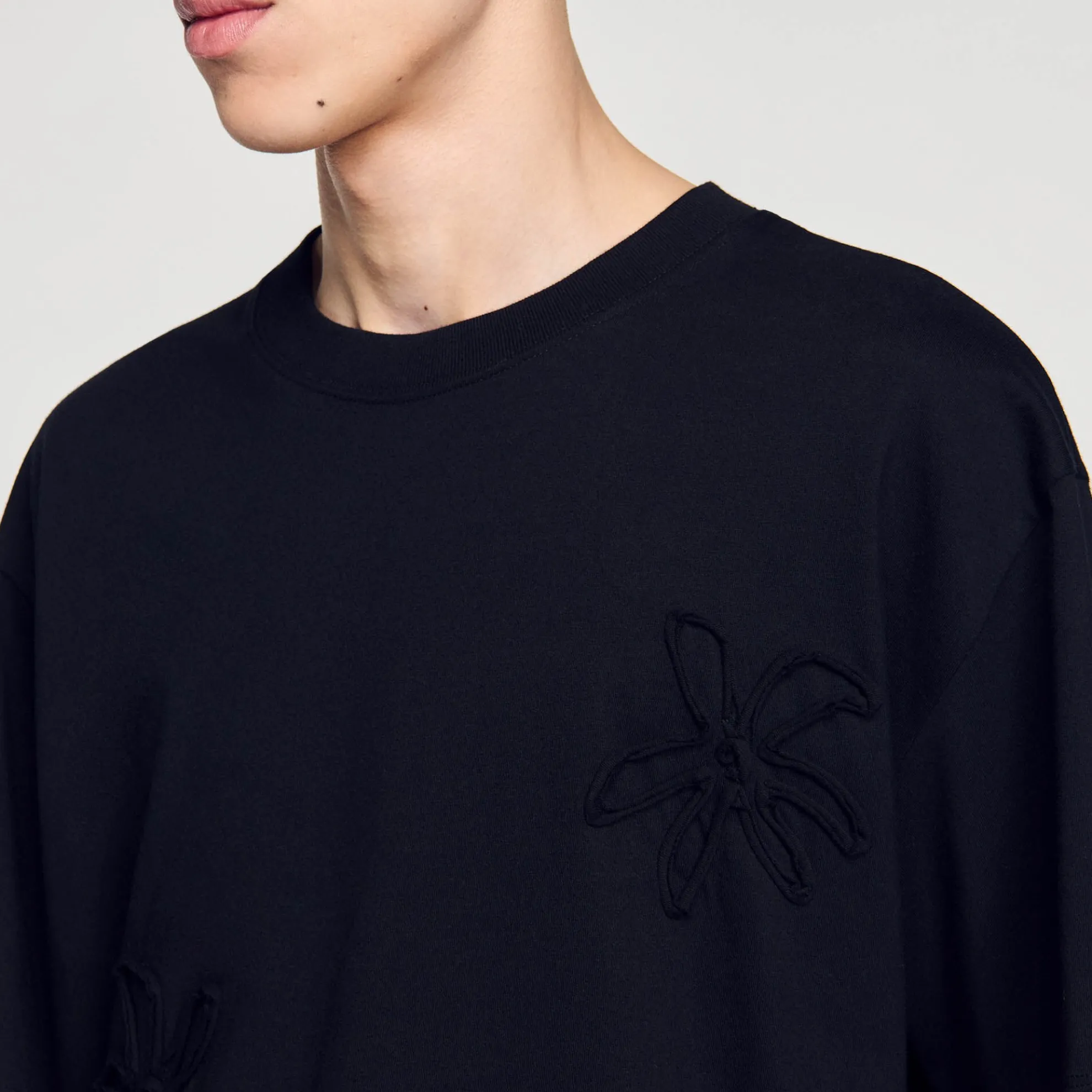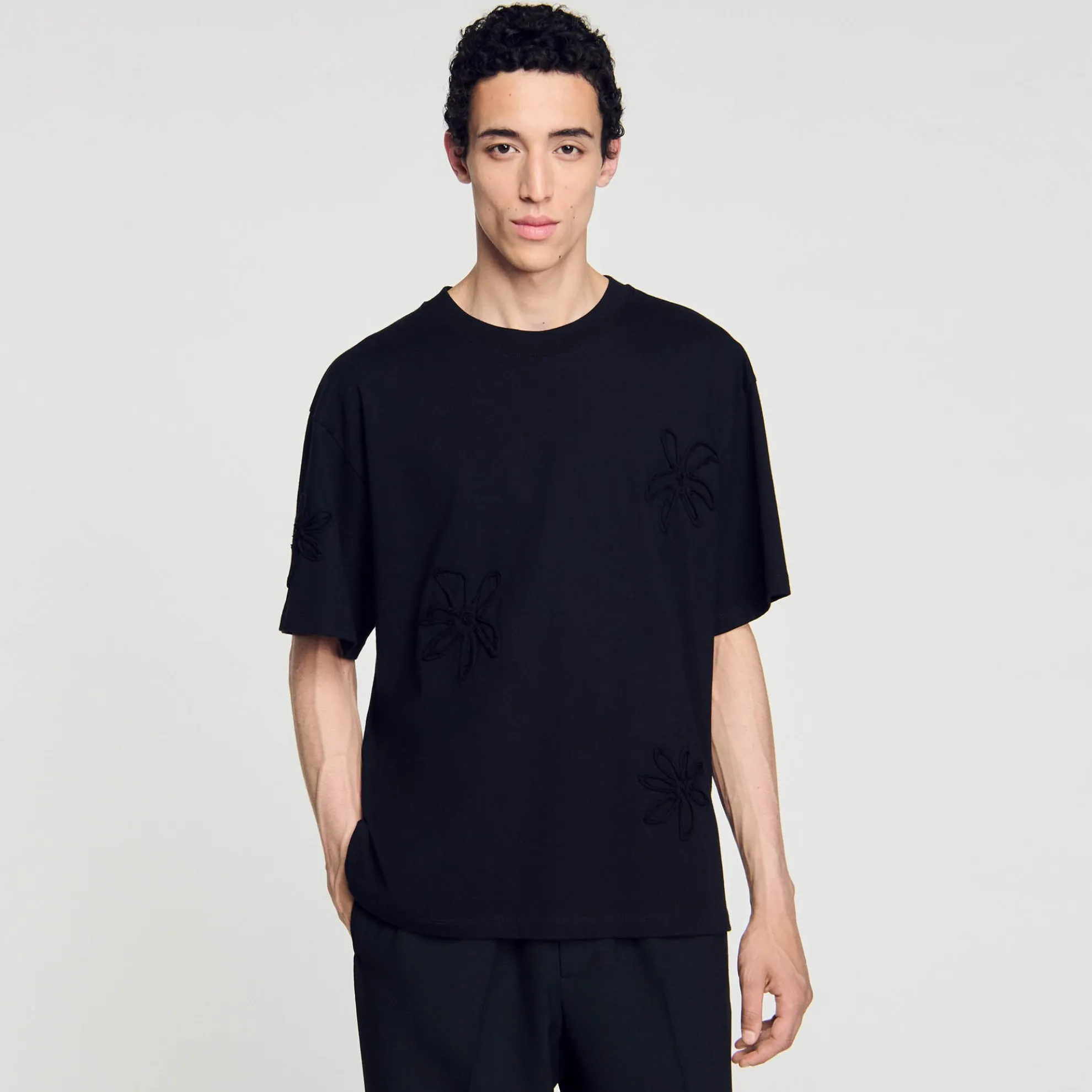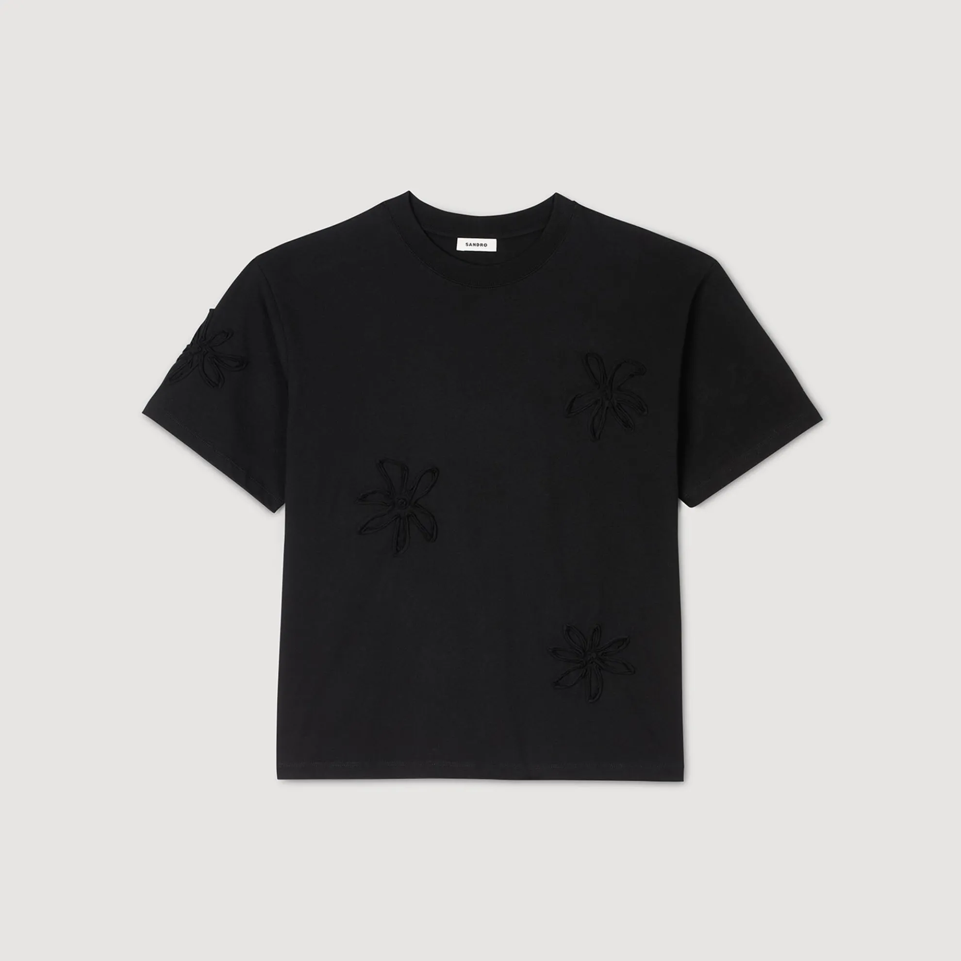 Katoenen T-shirt met ronde hals, korte mouwen en biais met ton-sur-ton bloemmotief.