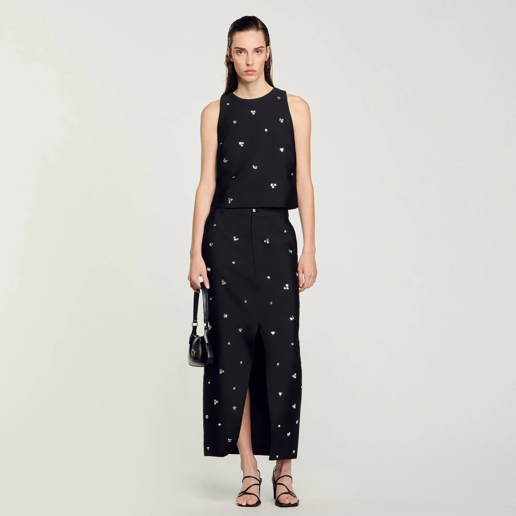 Mouwloze korte top van mix van zijde met ronde hals en all-over stras.