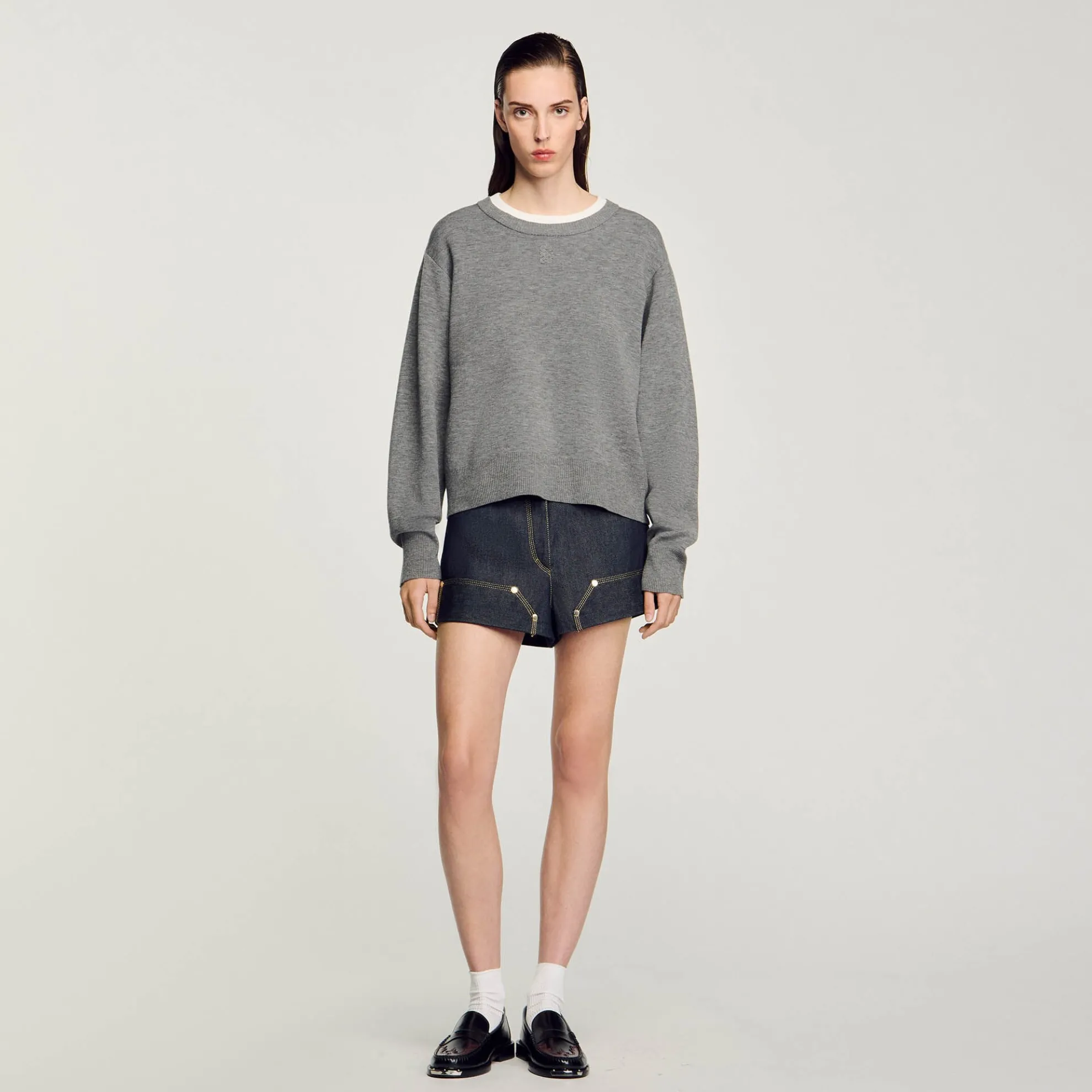 Gebreide trui met lange mouwen en een ronde hals versierd met een contrasterende trompe l’oeil band.