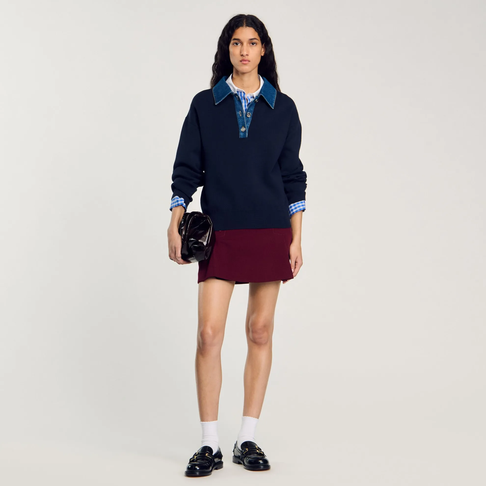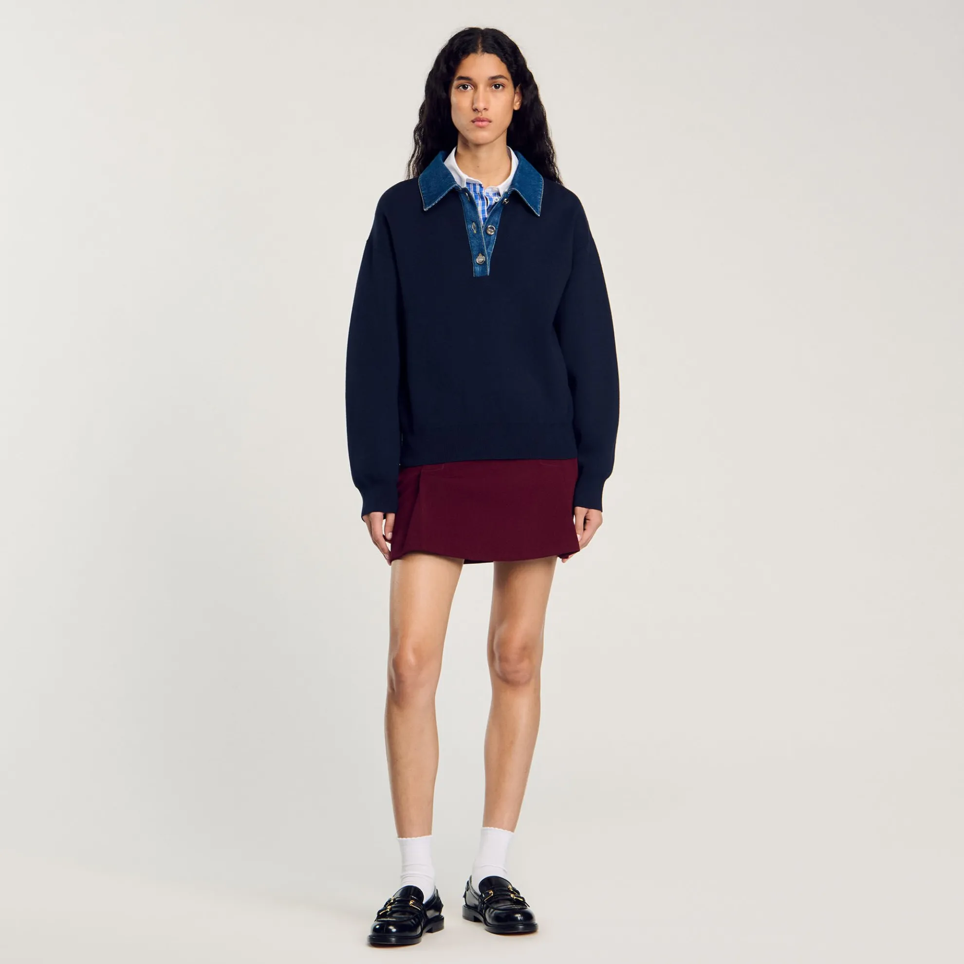 Tricot trui met polokraag van spijkerstof met knoopjes, lange mouwen met strakke manchetten.