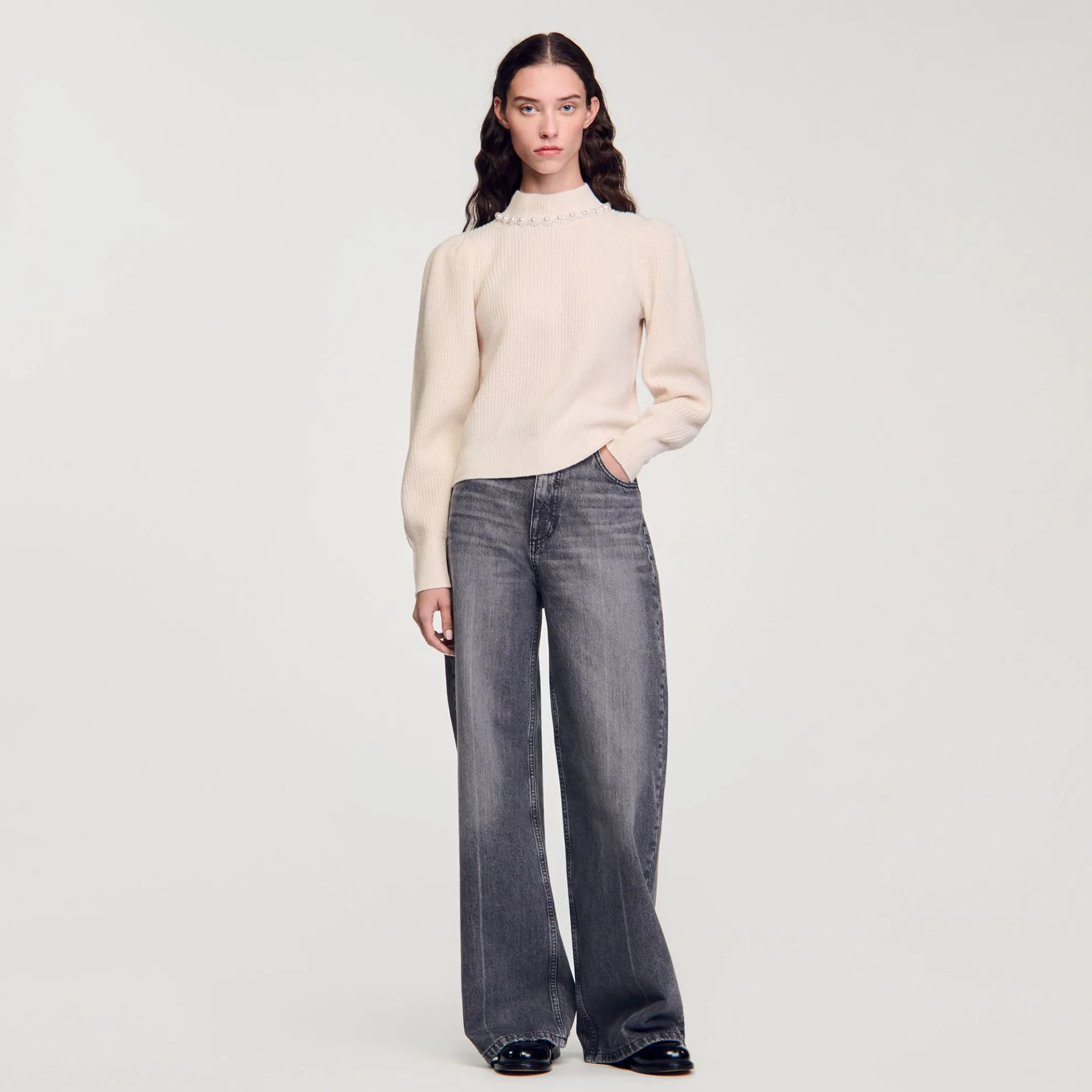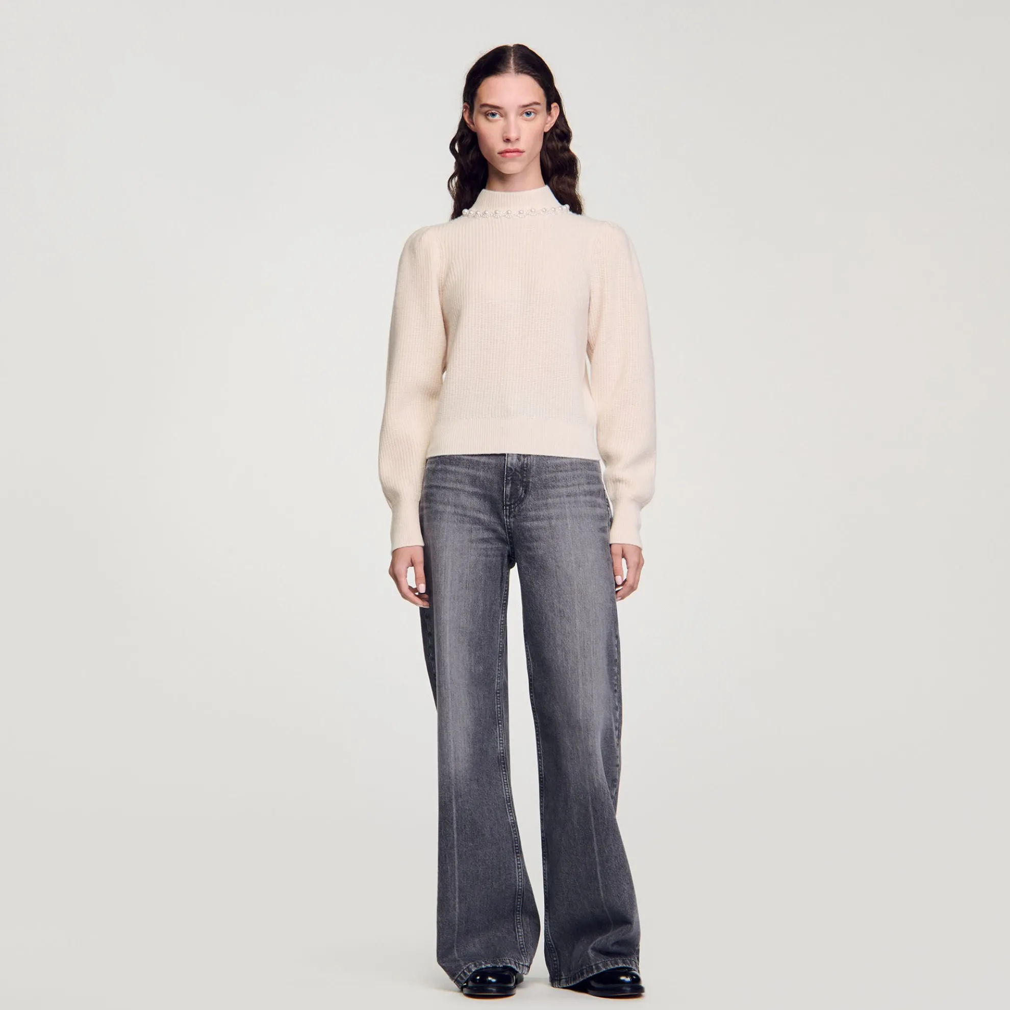 Gebreide trui met wol en kasjmier voorzien van lange ruime mouwen, een hoge kraag versierd met contrasterende parels.