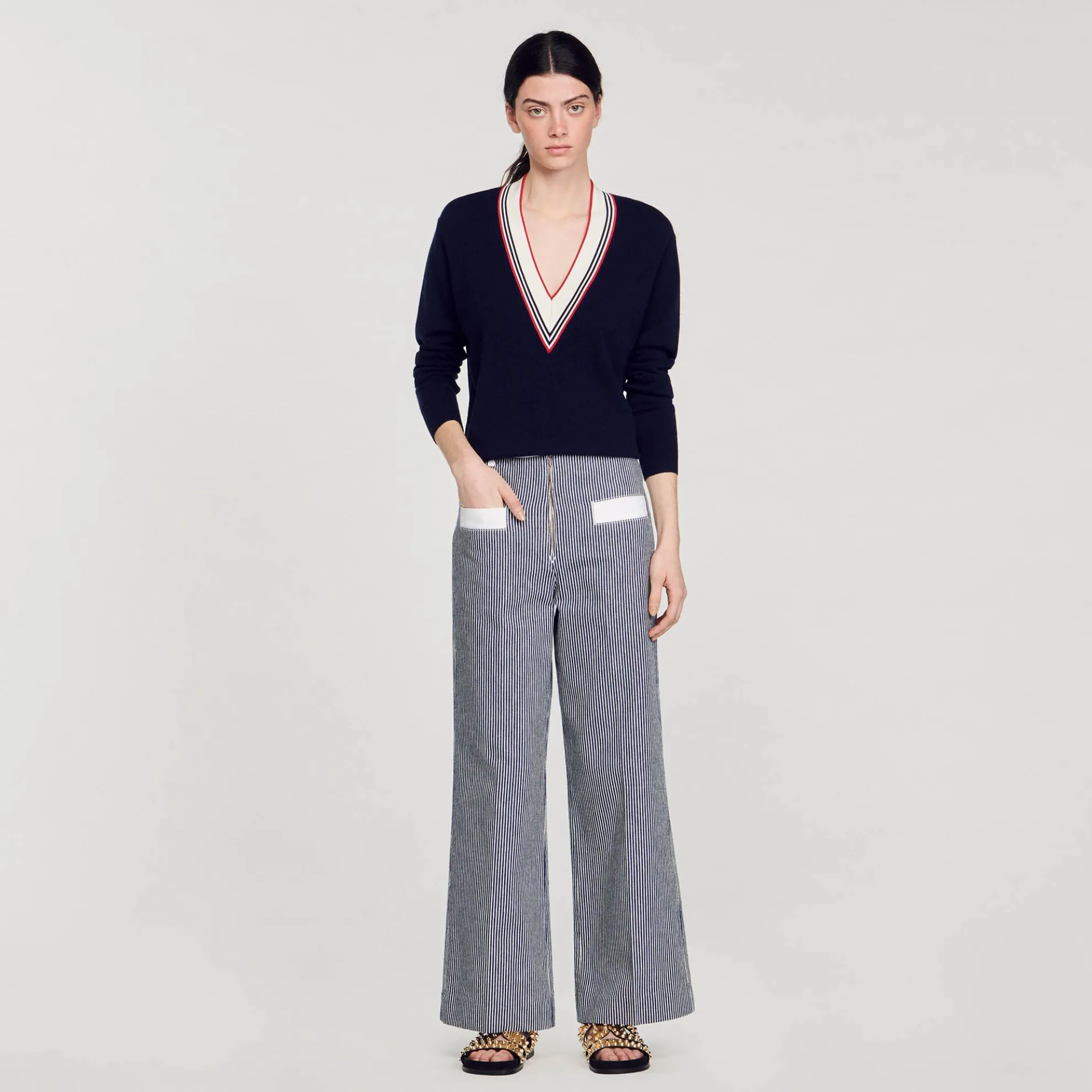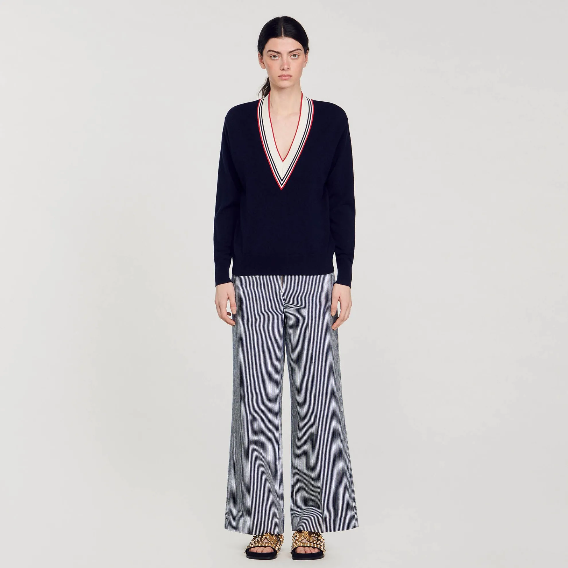 Trui van wol en kasjmier met gestreepte V-hals en lange mouwen versierd met strepen bij de halslijn.
