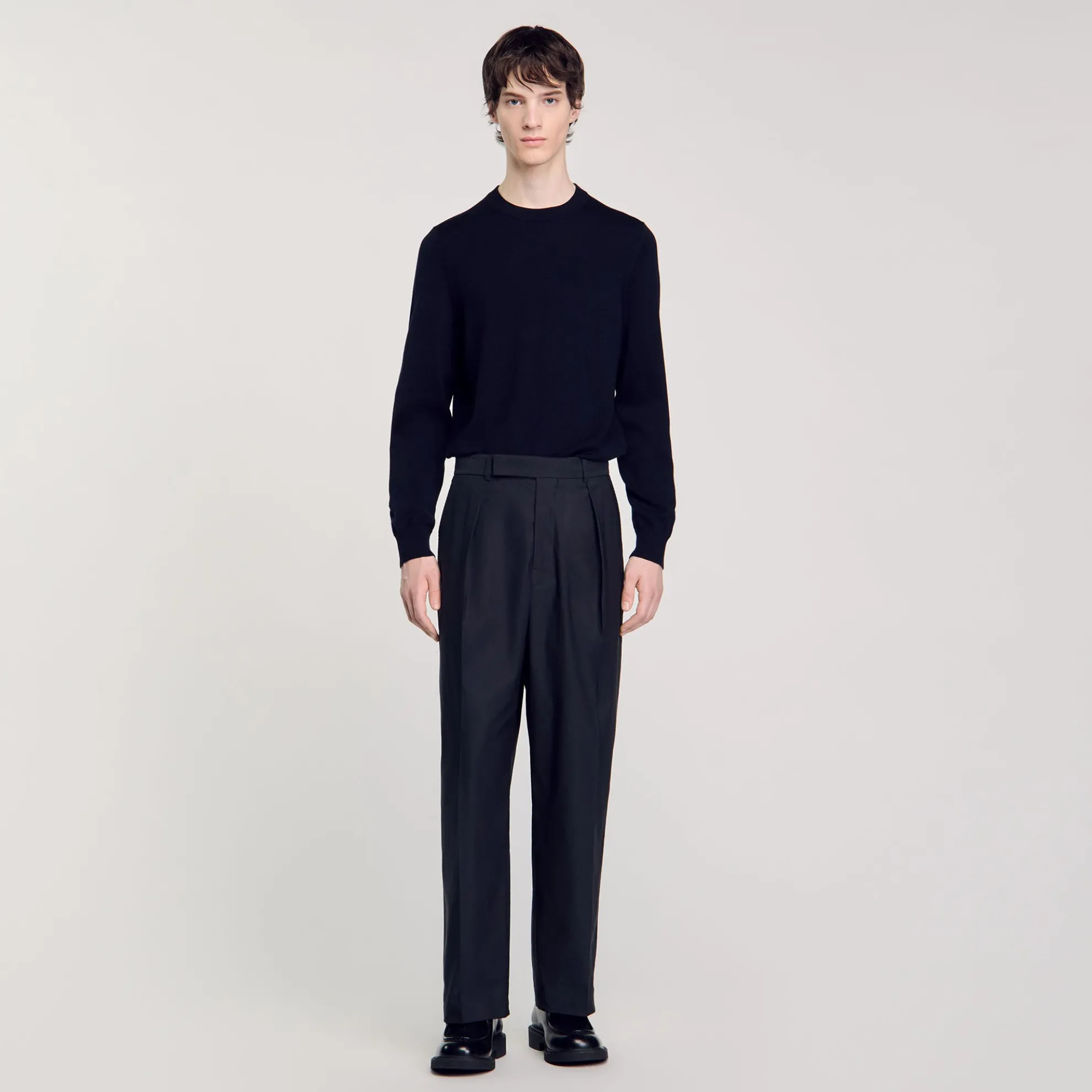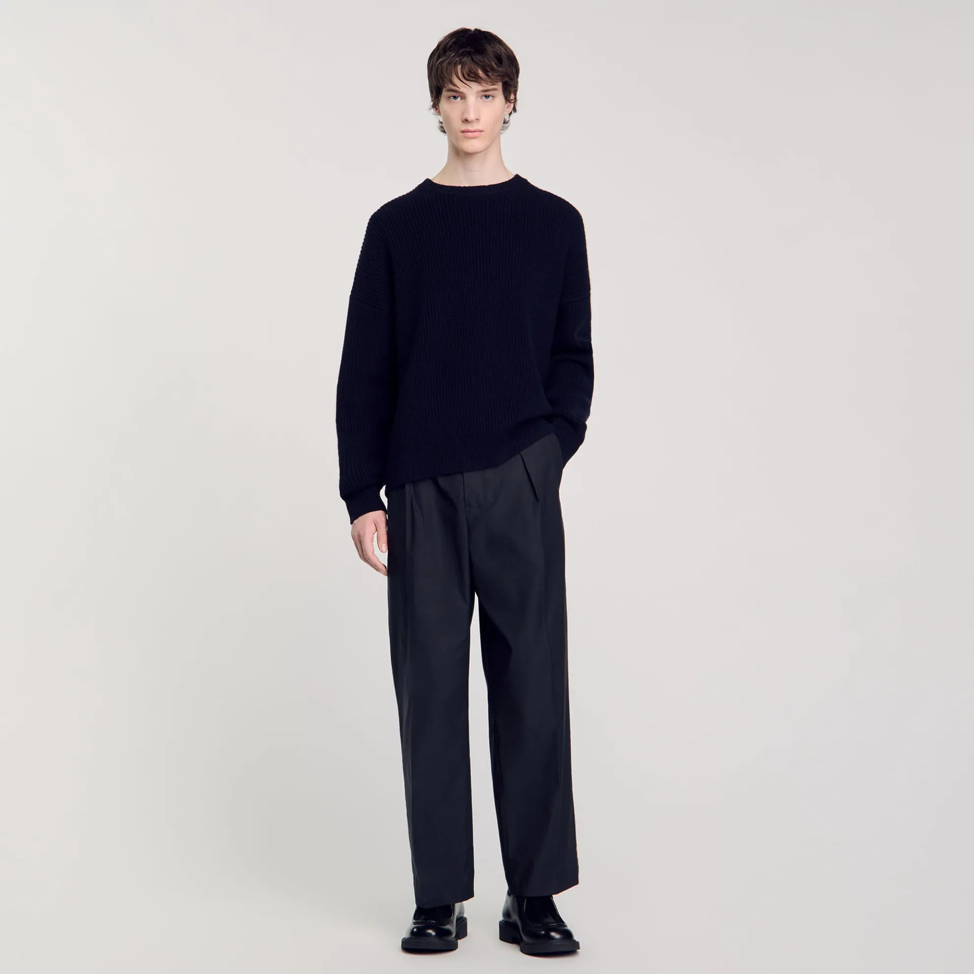 Wijde wollen brok met diepe plooien, riemlussen en zakken aan de voor- en achterkant.