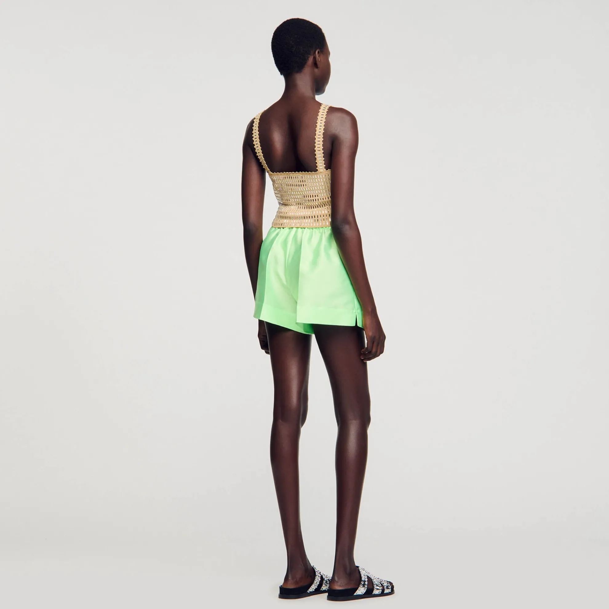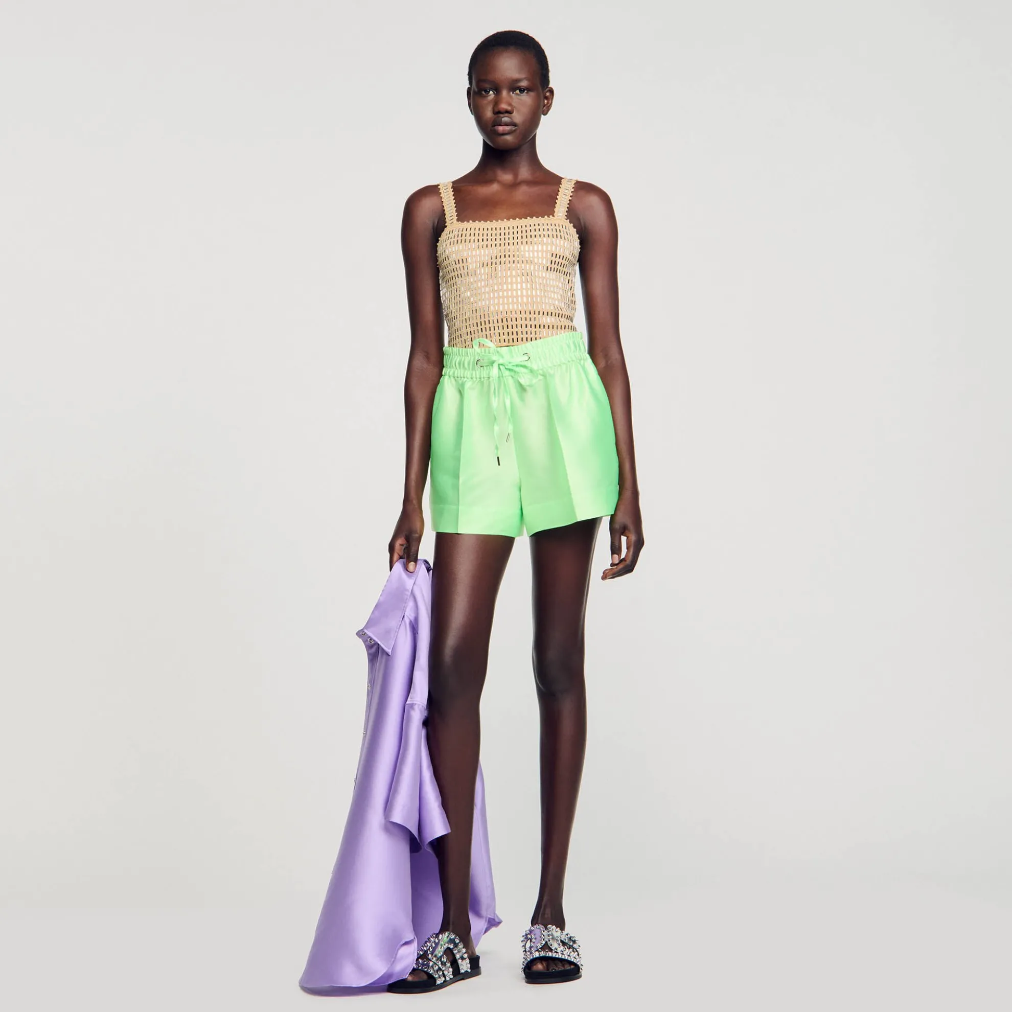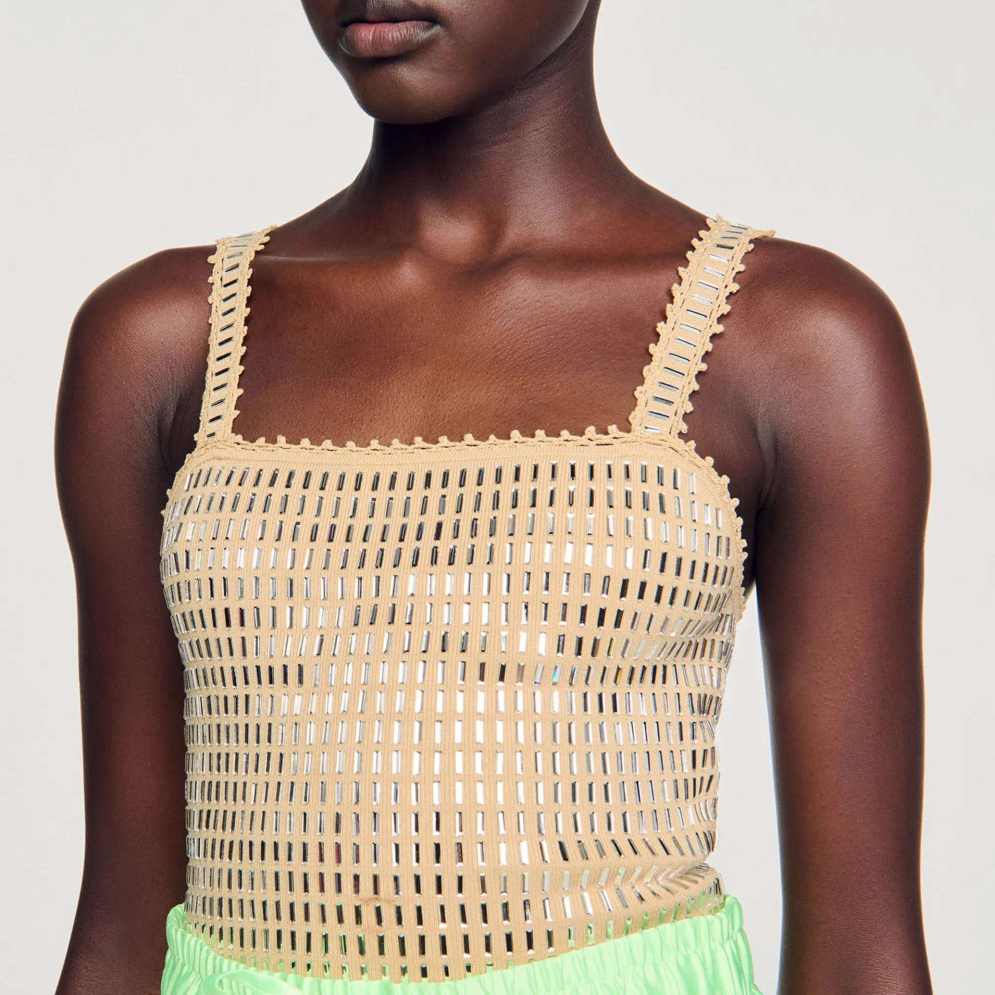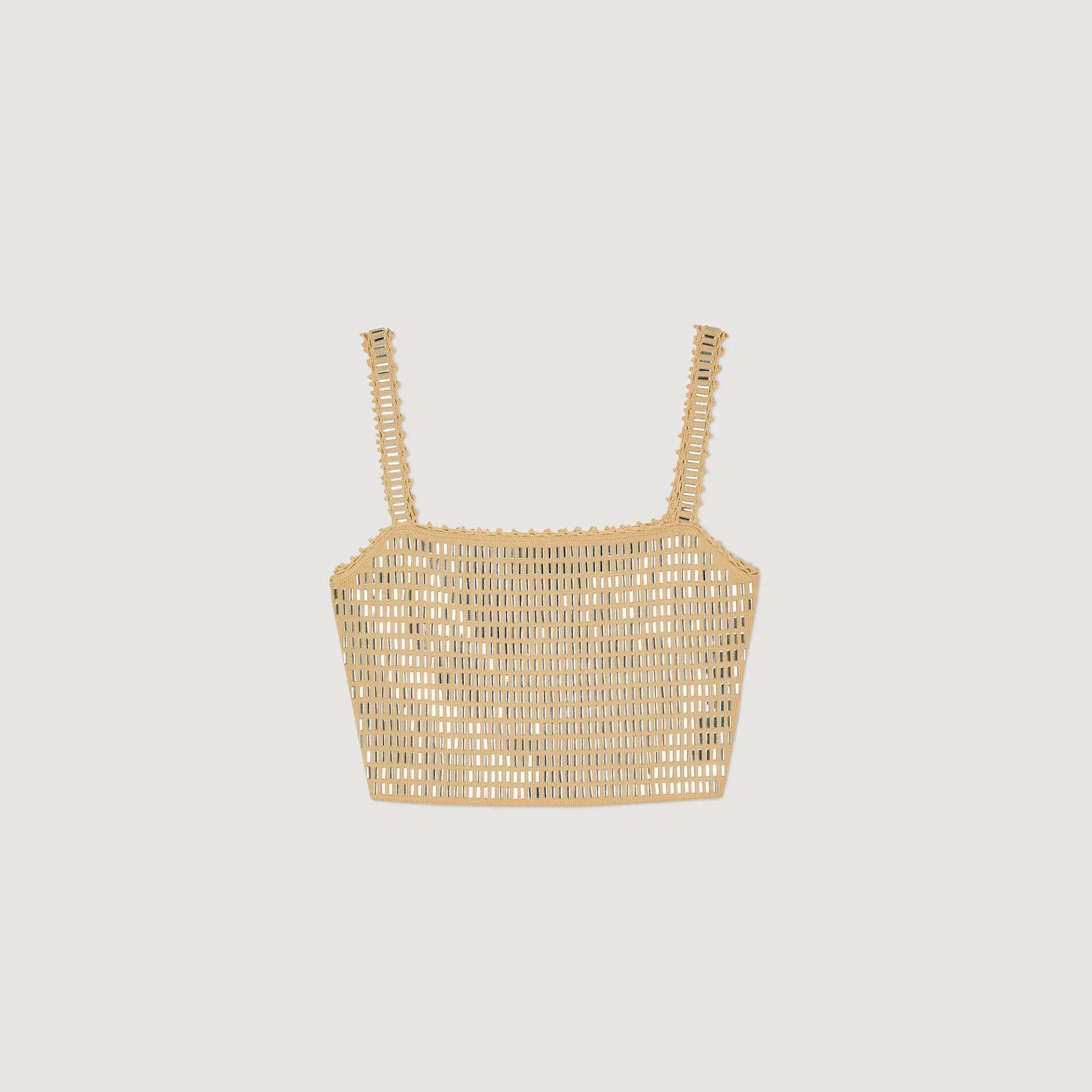 Korte gebreide brassière met all-over stras, een rechte halslijn en schouderbandjes.