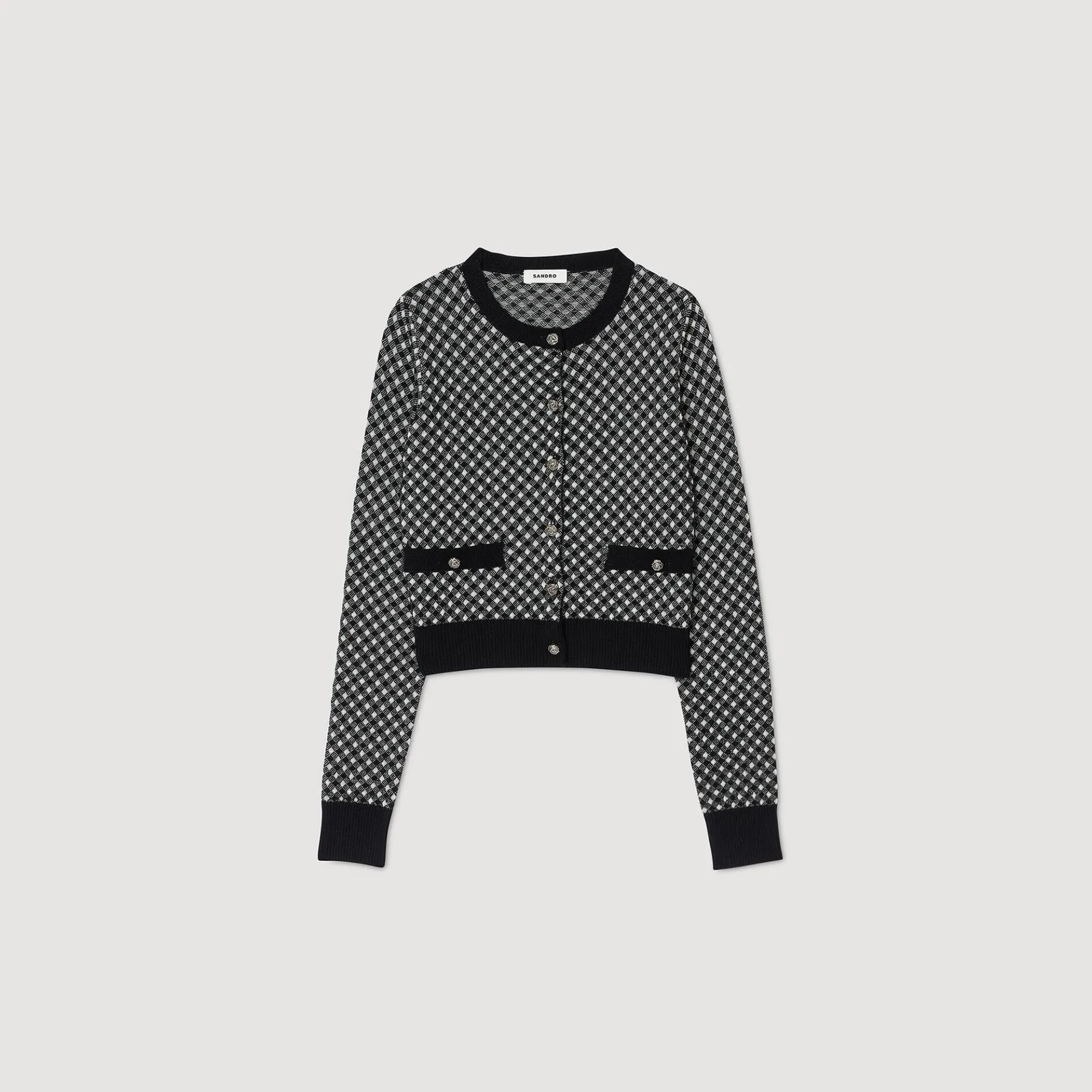 Tweekleurig geruit jacquard gebreid cardigan vest met ronde hals, lange mouwen, knoopsluiting en contrasterende details.