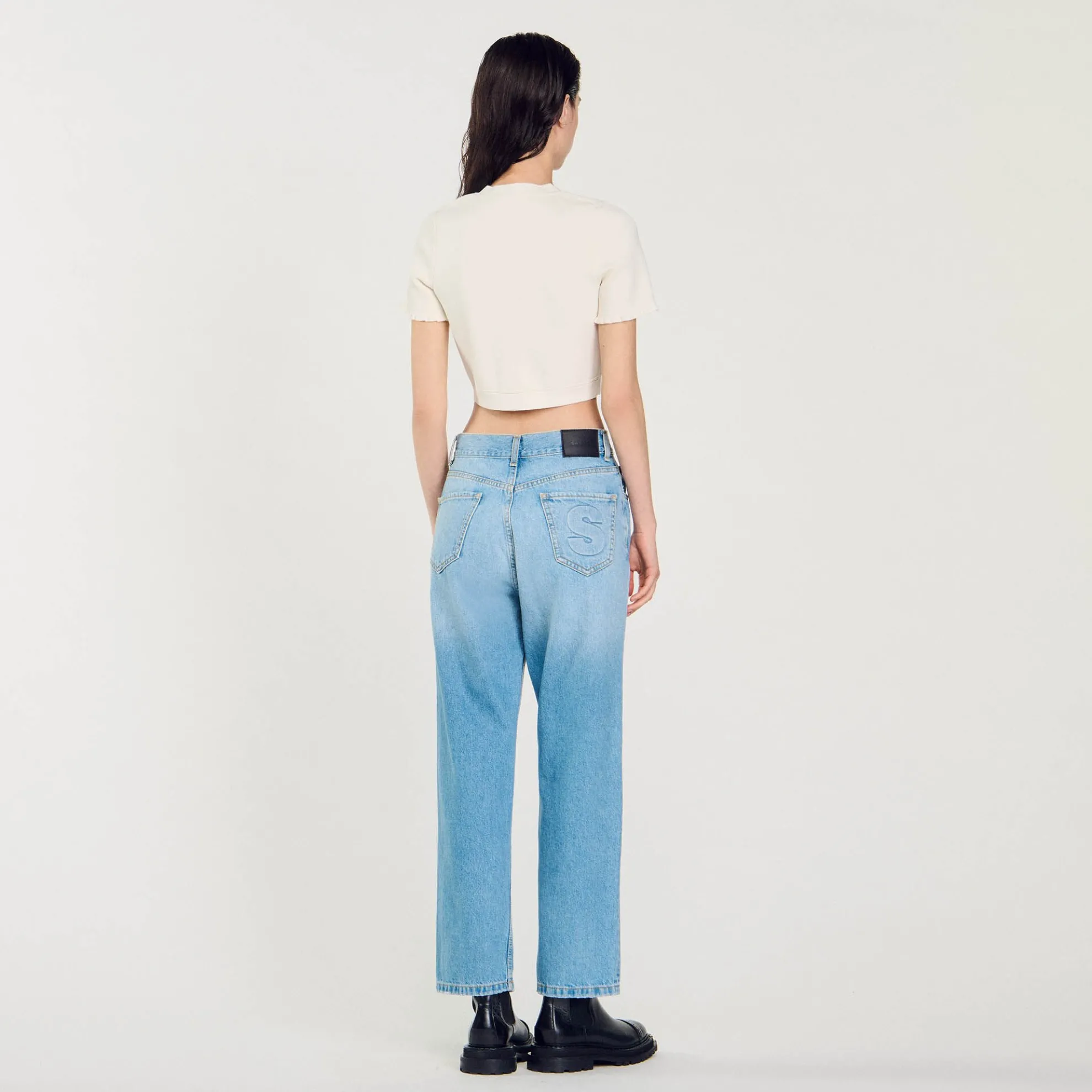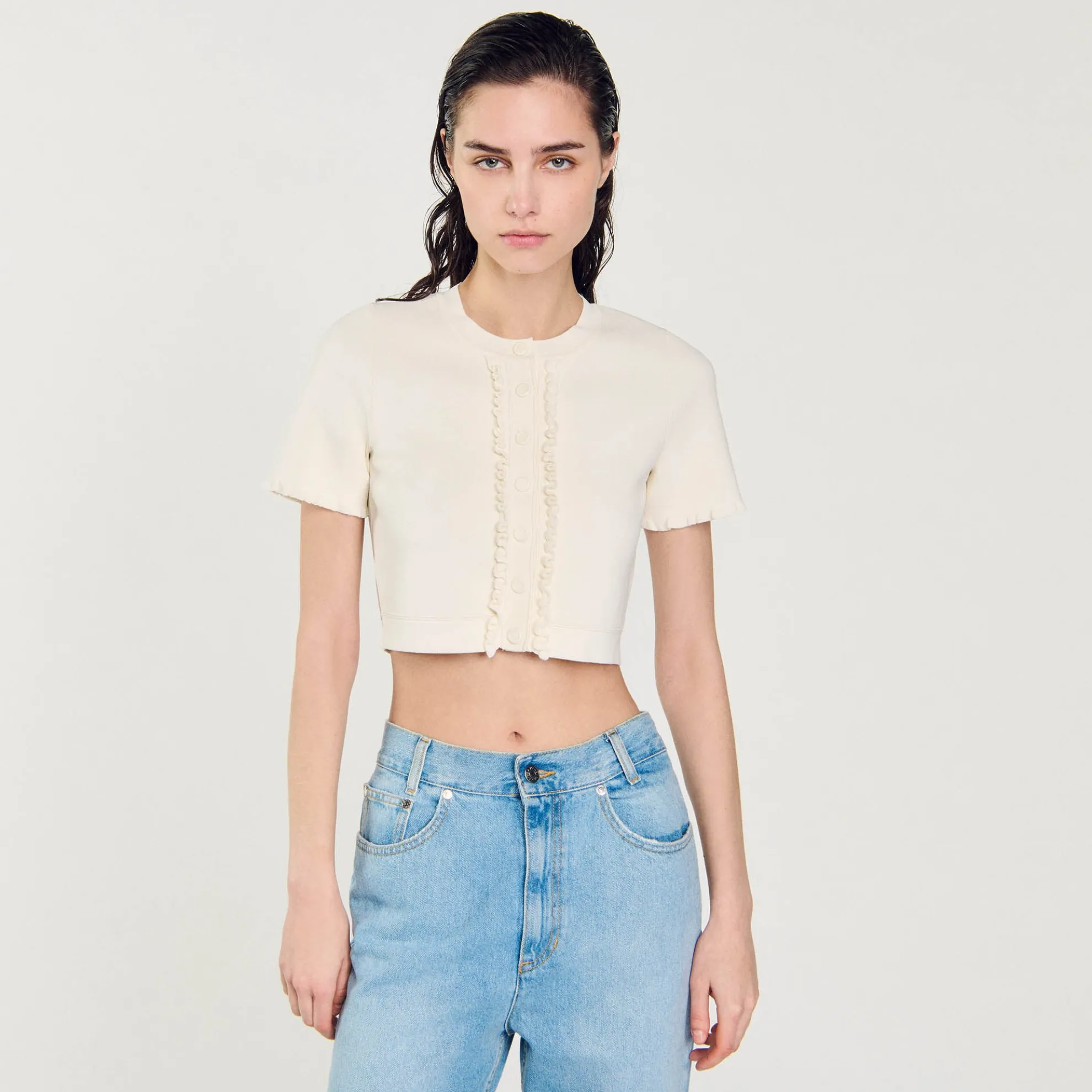 Fijn ribgebreid cardigan vest met korte mouwen, knoopsluiting met volants en een ronde hals.