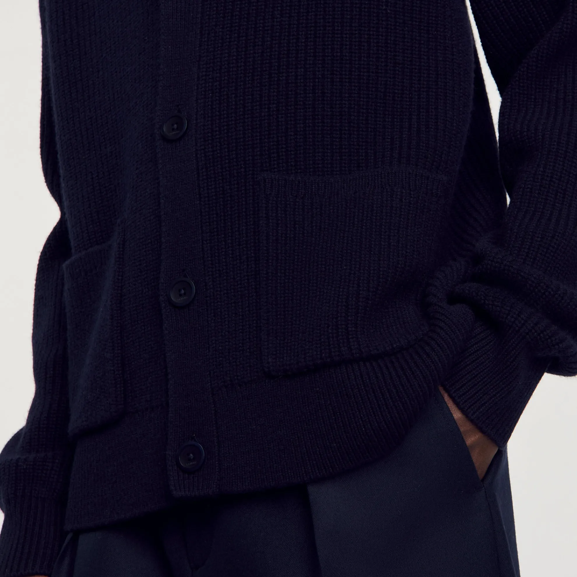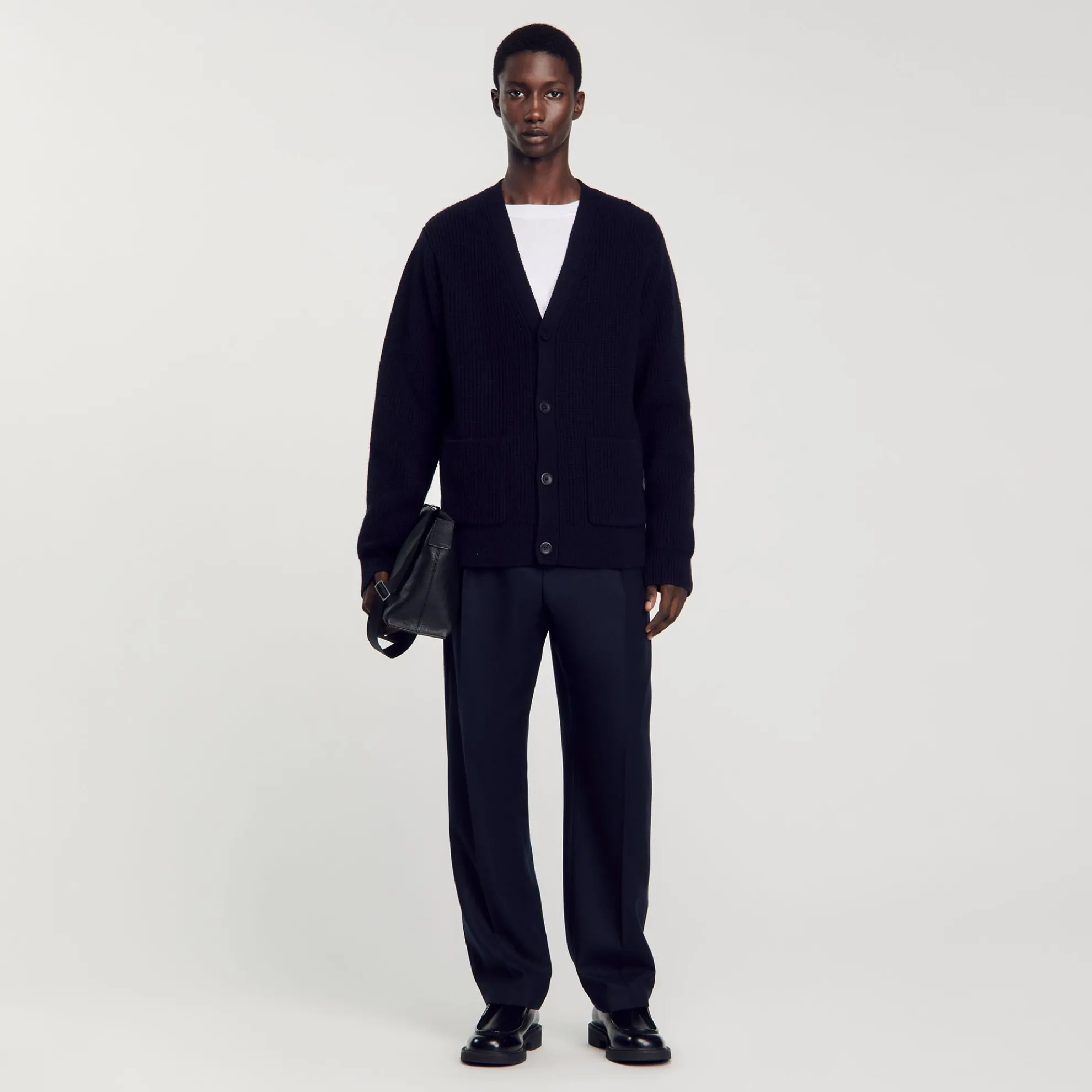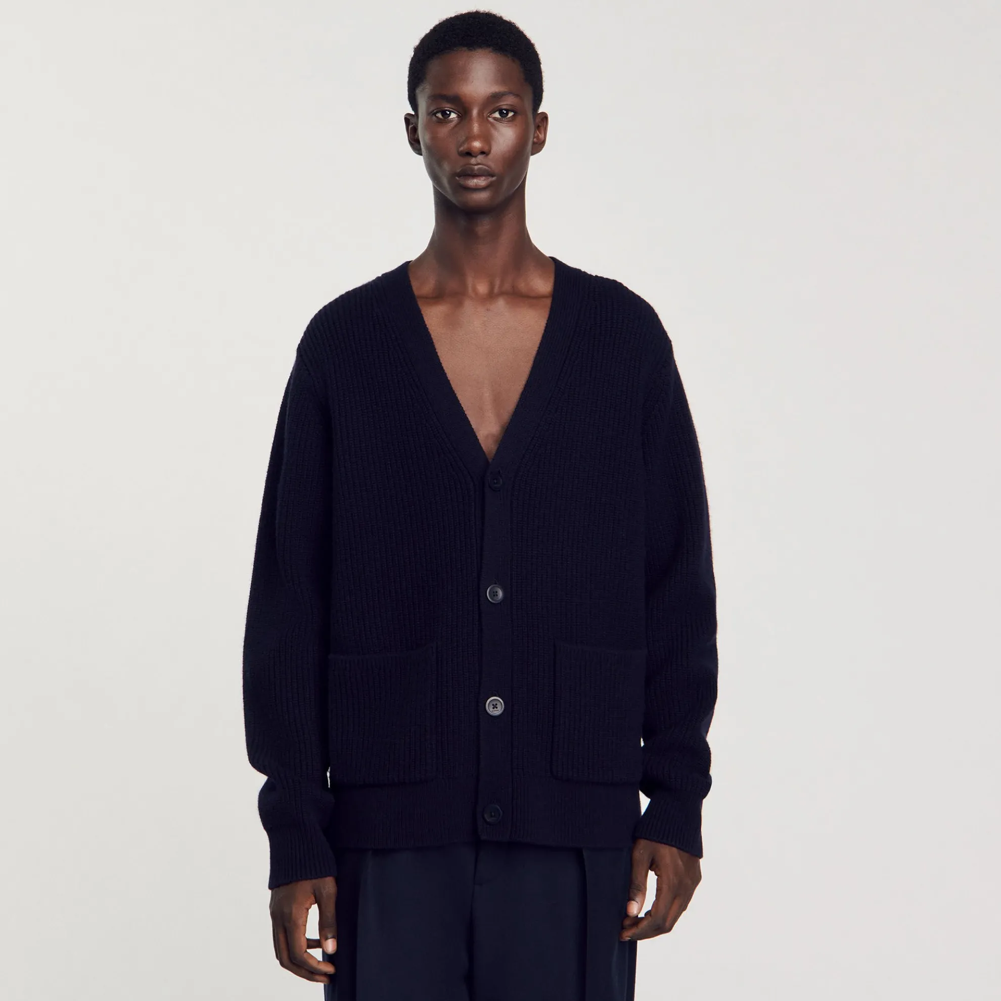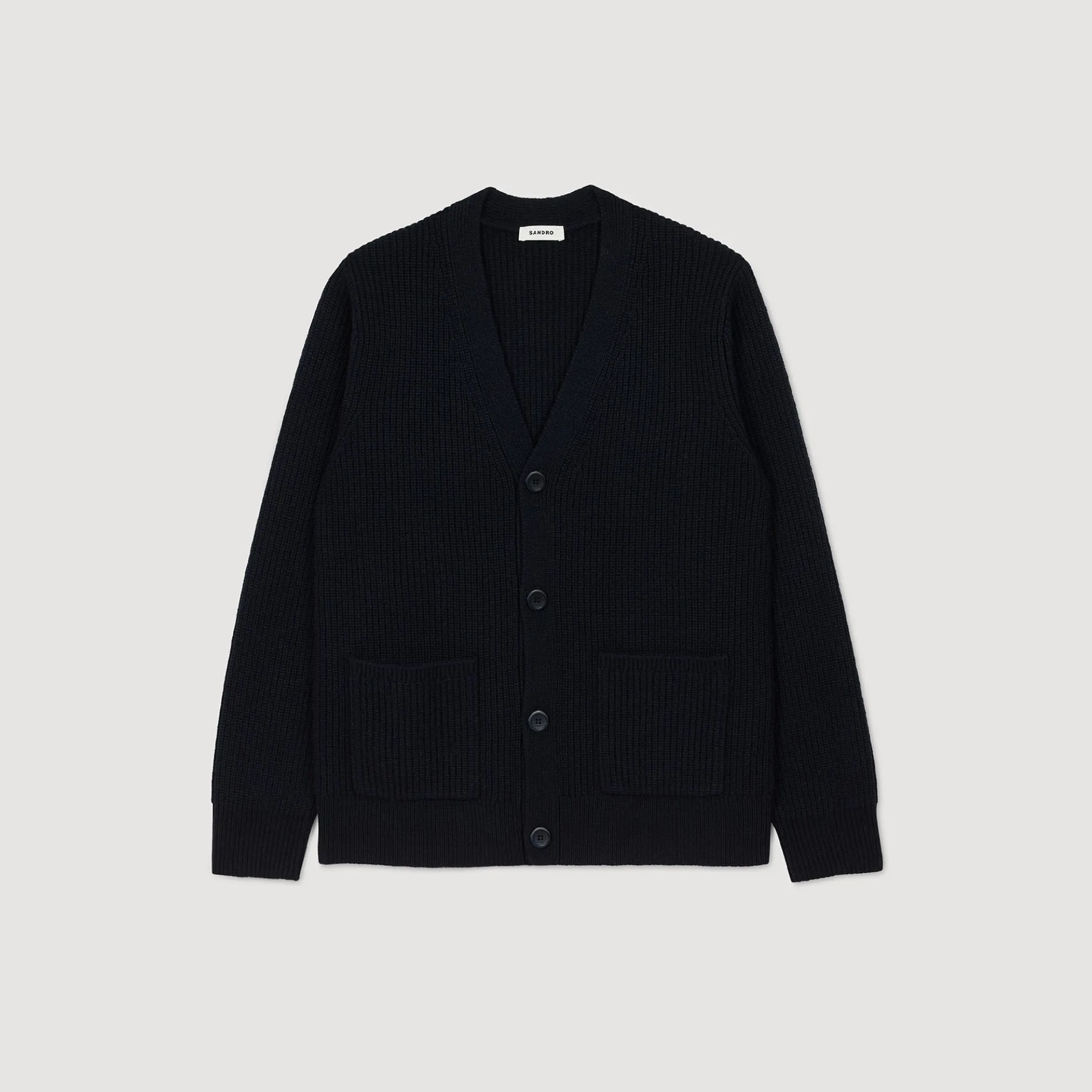 Recht cardigan vest van ribbreisel met V-hals, lange mouwen, knoopsluiting en opgestikte zakken.