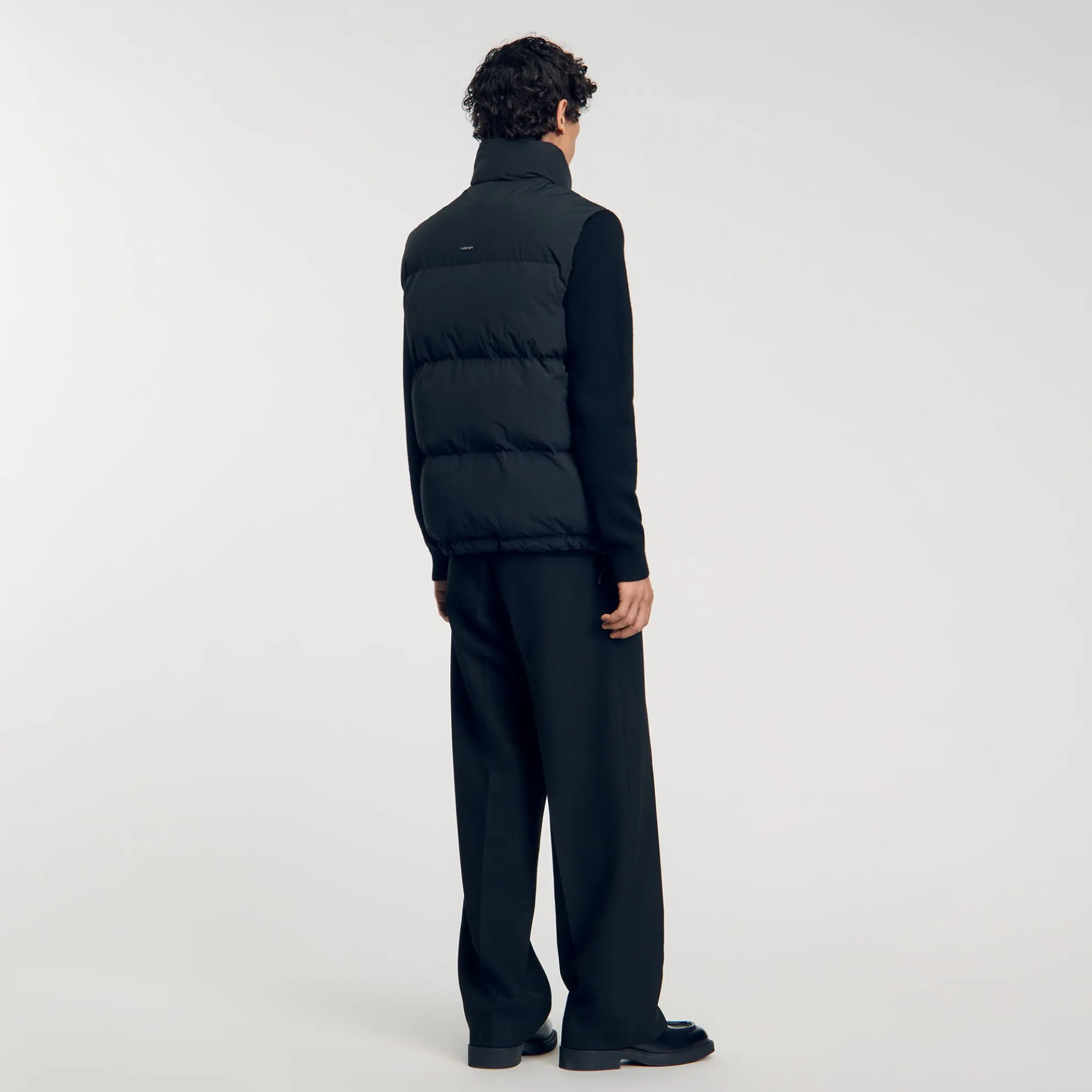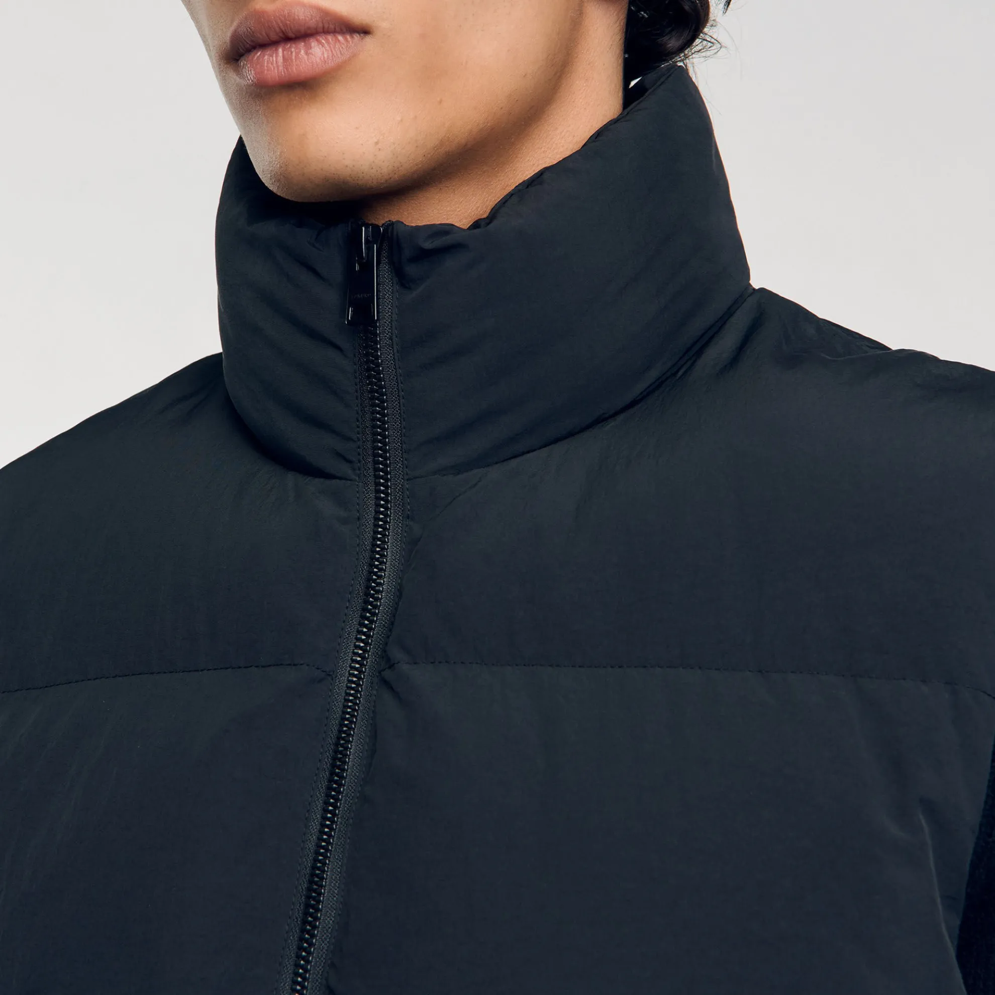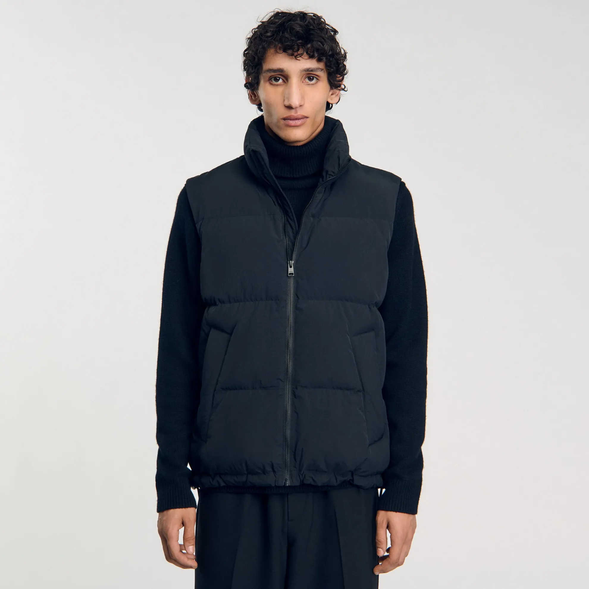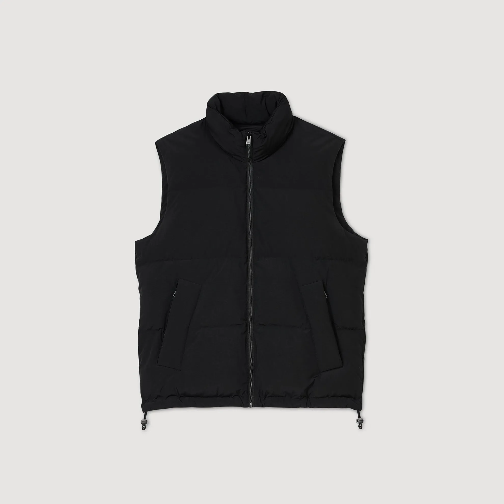 Mouwloos gewatteerd donsjack met ritssluiting, opstaande kraag en trekkoorden aan de onderkant.