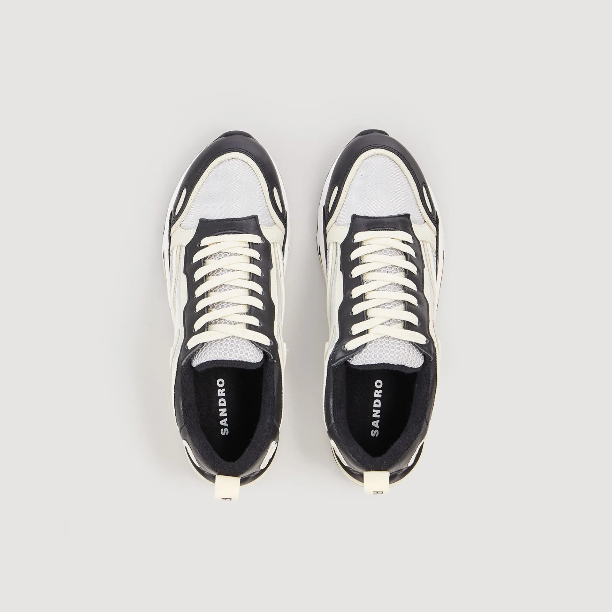 Flame-sneakers van verschillende materialen met veters en logo op de zolen.