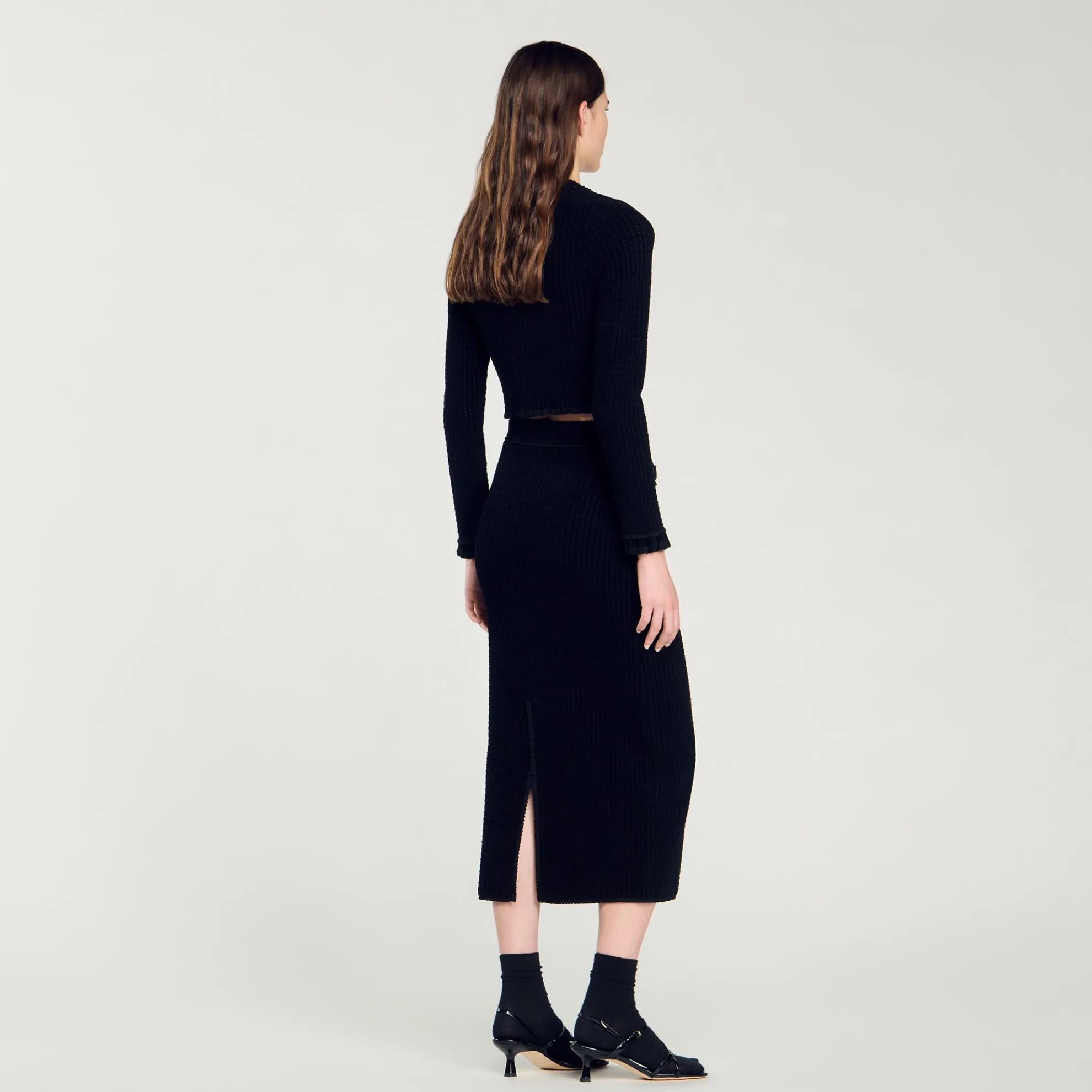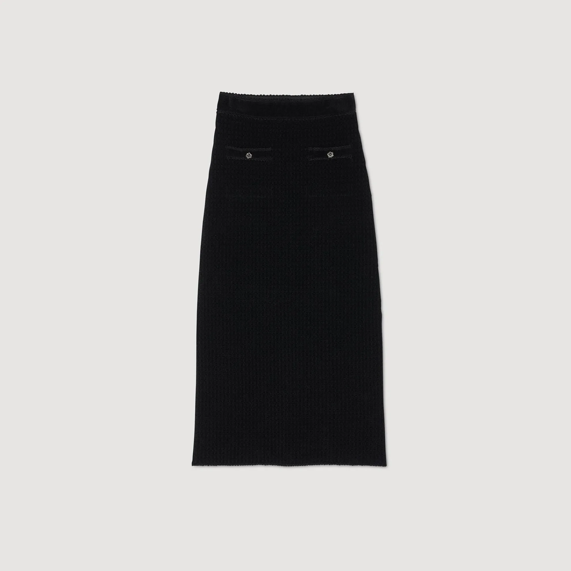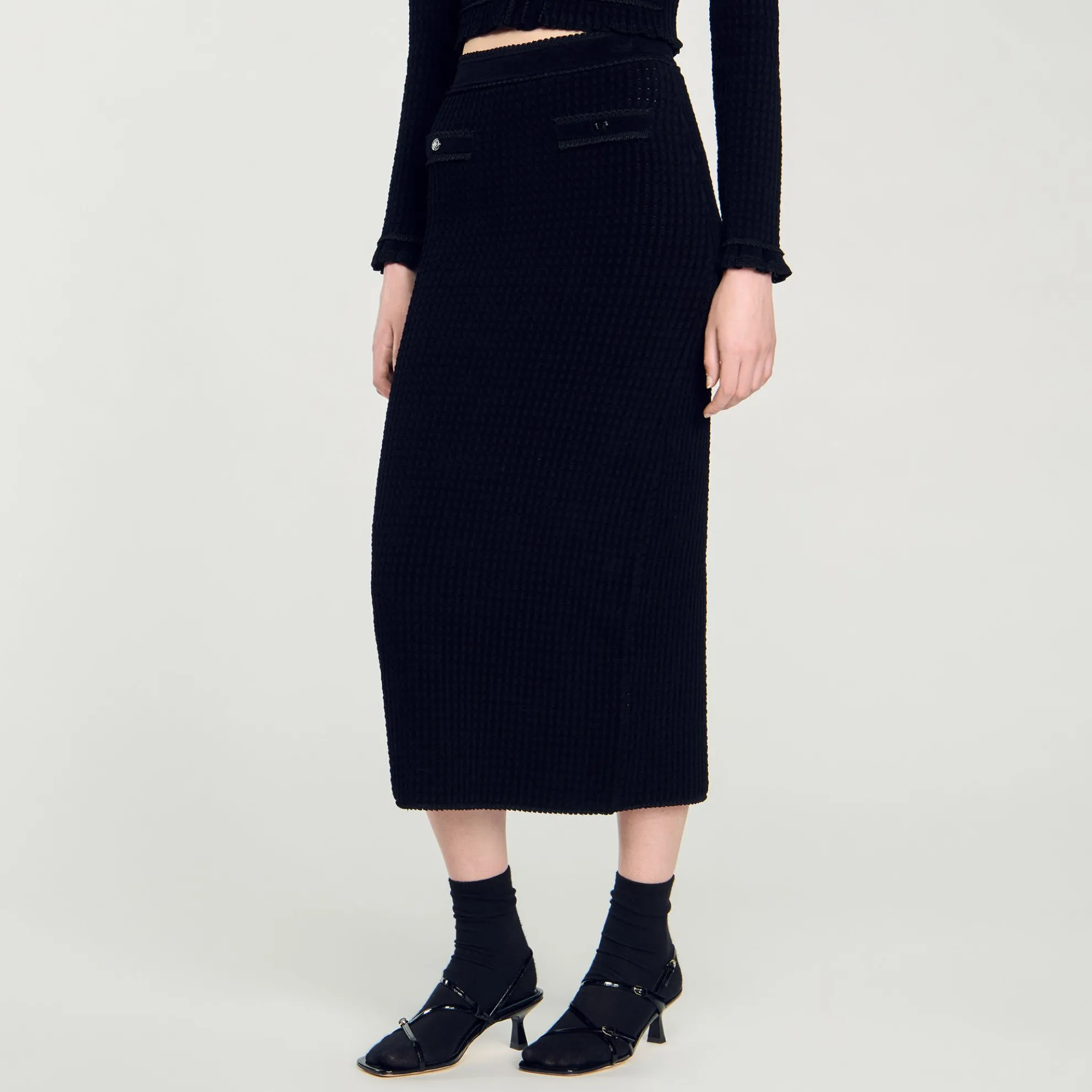 Gebreide midi rok met fluweeleffect en pointelle, versierd met nep paspelzakken en een ton-sur-ton afwerking.