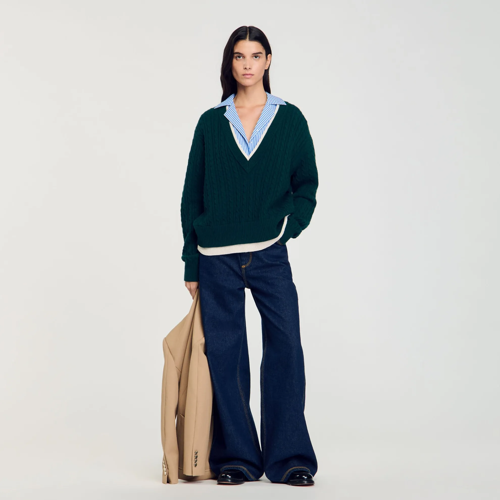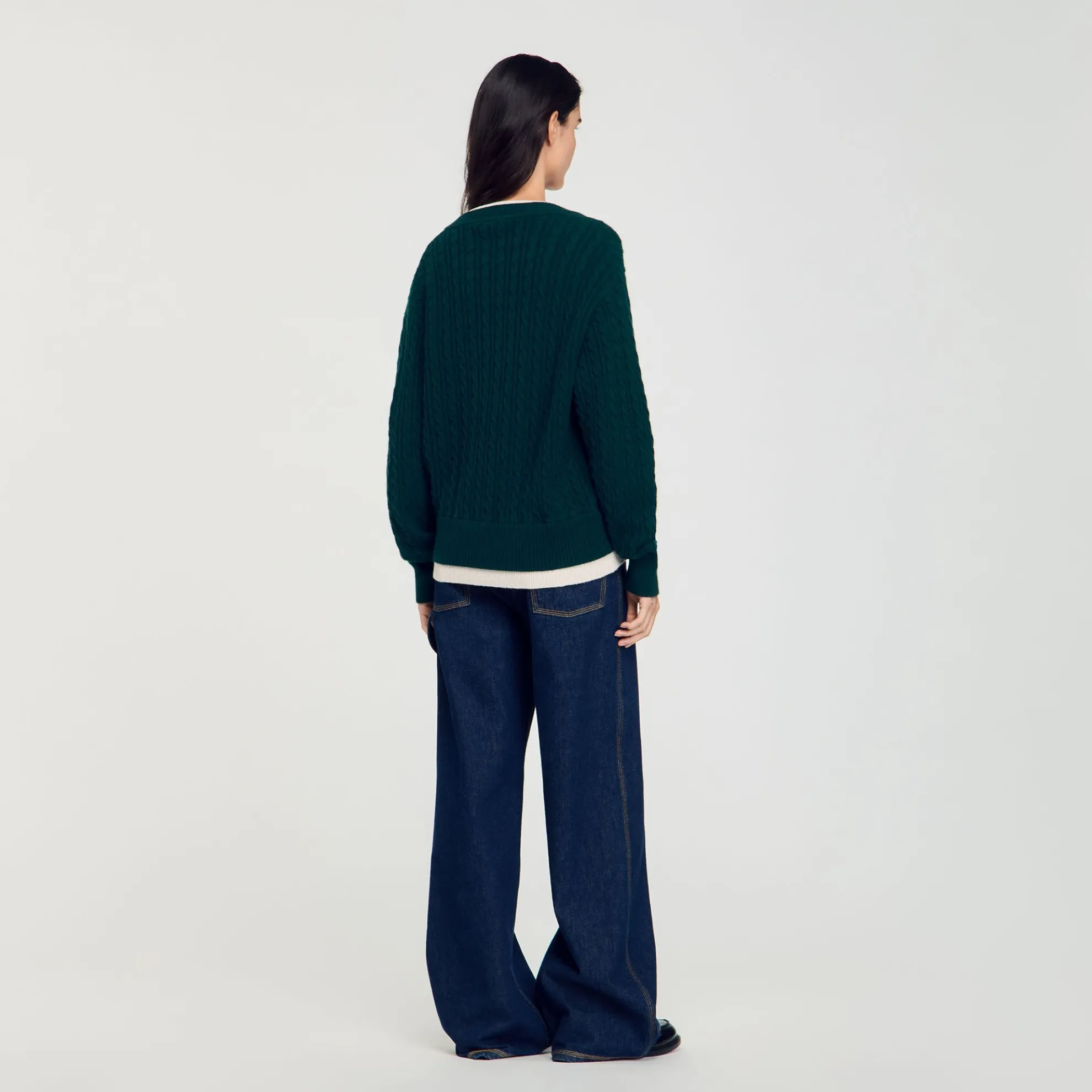 Tweekleurige kabelgebreide trui met trompe l’œil van wol en kasjmier met lange mouwen en een V-hals.