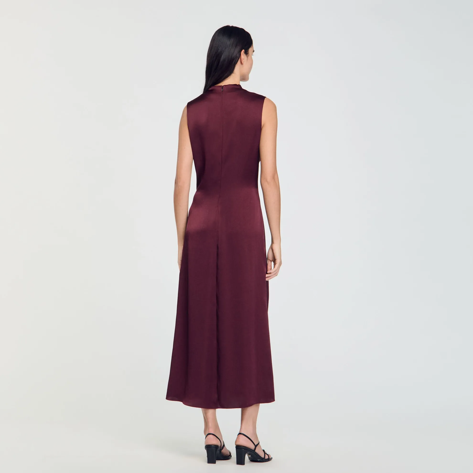 Mouwloze satijnen jurk met een ronde hals met druppelvormig decolleté en ruches aan de voorkant.