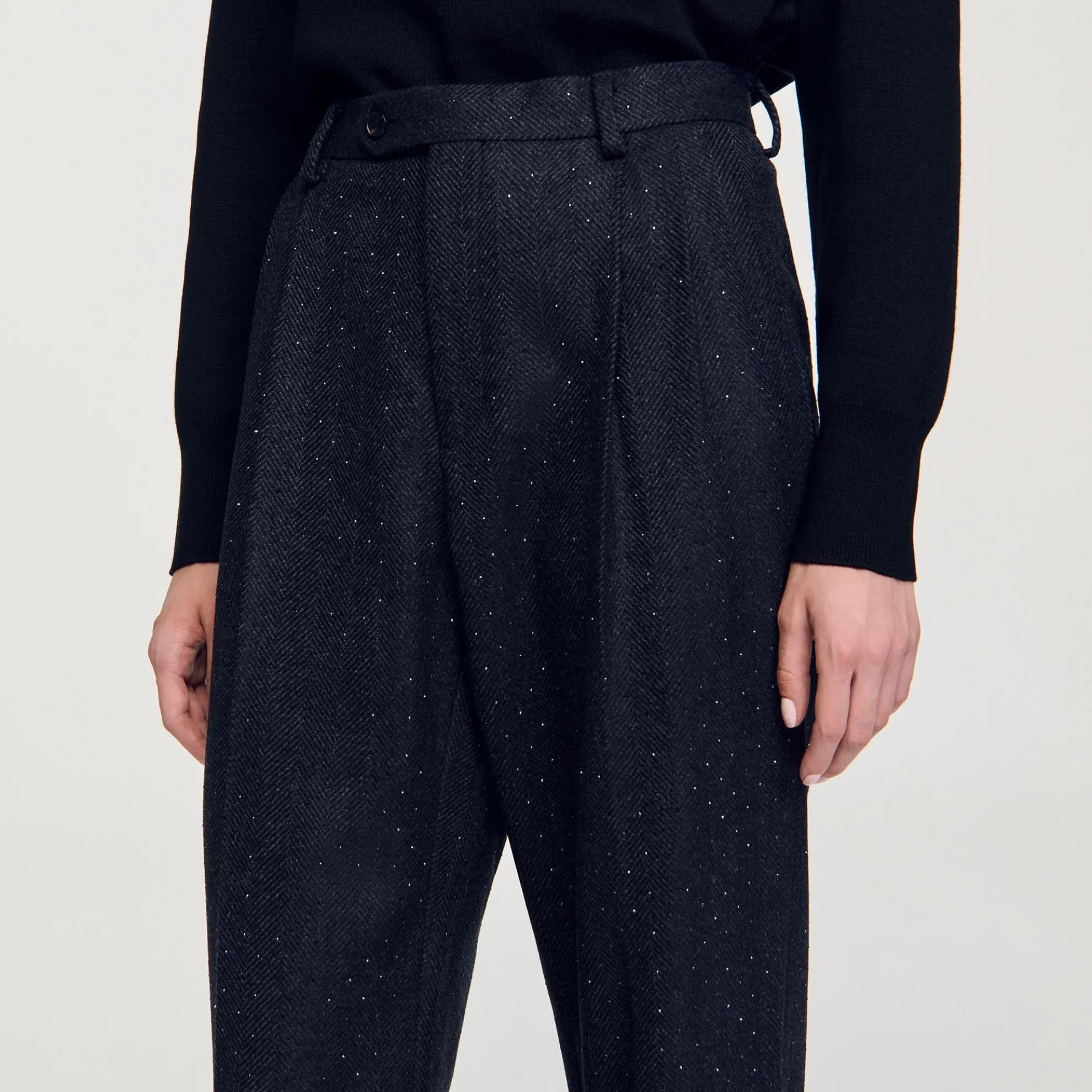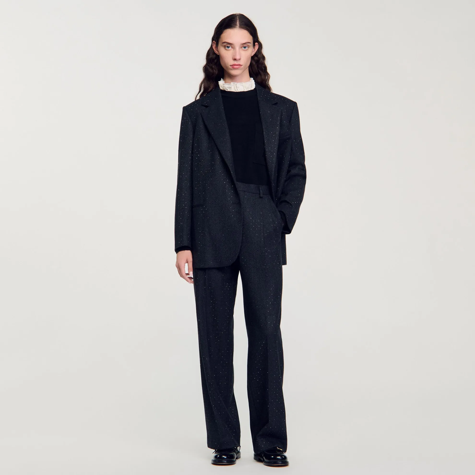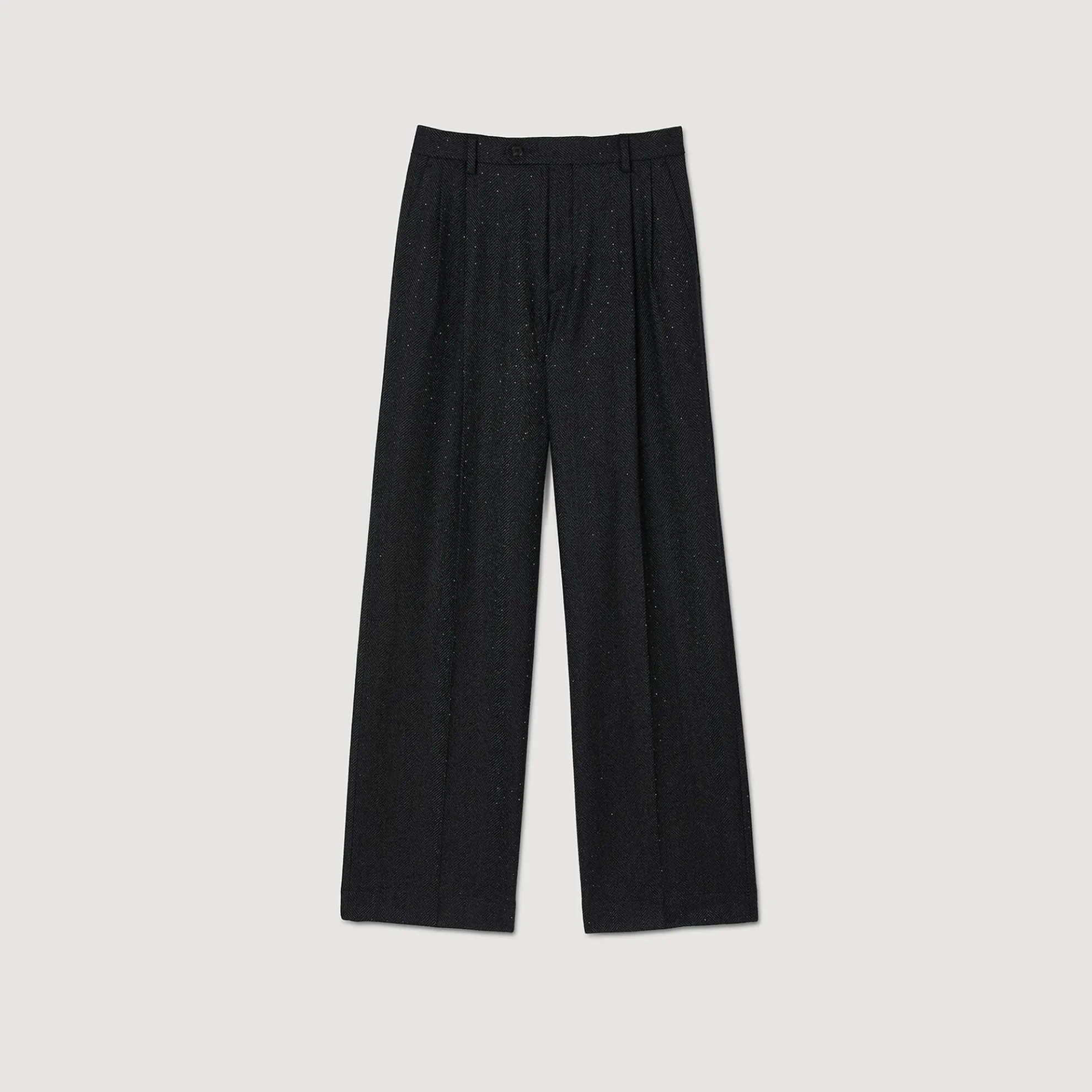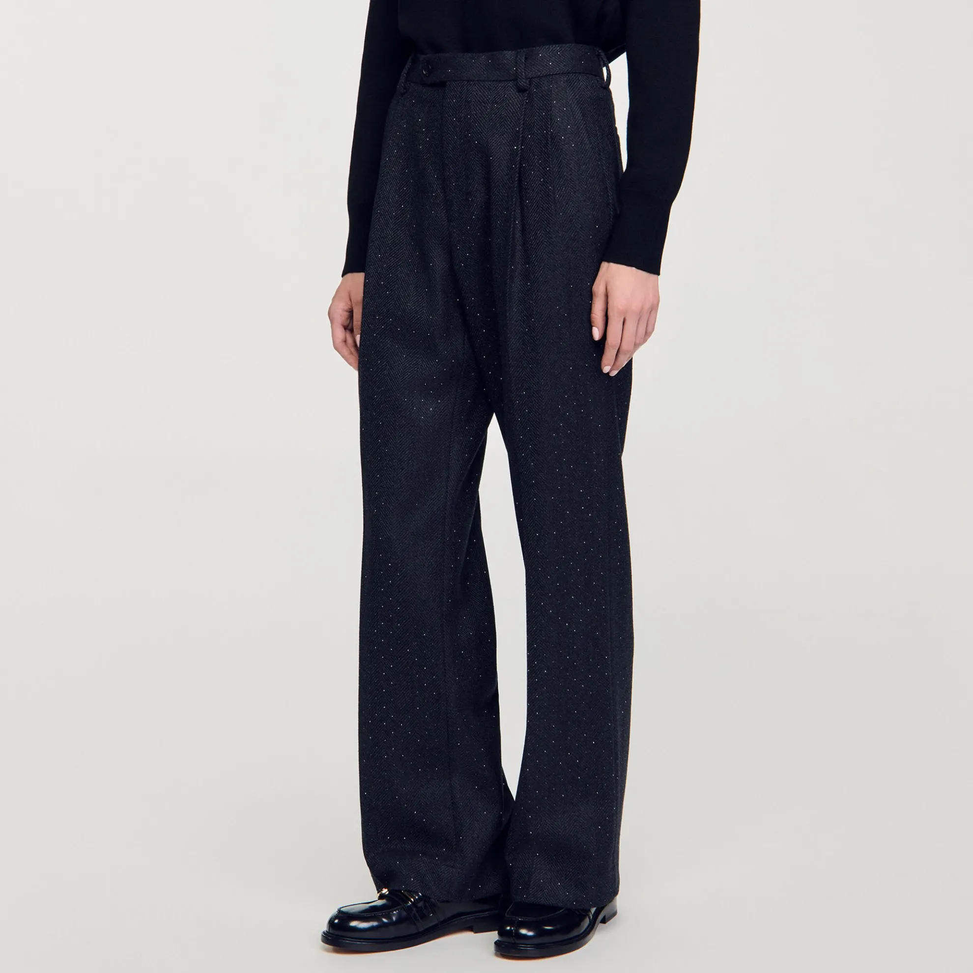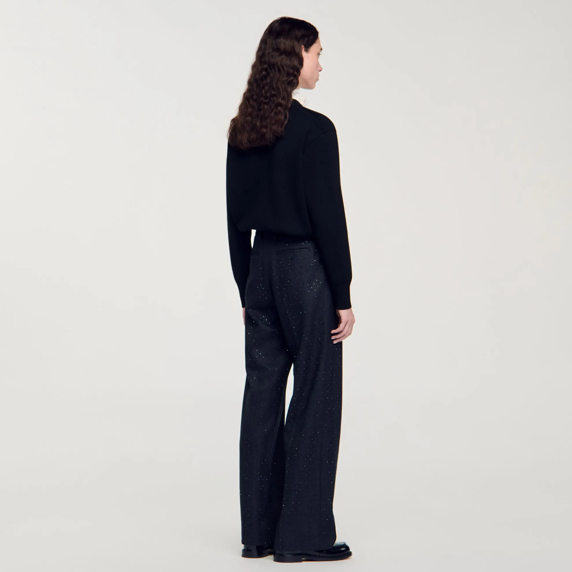 Rechte wijde broek met contrasterende strepen volledig versierd met strass-steentjes, uitgevoerd met een elastische riem met lussen en zakken aan de zijkant.