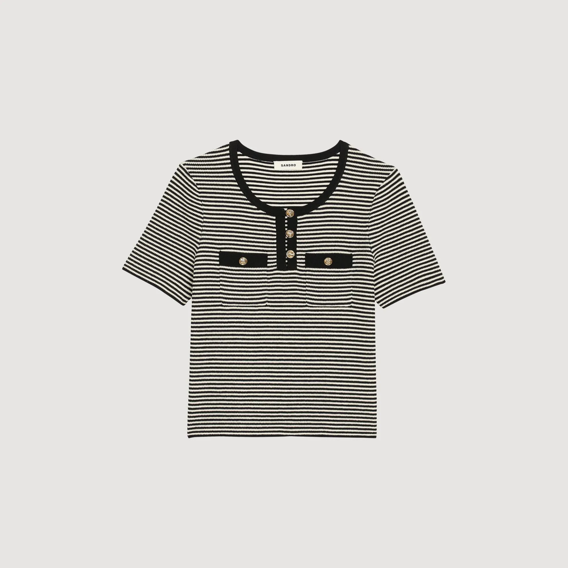 Gestreepte gebreide trui met ronde hals, korte mouwen, knoopsluiting en opgestikte zakken op de borst.
