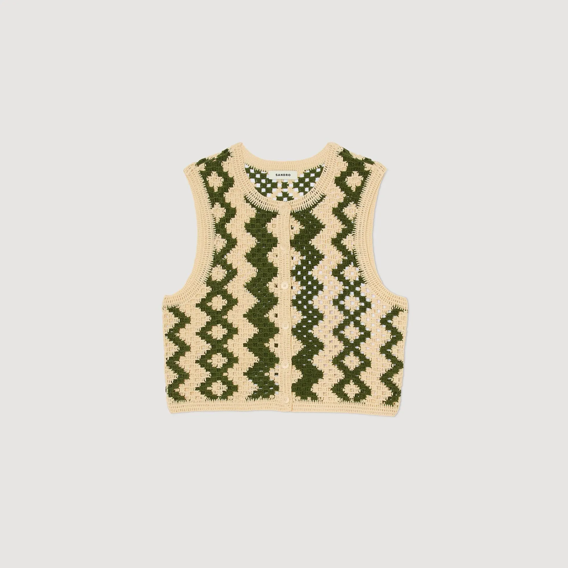 Kort mouwloos gilet van tweekleurig haakwerk met een geometrisch motief en knoopsluiting.