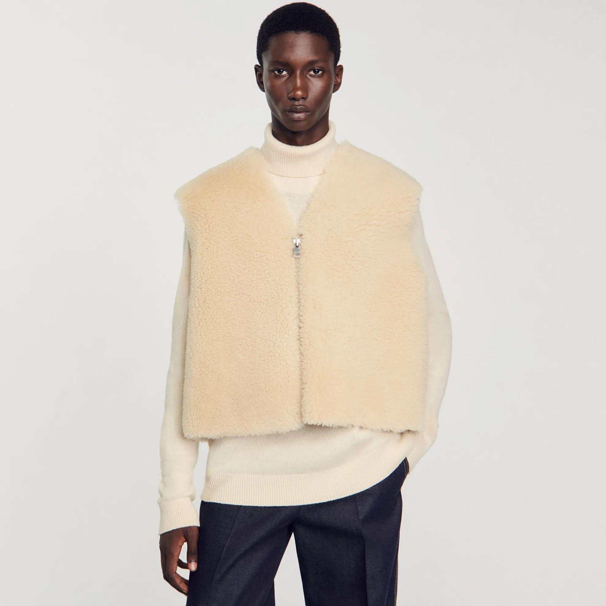 Mouwloos gilet van omgekeerd schapenvacht met ritssluiting aan de voorkant.
