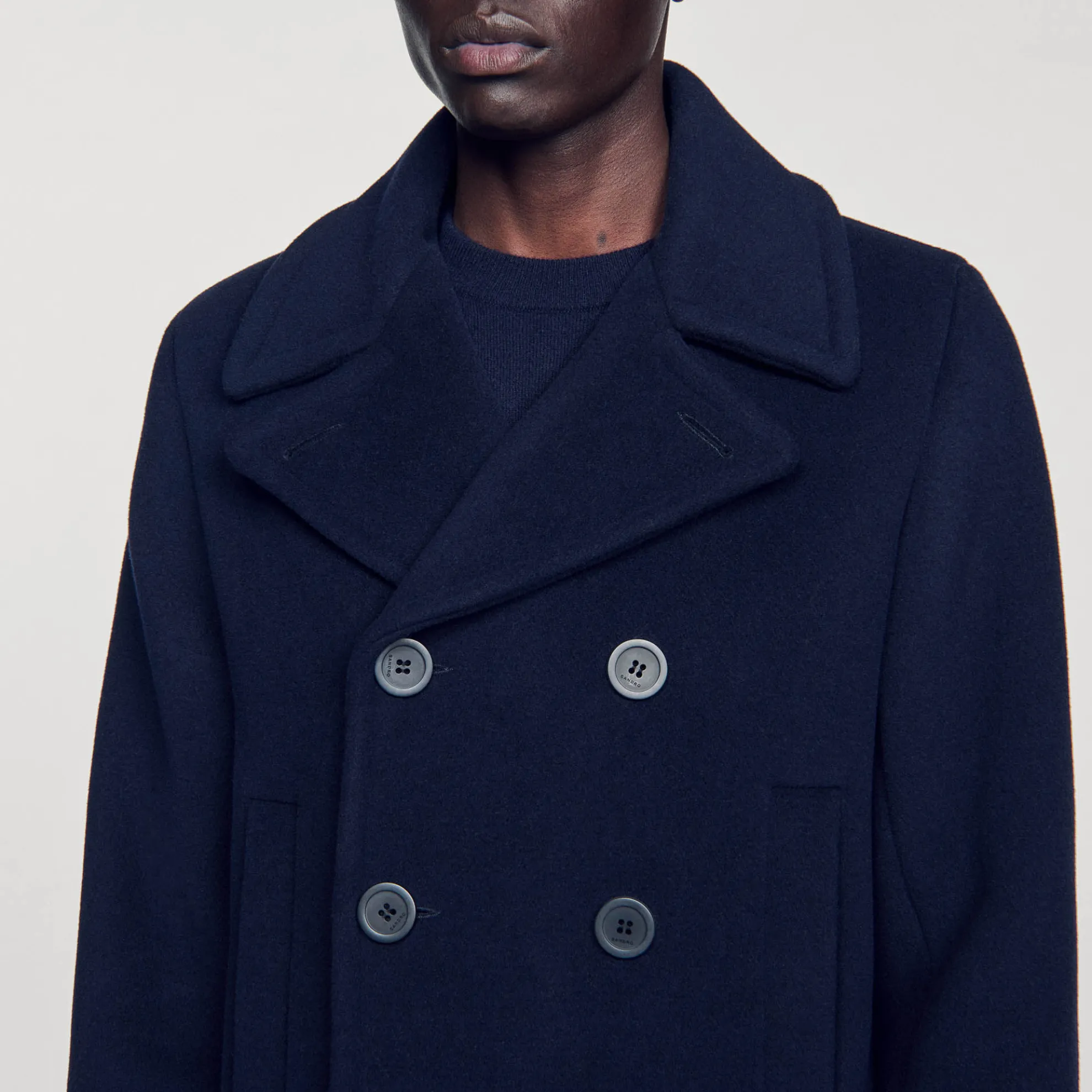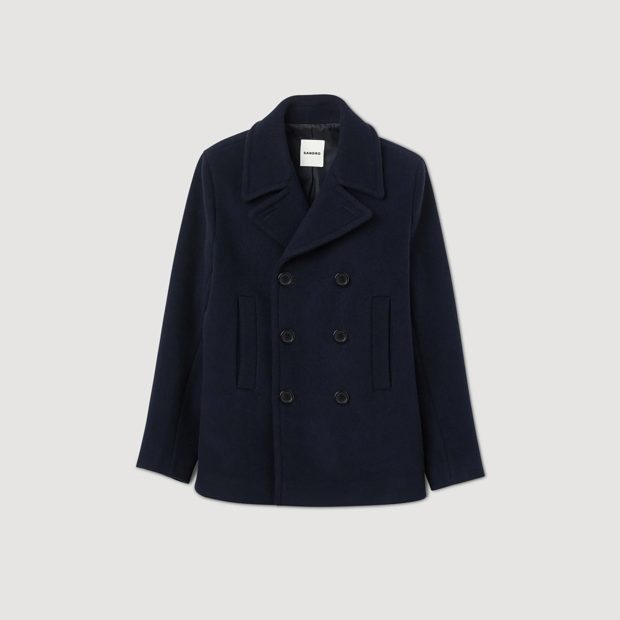 Rechte jas van wolmix in kaban stijl met een reverskraag, lange mouwen en een dubbele rij knopen.