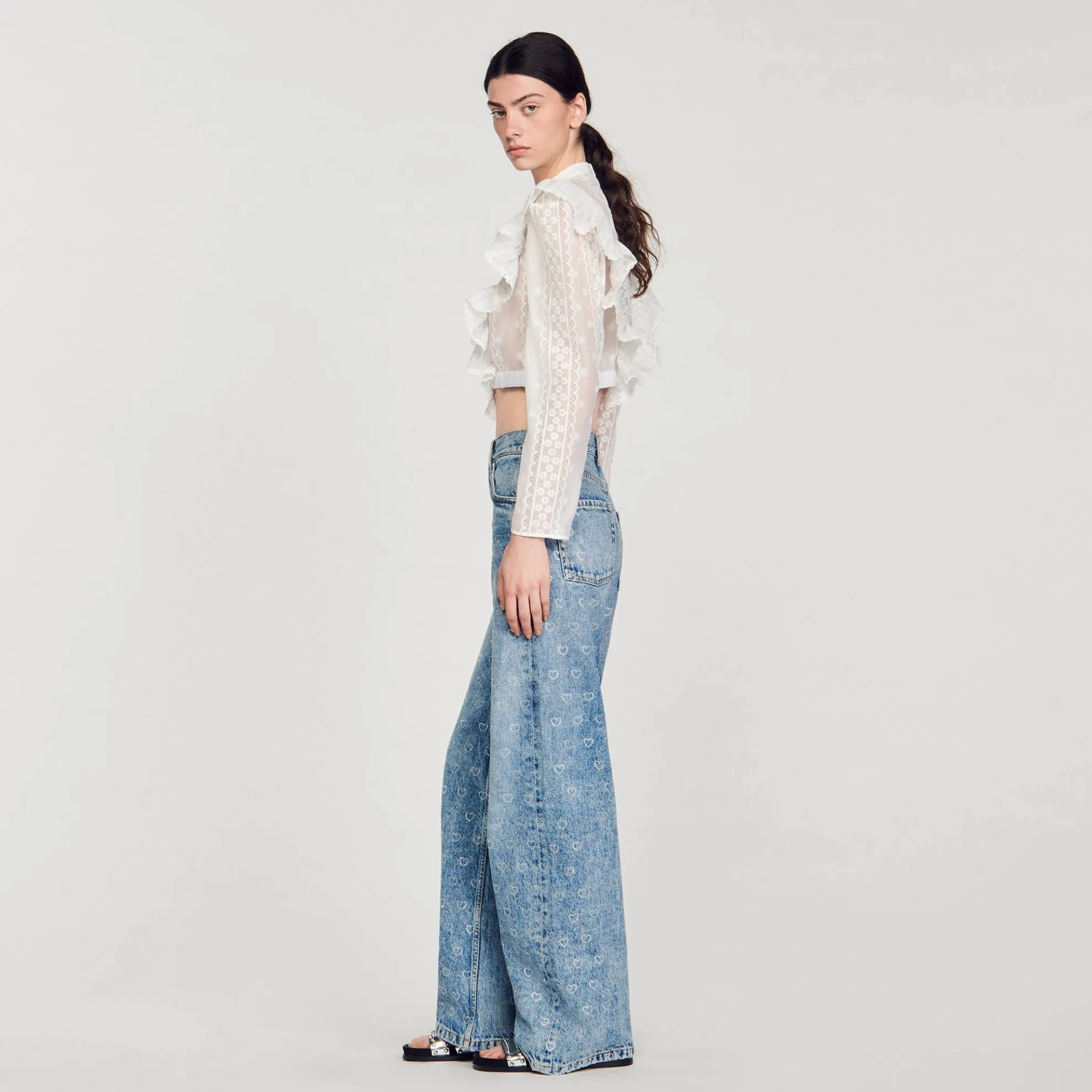 Stone washed jeans met een wijde pasvorm en all-over stras hartjes.