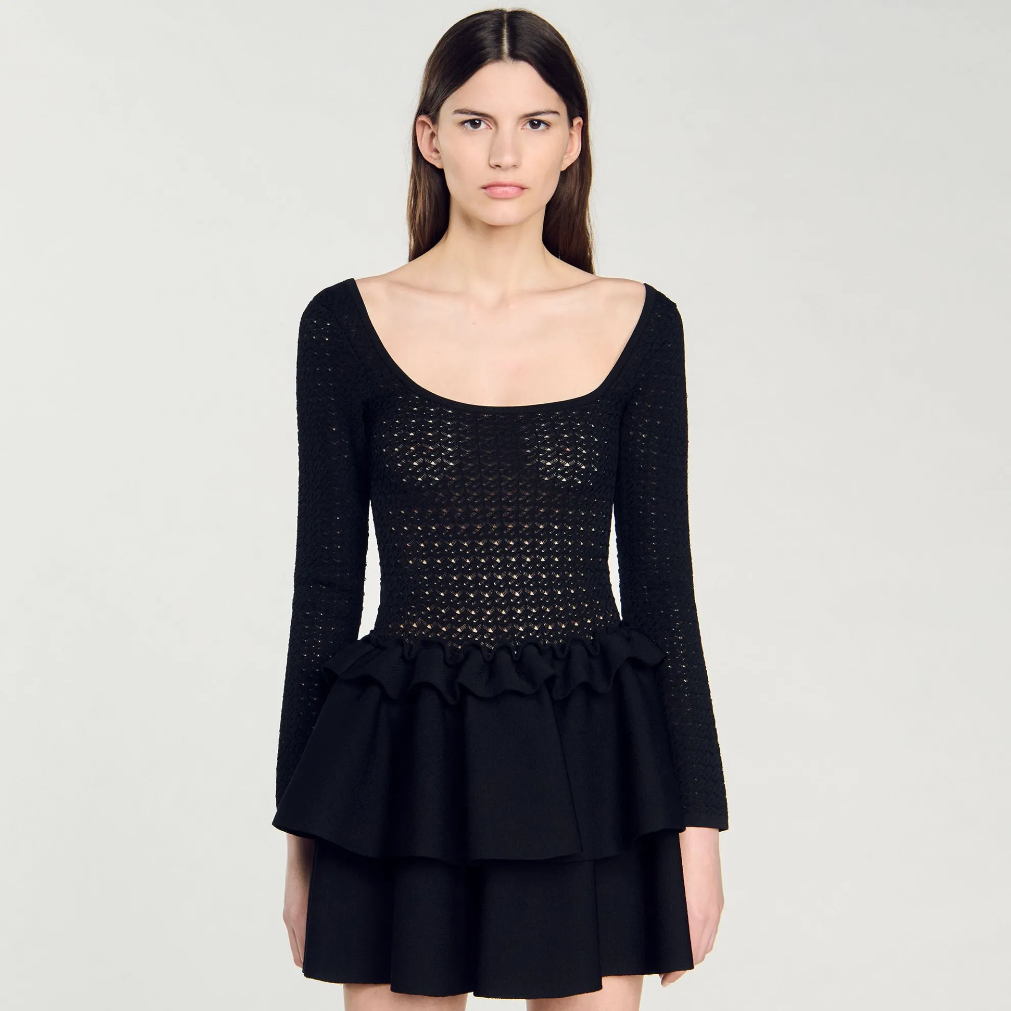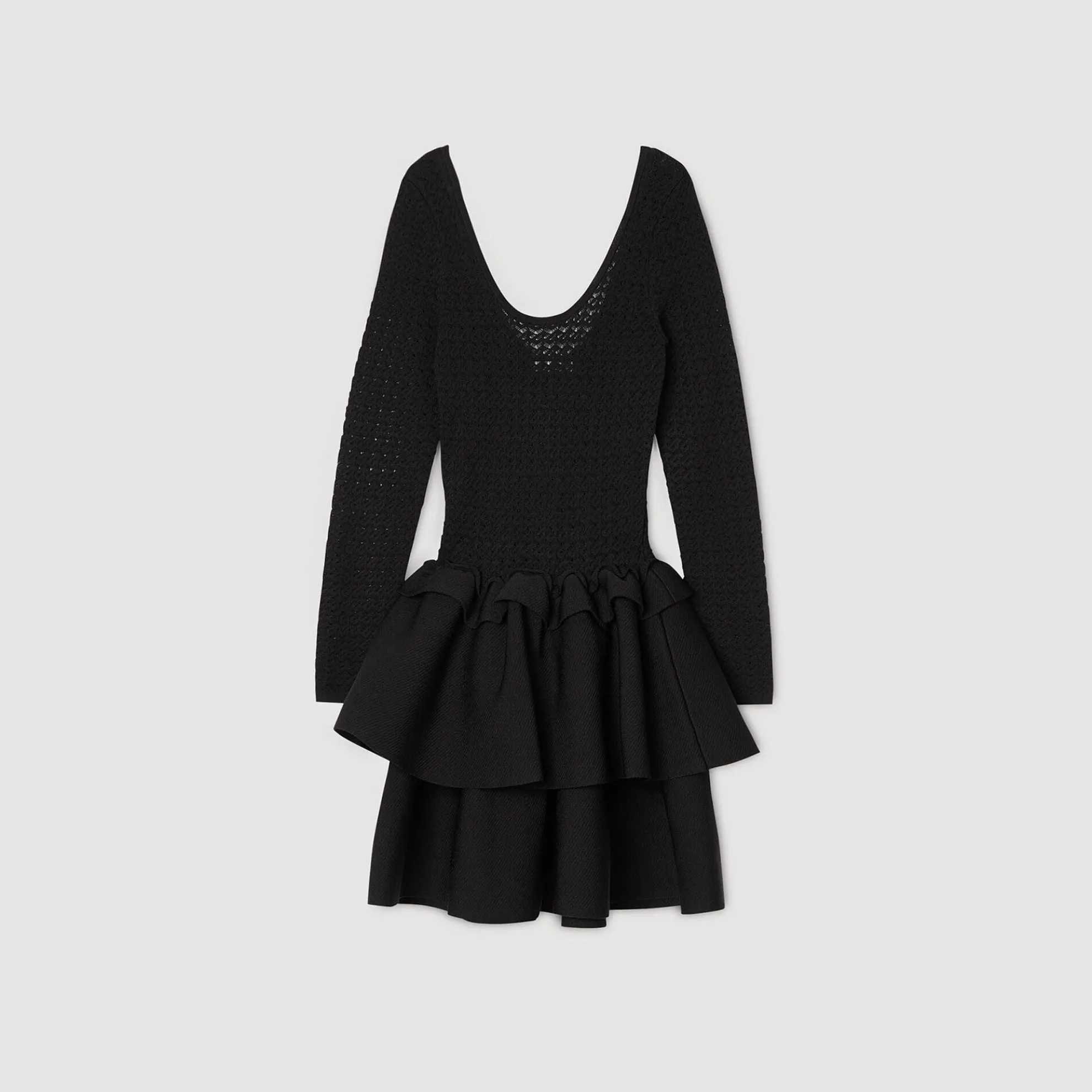 Jurk met trompe l’œil-effect met een gebreide top met ronde kraag en lange mouwen en een wijde rok met ruches.