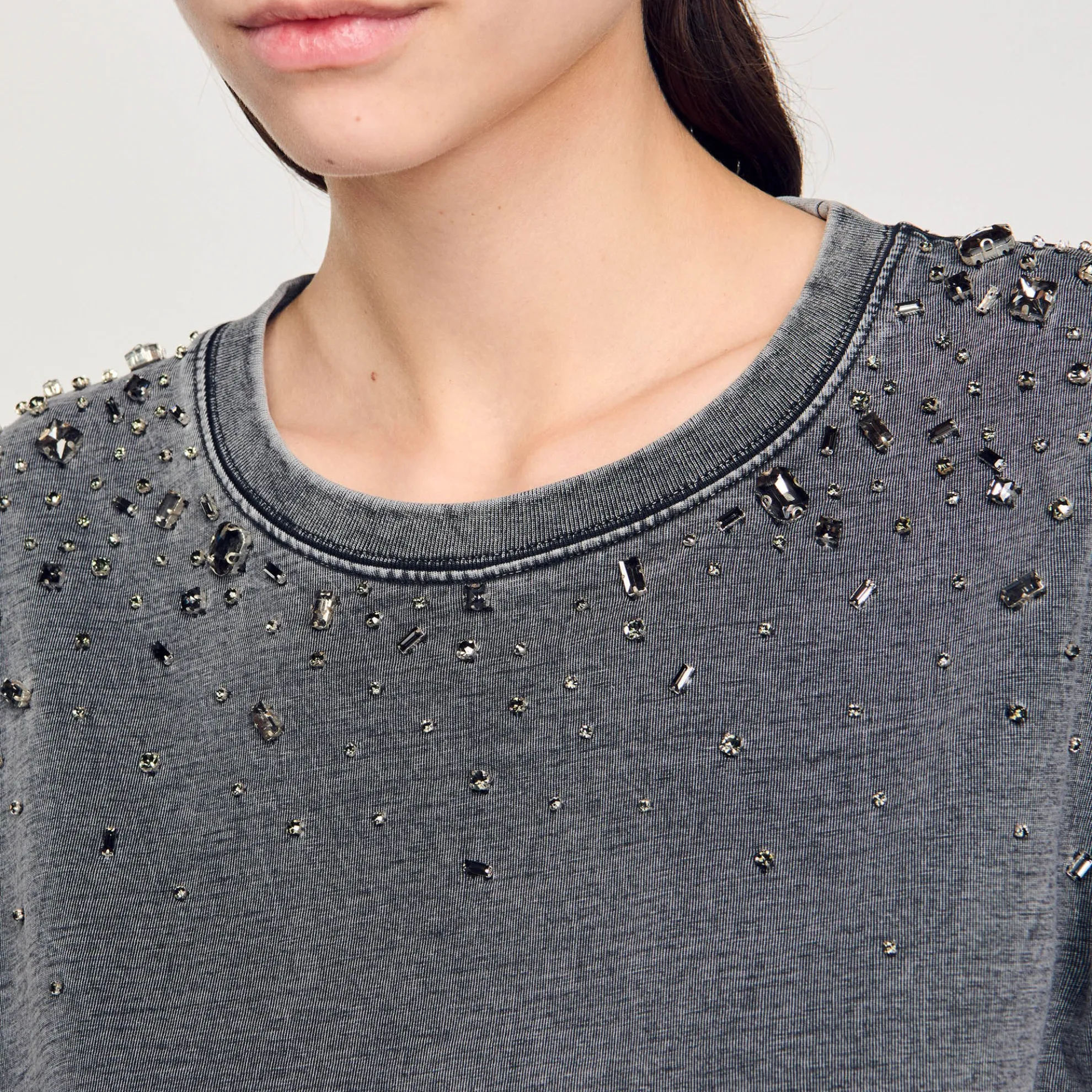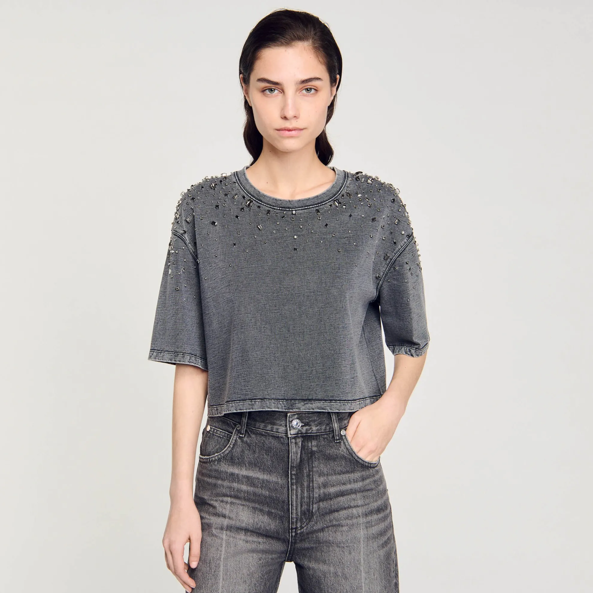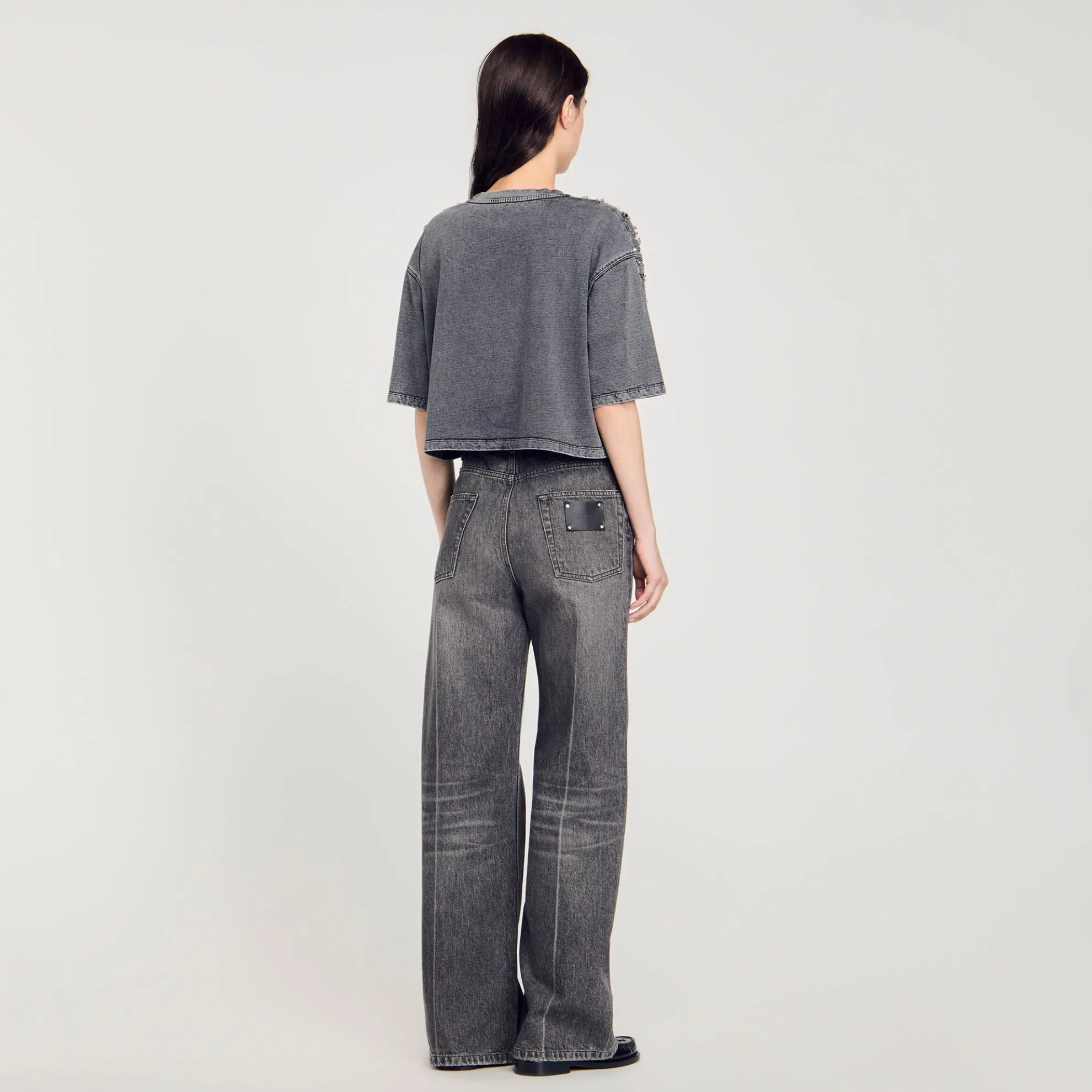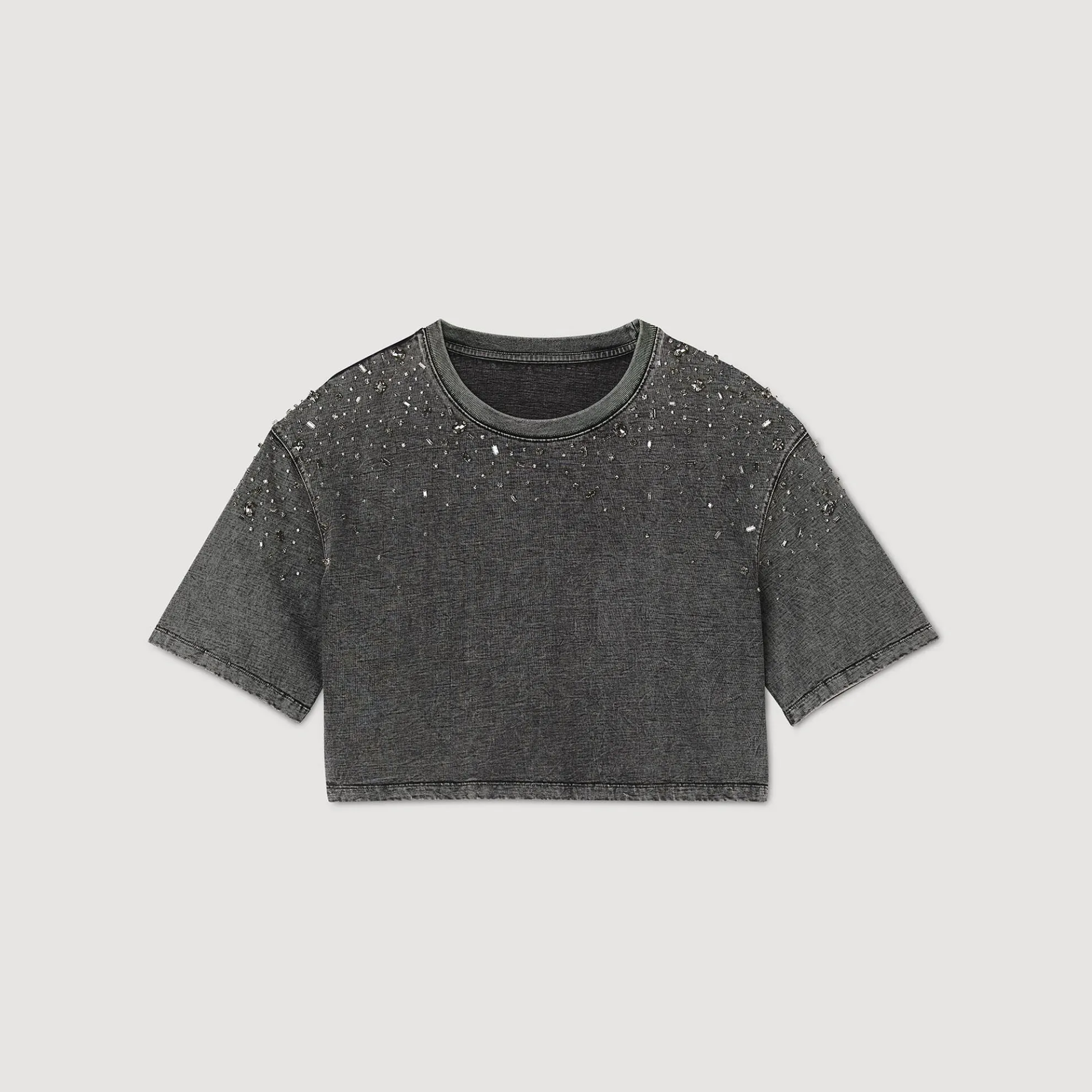 T-shirt met washed effect, ronde hals en korte mouwen versierd met handgeborduurde stras.
