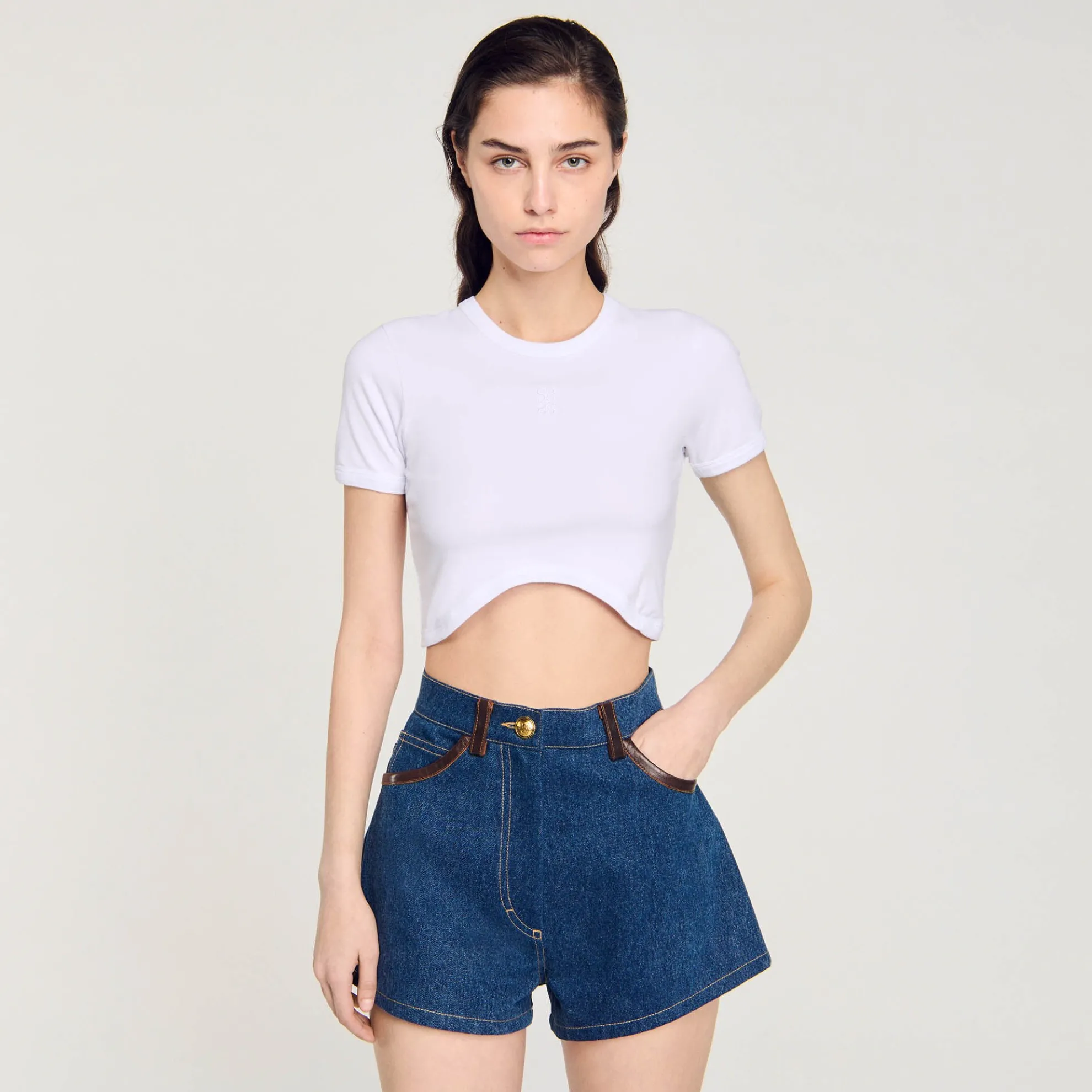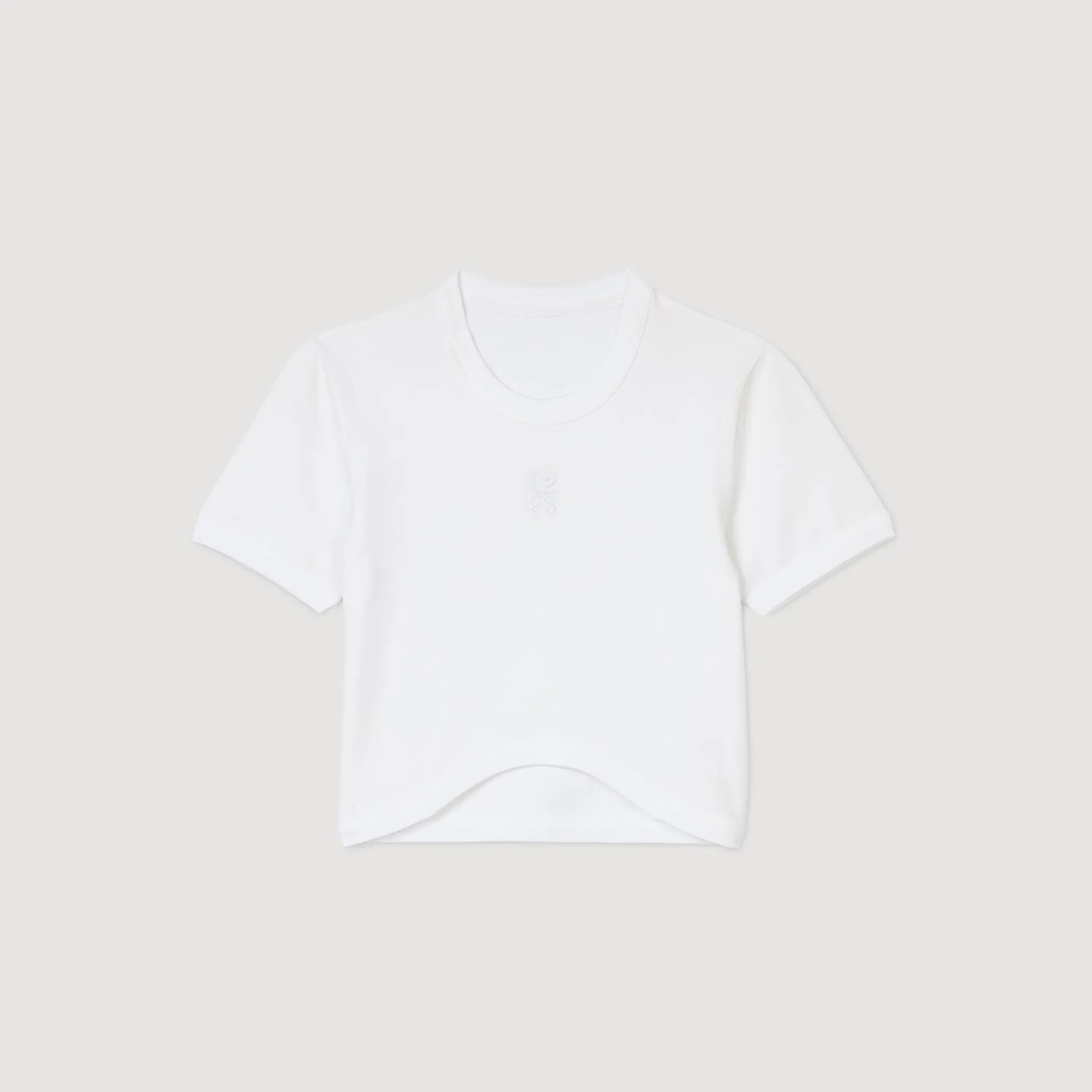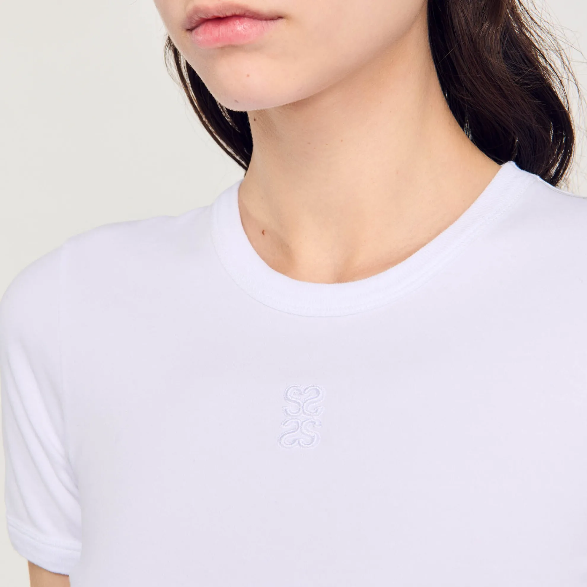 Kort T-shirt met uitsnede aan de voorkant, ronde hals, korte mouwen en een geborduurde dubbele S.