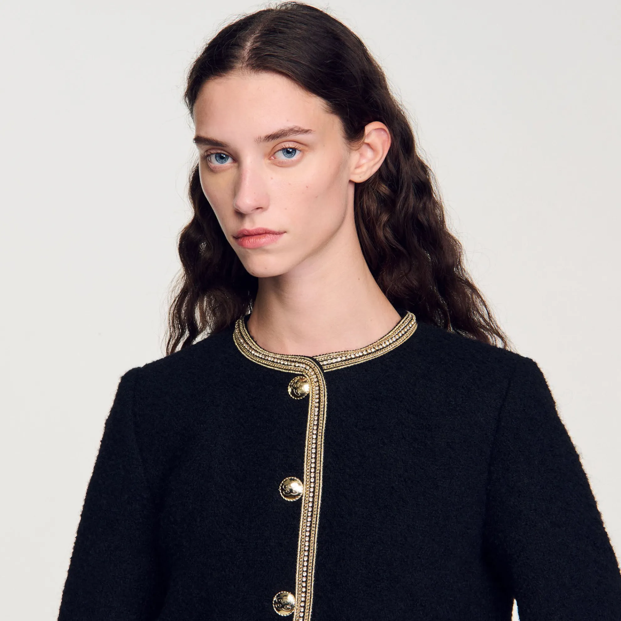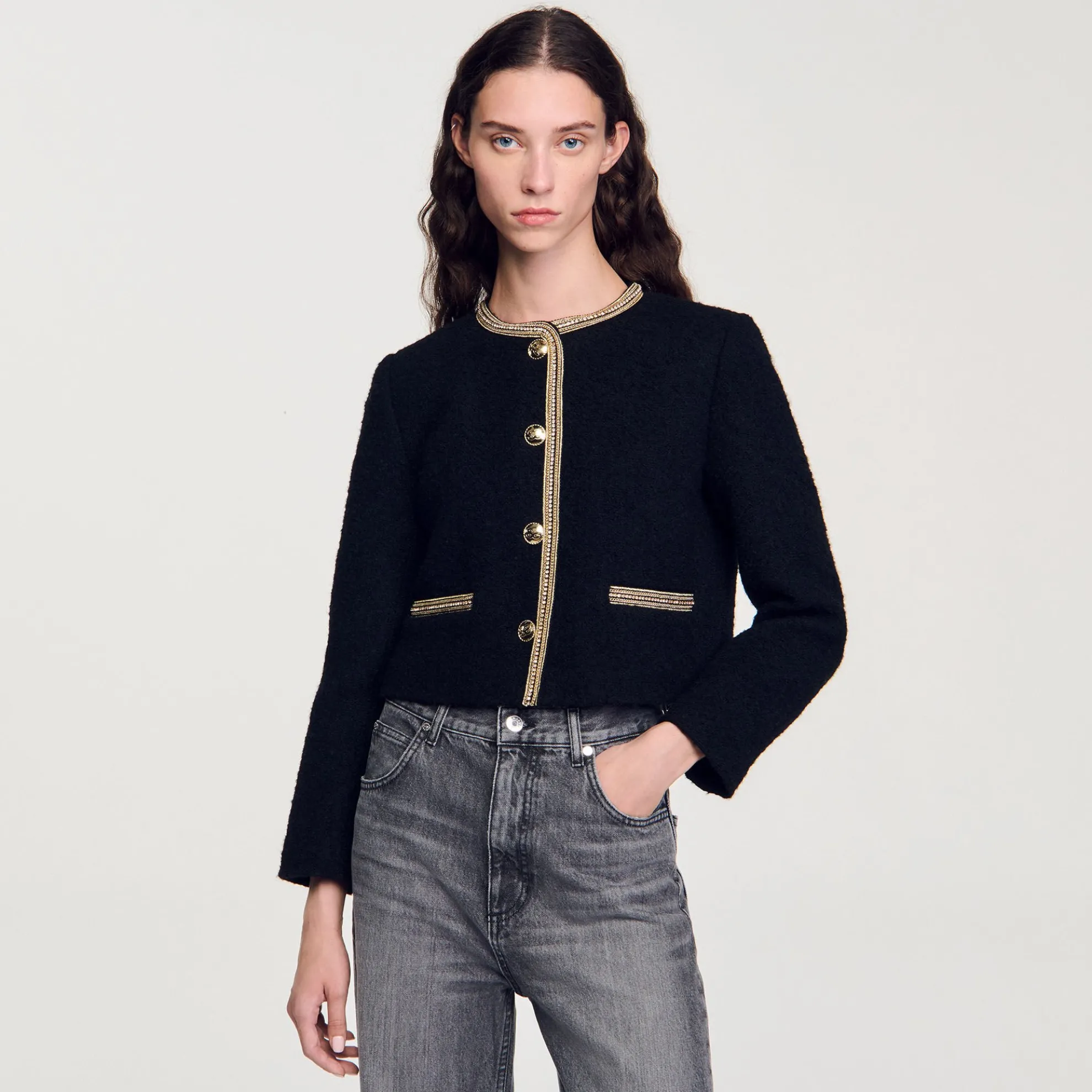 Kort tweed jasje met ronde kraag, lange mouwen, een knoopsluiting en een sierlijke kettingbies.