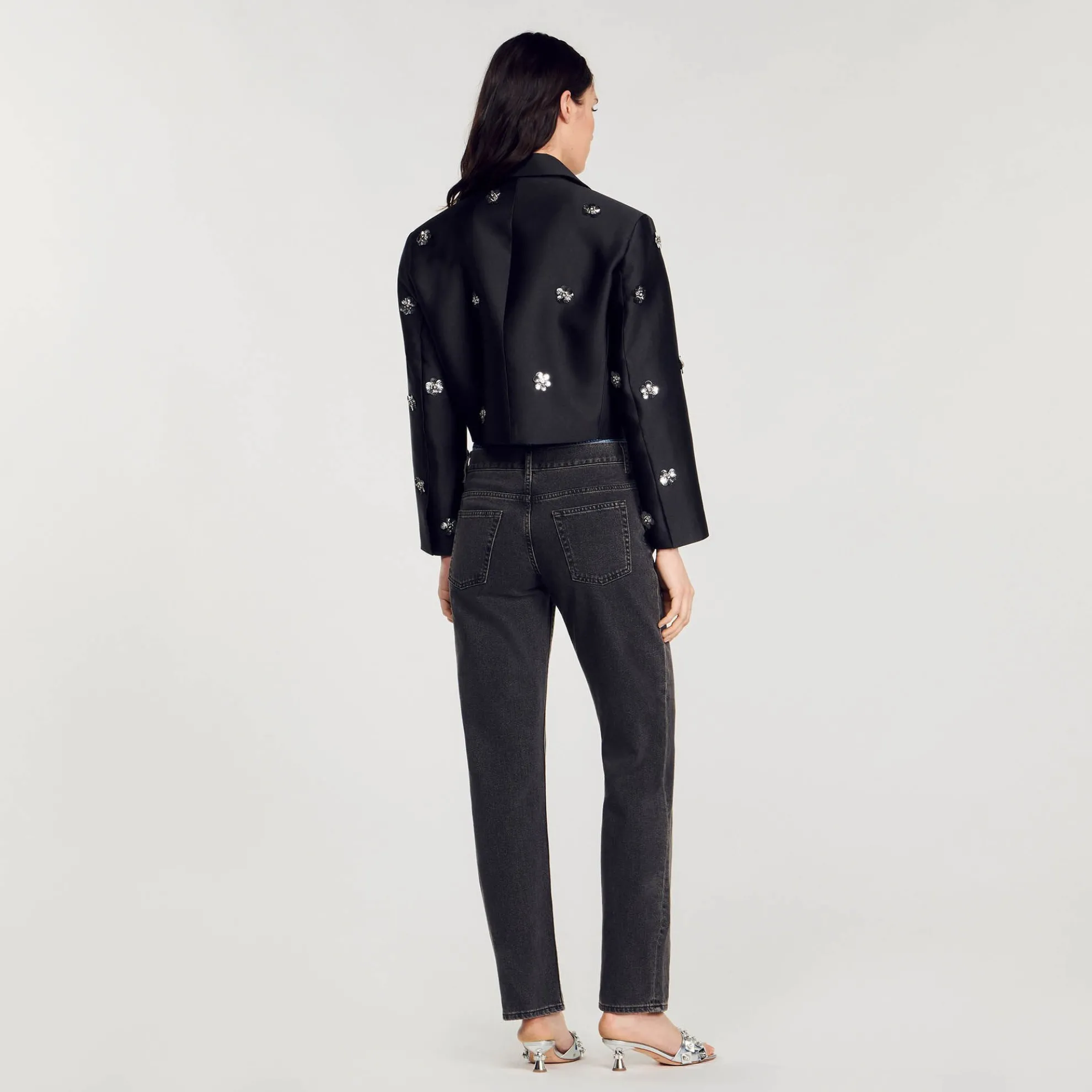Oversized, satijnachtig kort vest met brede reverskraag, een verborgen double-breasted knoopsluiting, lange mouwen en geborduurde bloemen.