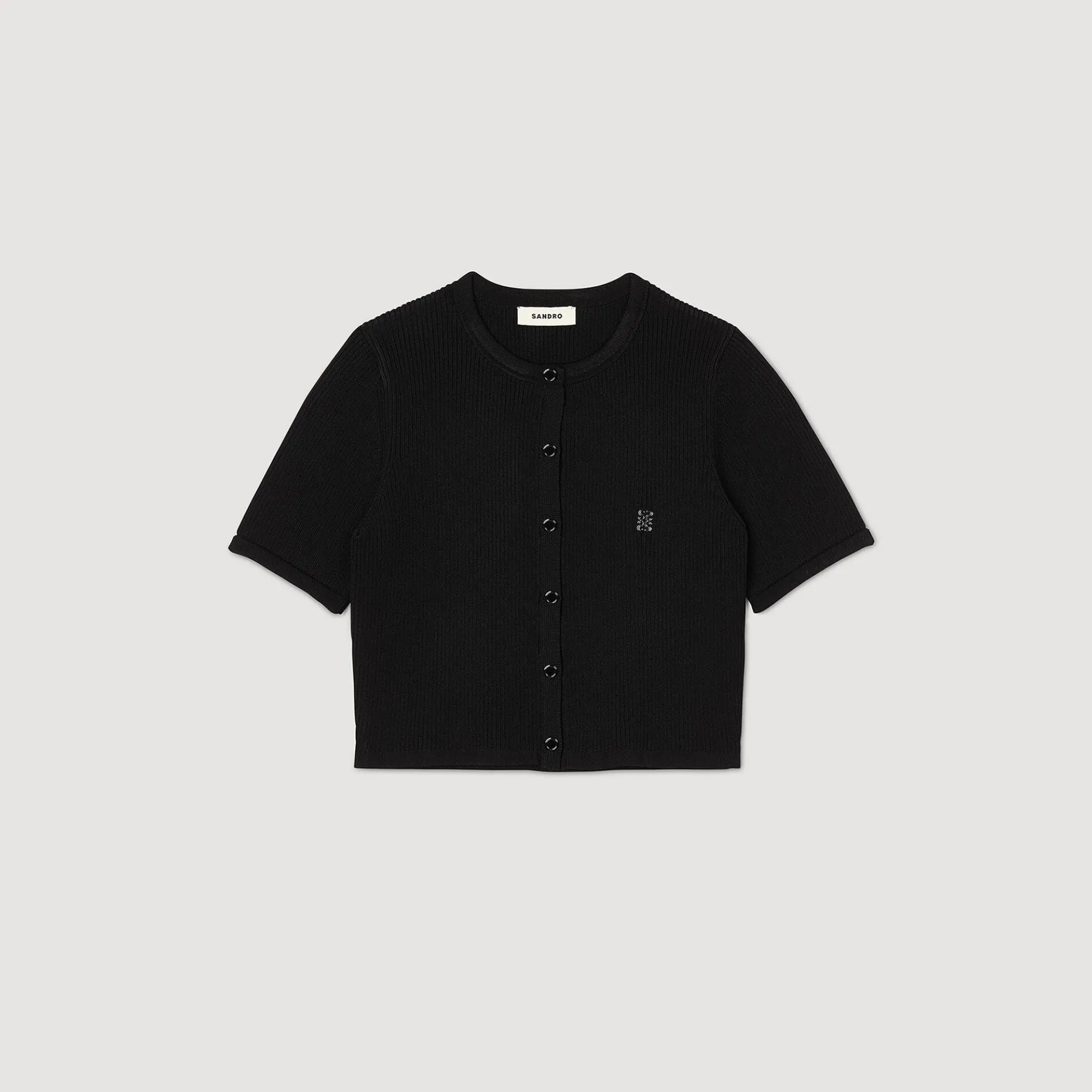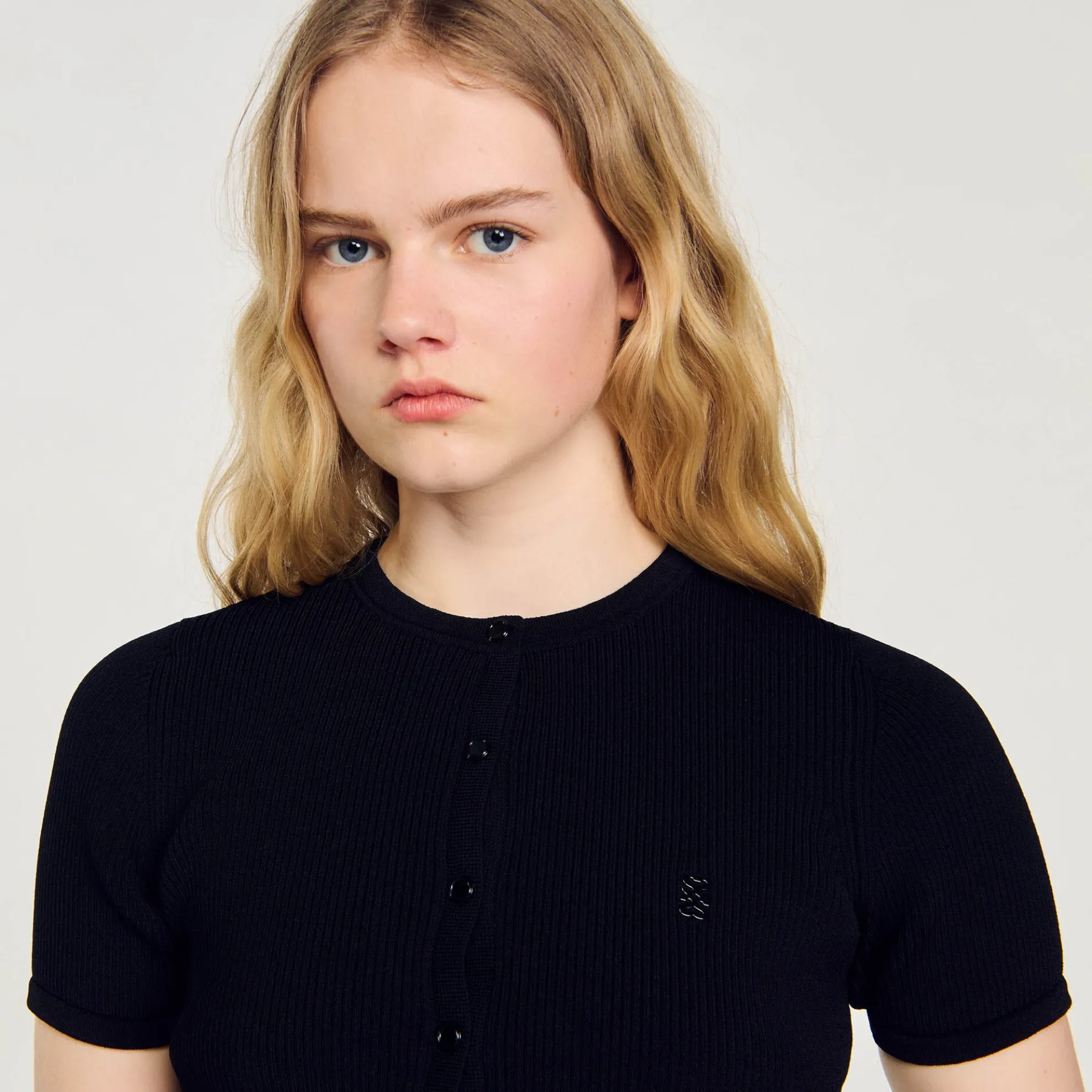 Kort ribgebreid vest met ronde hals, korte mouwen en ton-sur-ton SANDRO-chip op de borst.