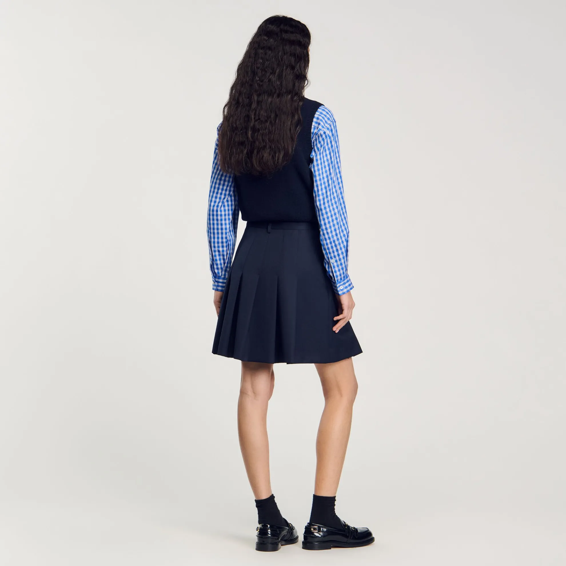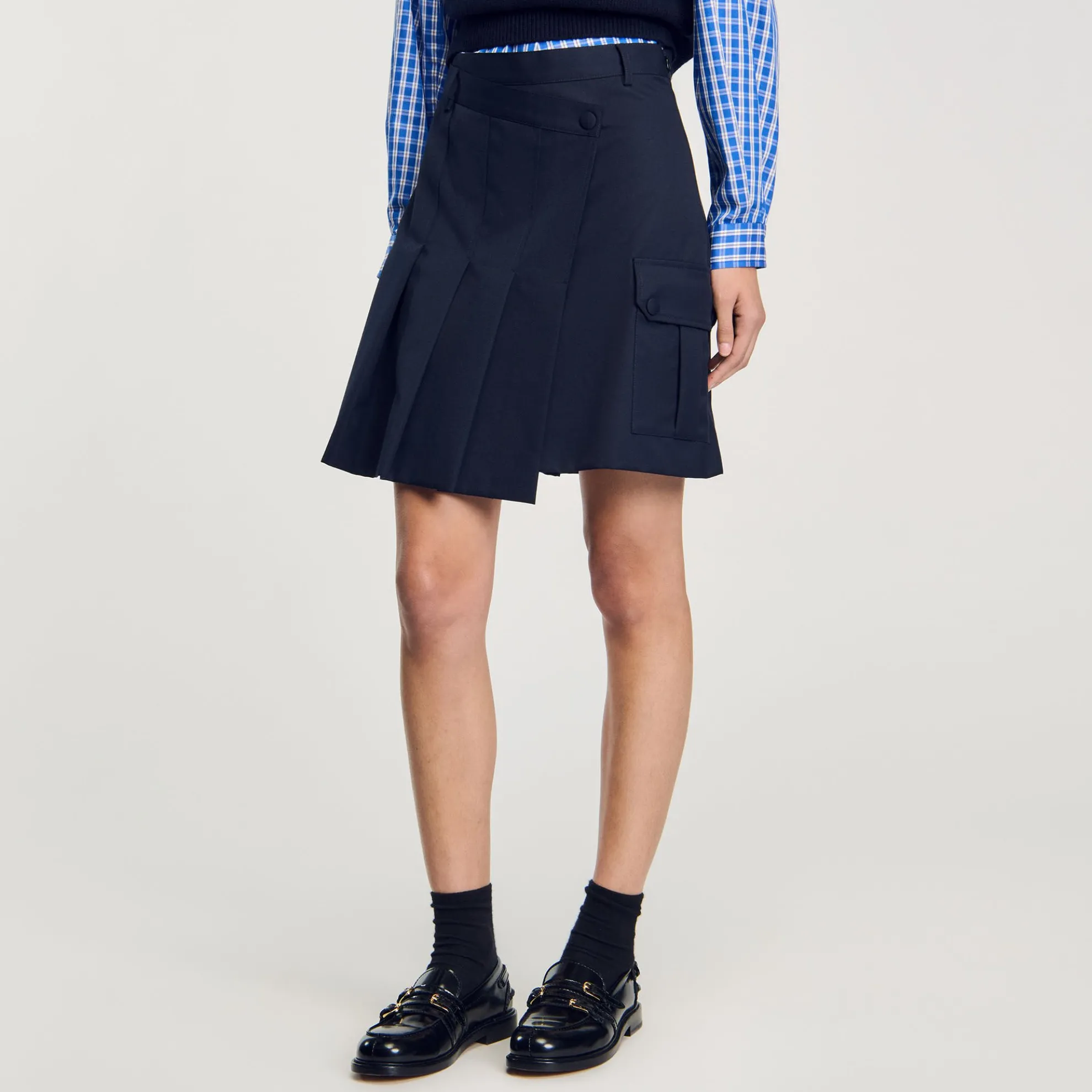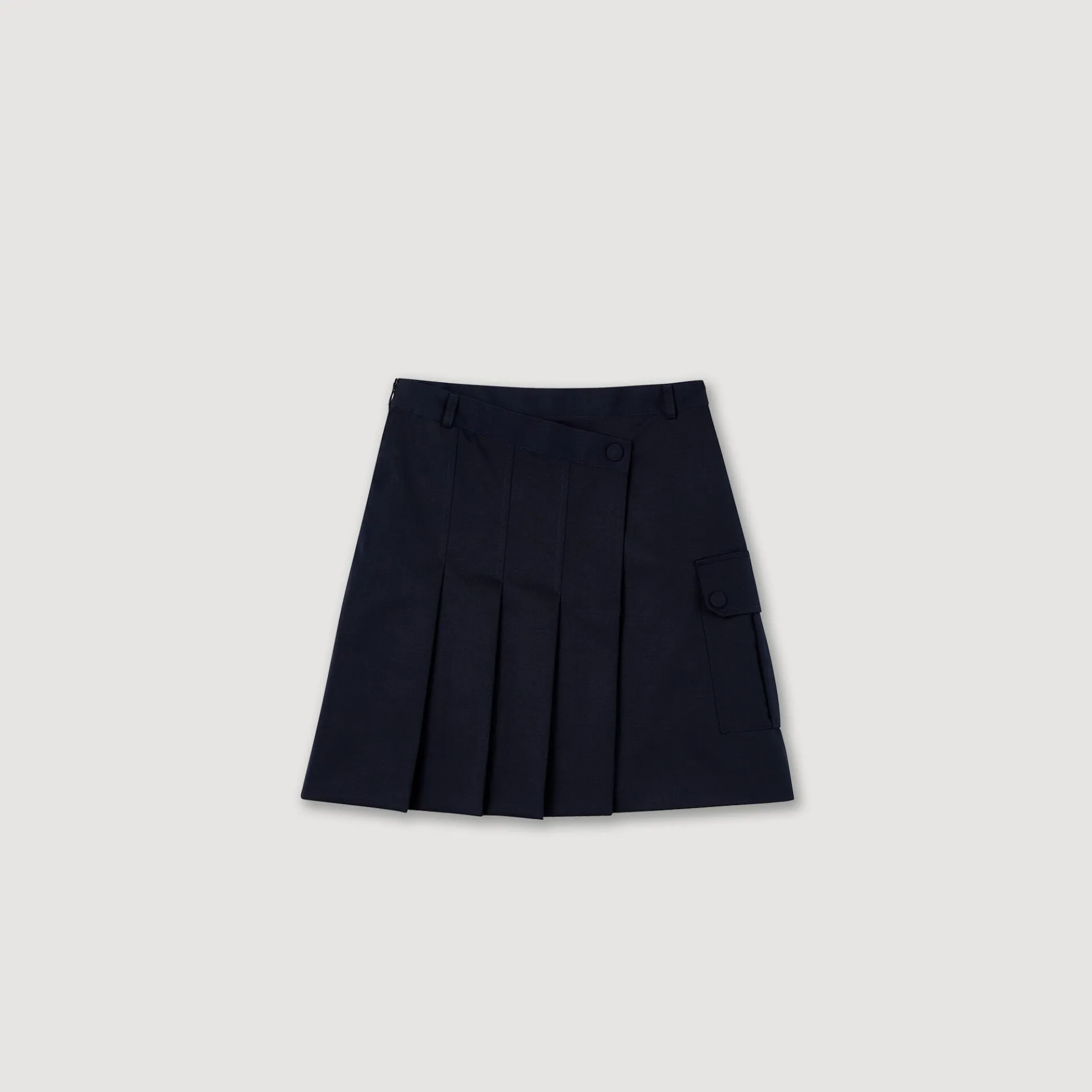 Korte geplooide rok met asymmetrische strook aan de voorkant, riemlussen, een drukknoop en een cargozak met flap aan de zijkant.