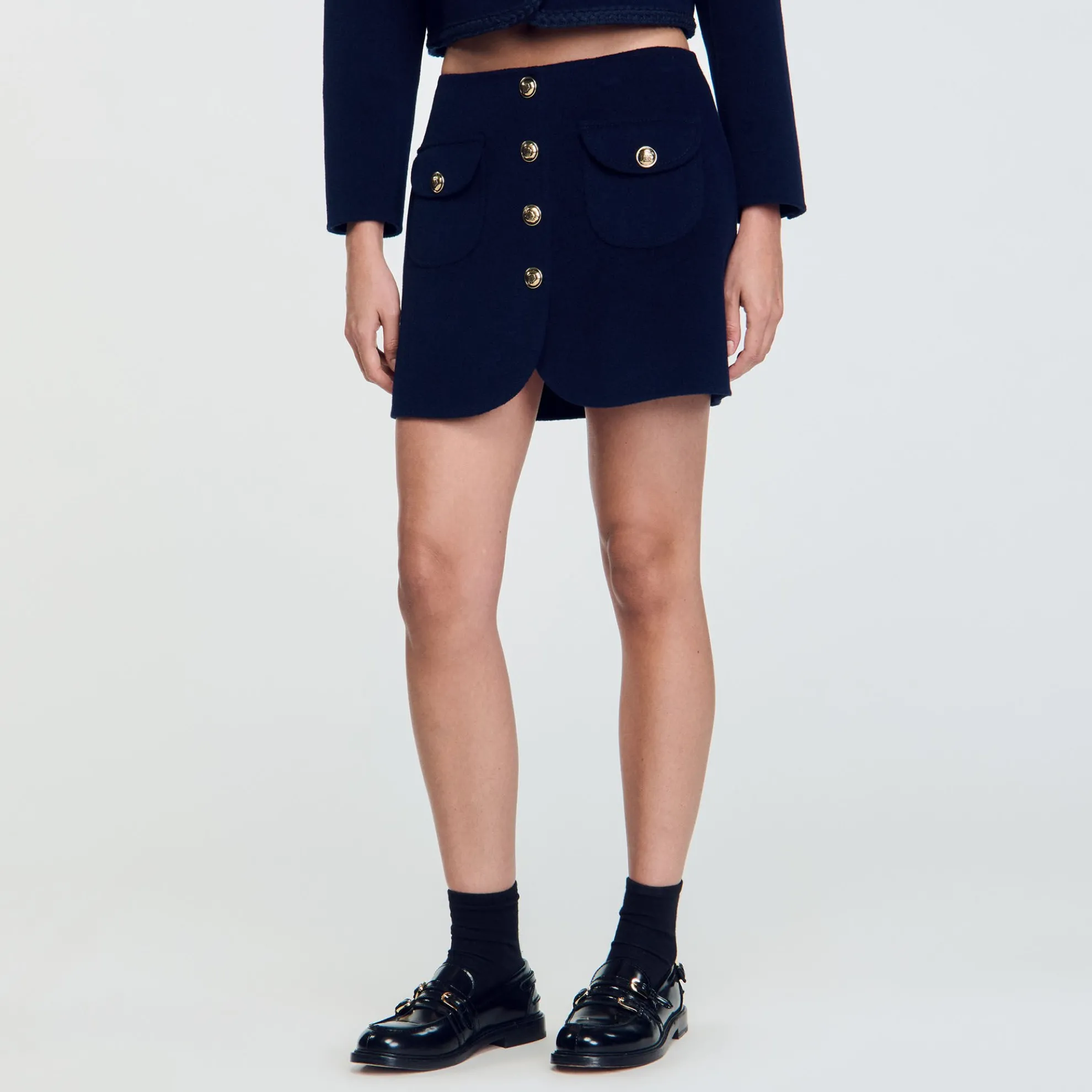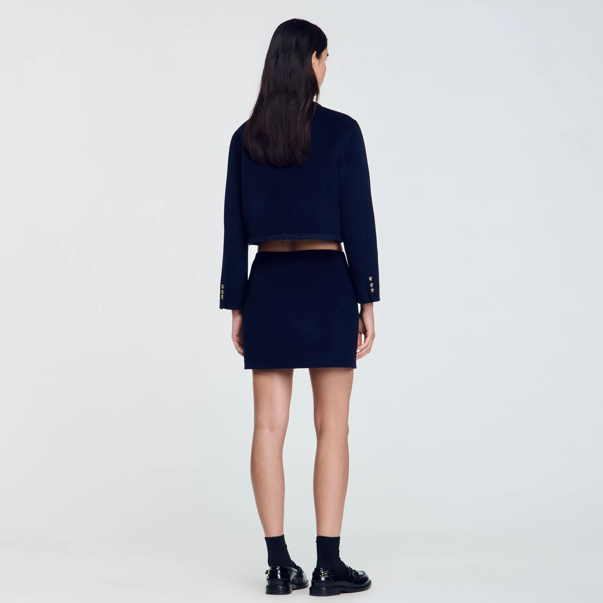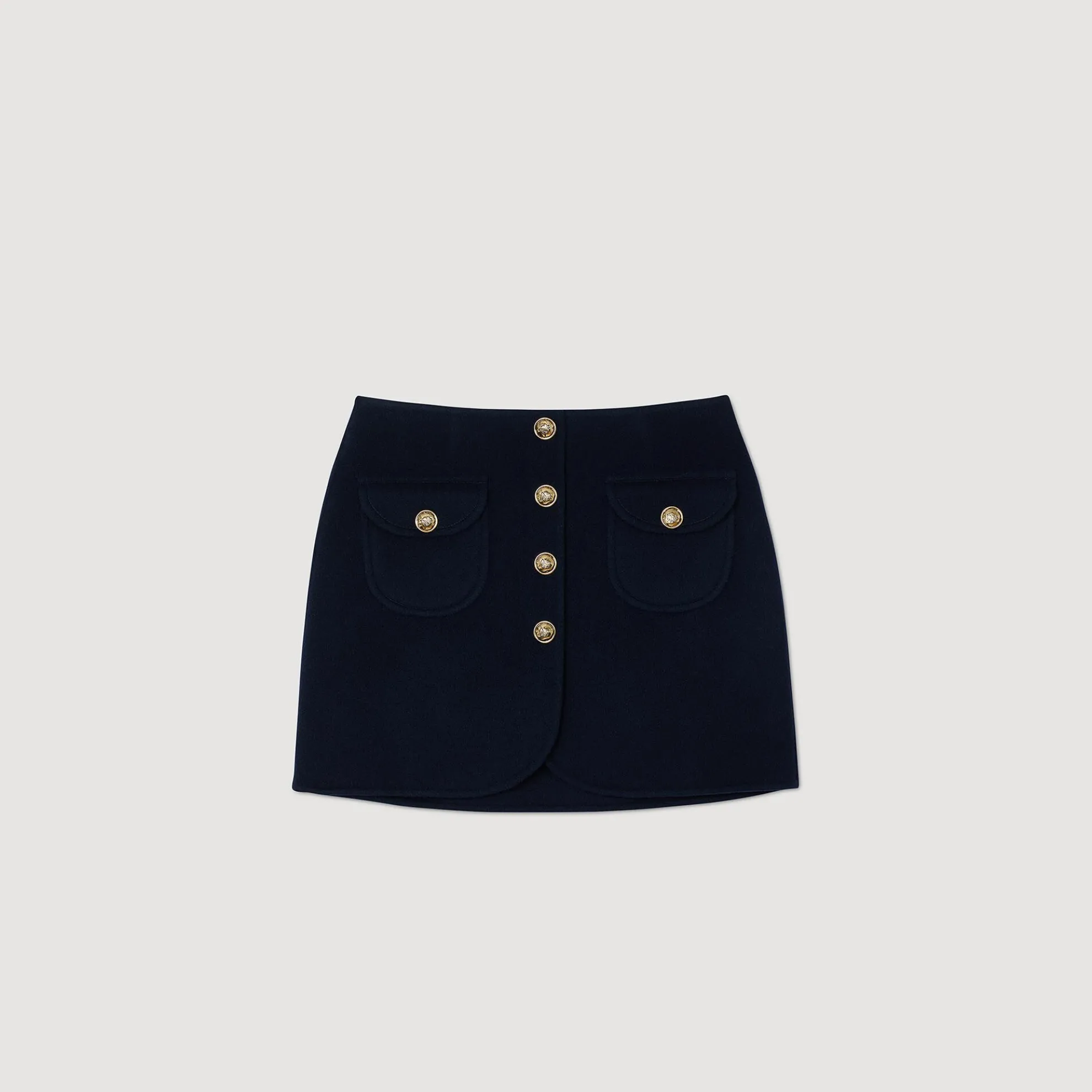 Korte dubbelzijdige rok van wol met vergulde drukknopen aan de voorkant, klepzakken en afgeronde randen.