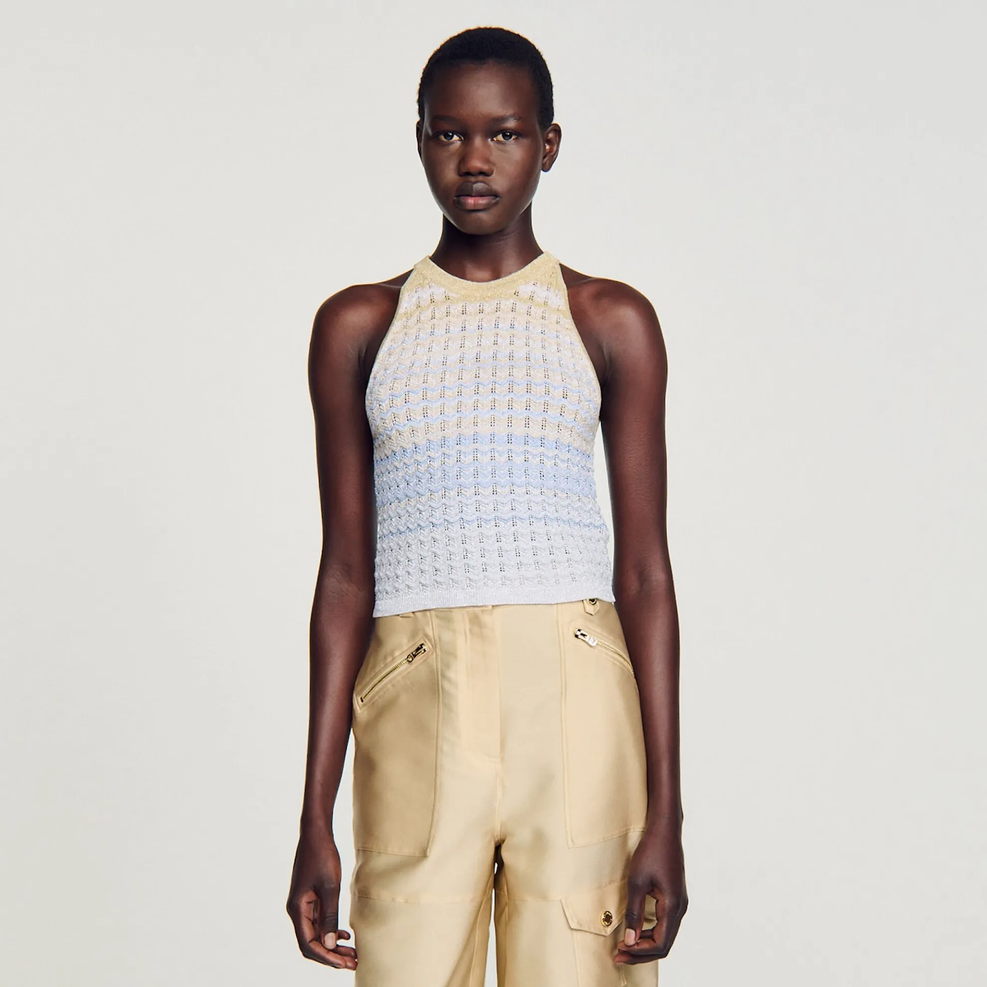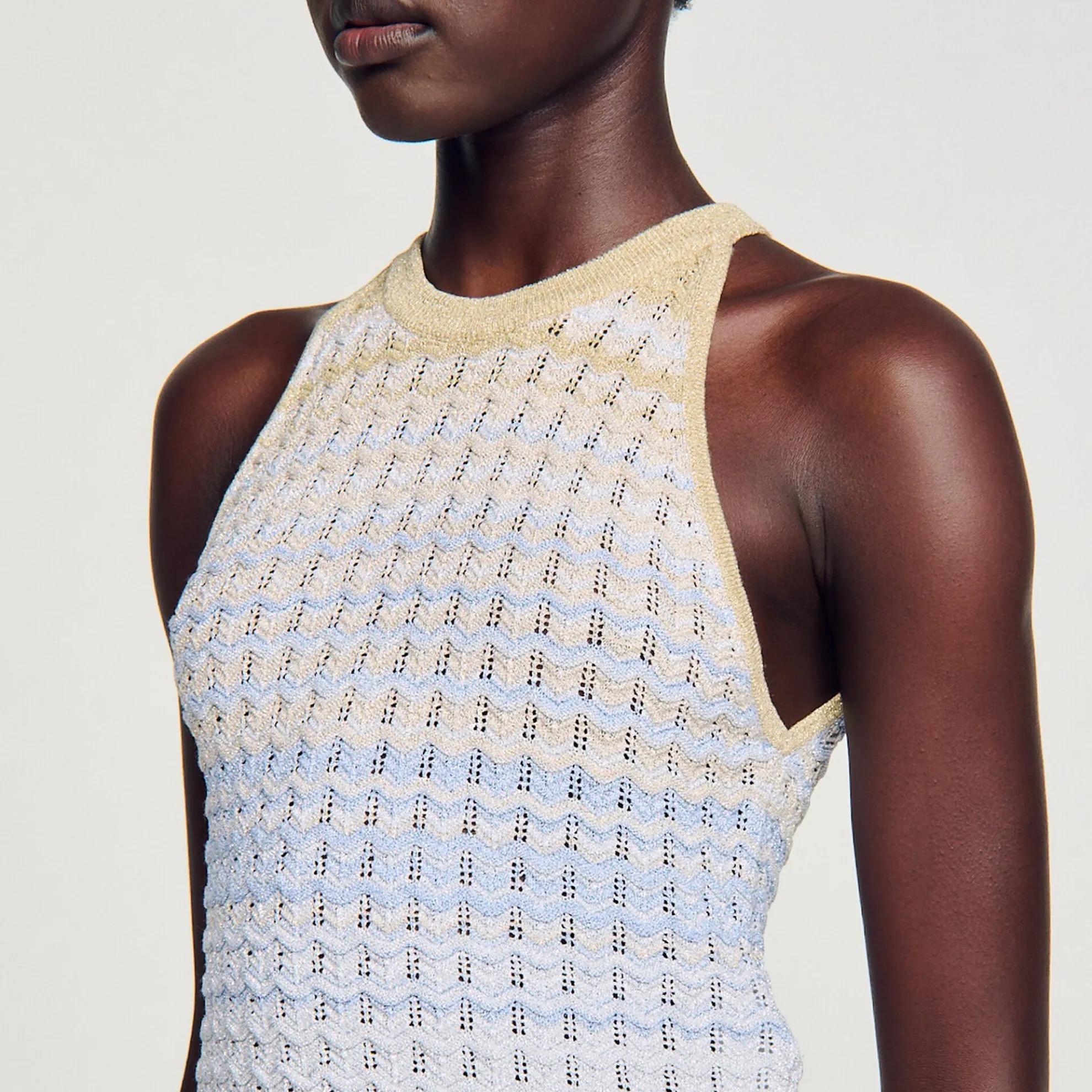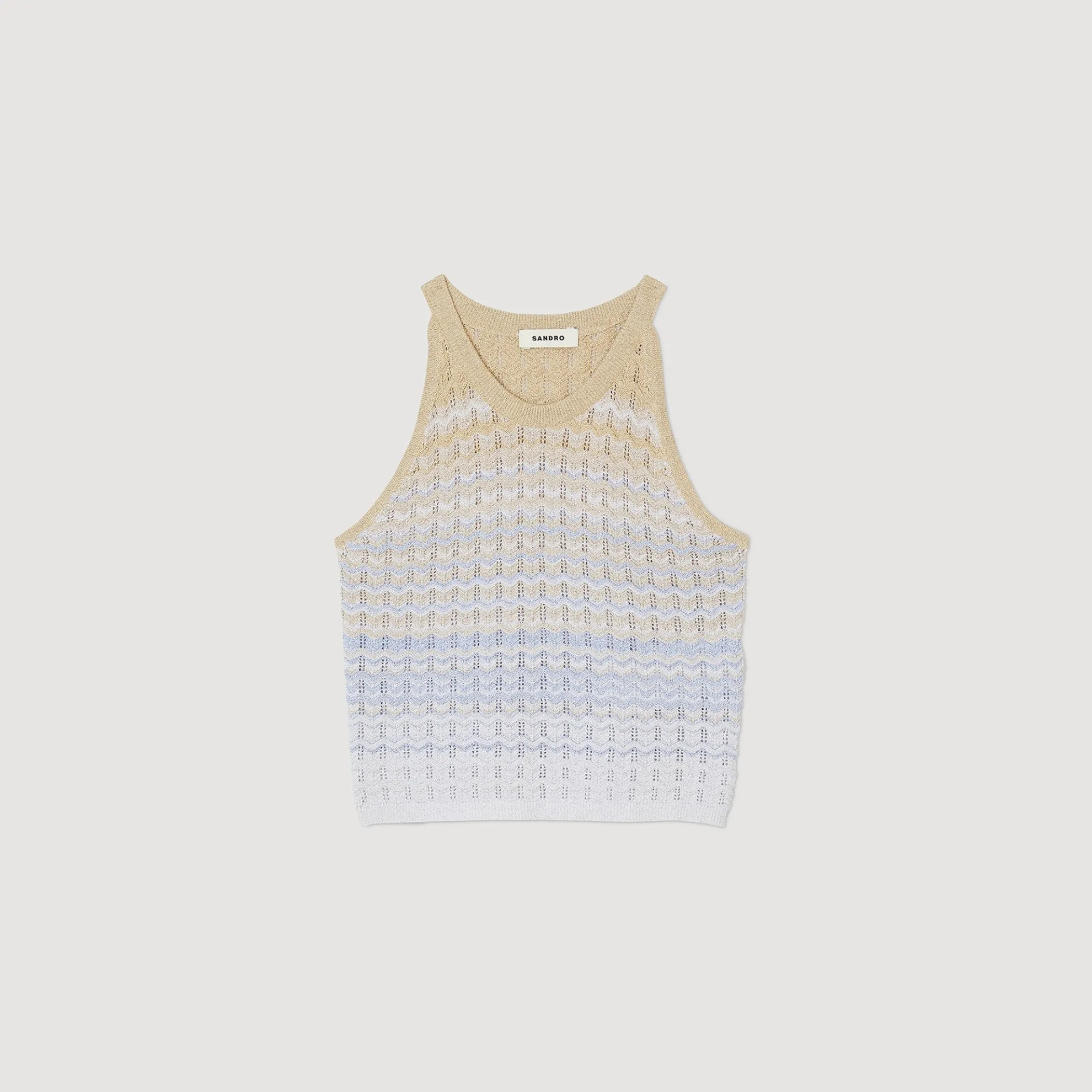 Korte top pointillé gebreid met kleurverloop, zigzagpatroon, Amerikaanse armsgaten en een ronde halslijn.
