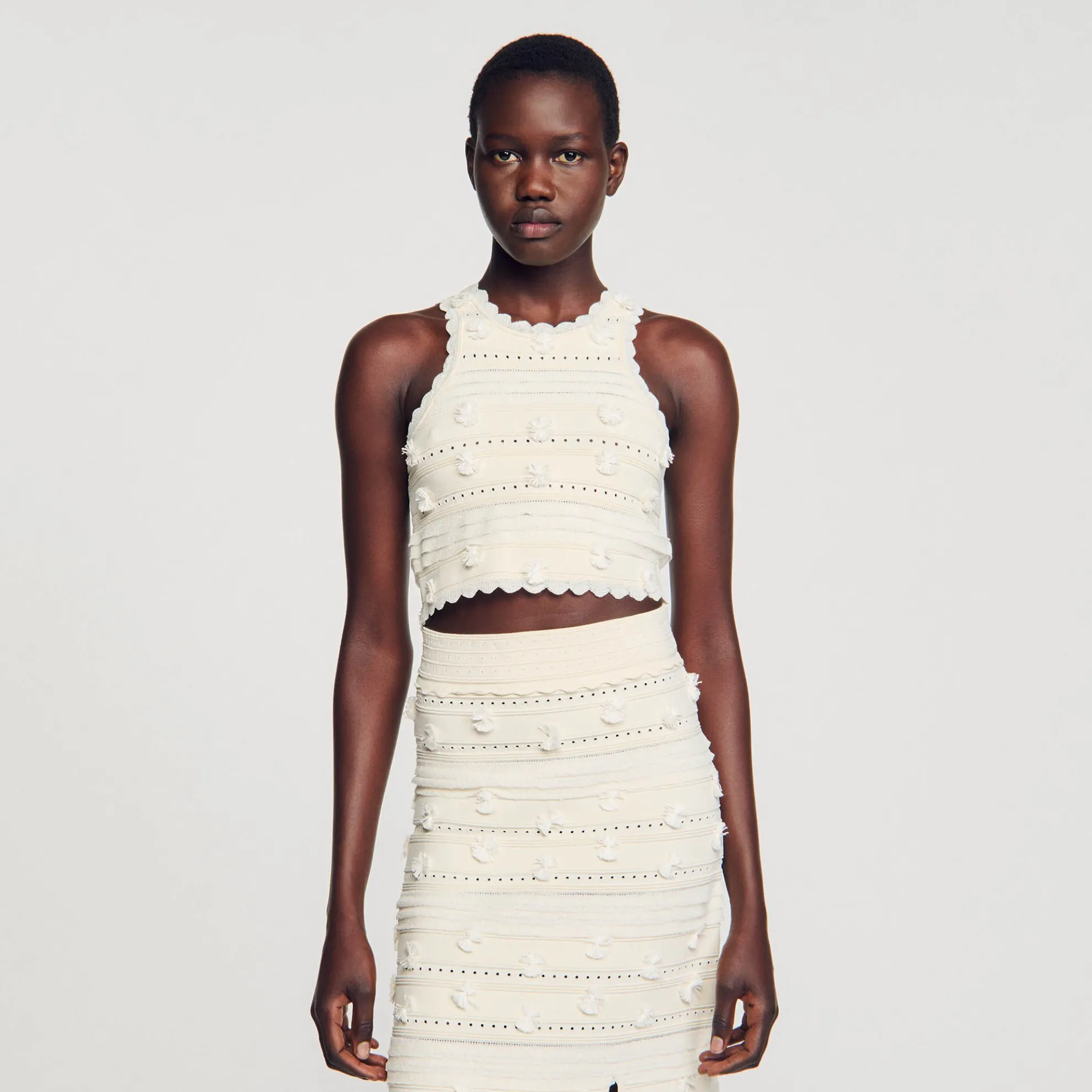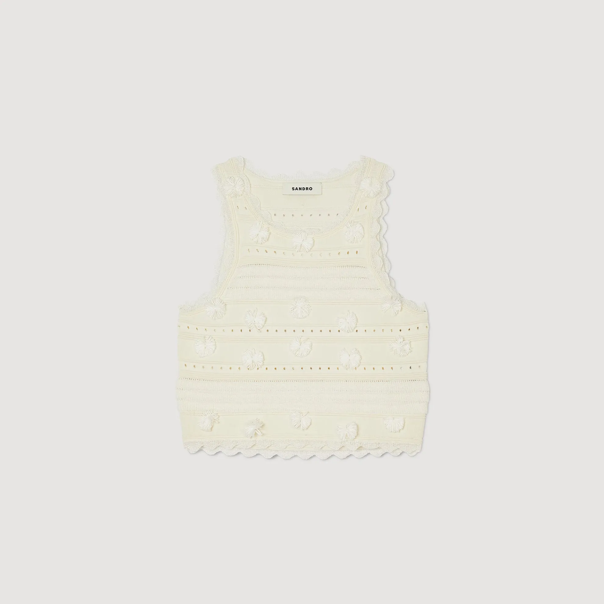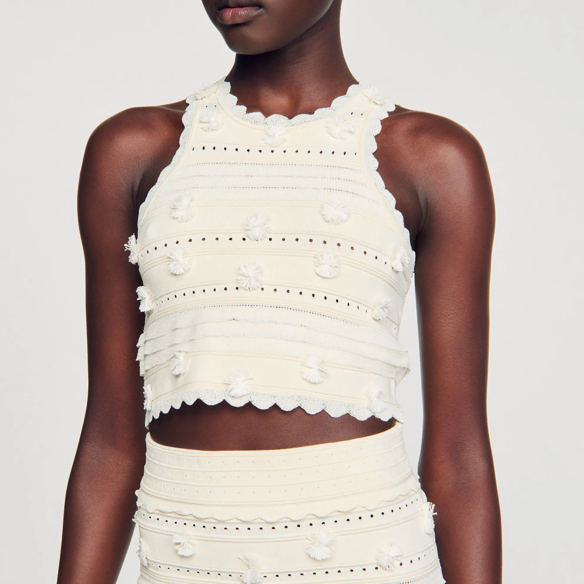 Korte top van opengewerkt breisel versierd met kleine ruches en kwastjes, armsgaten in Amerikaanse stijl en geribde boorden.