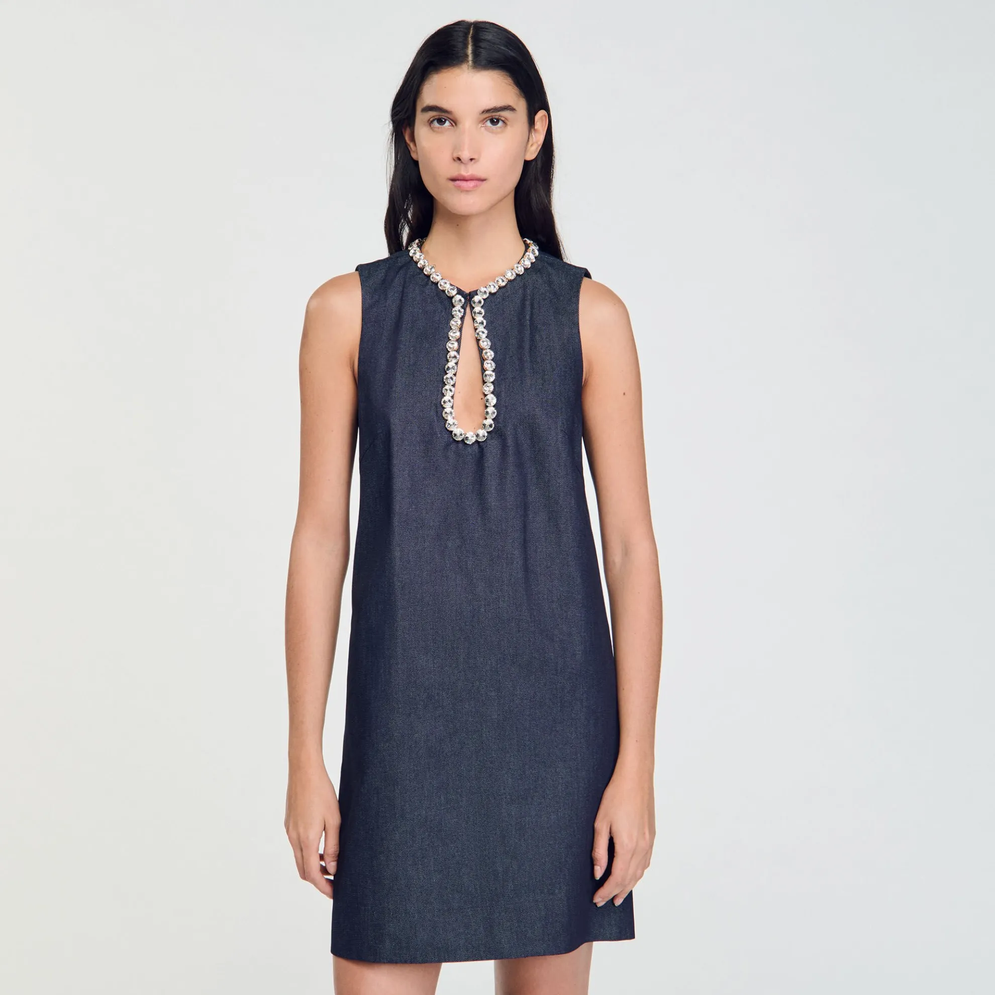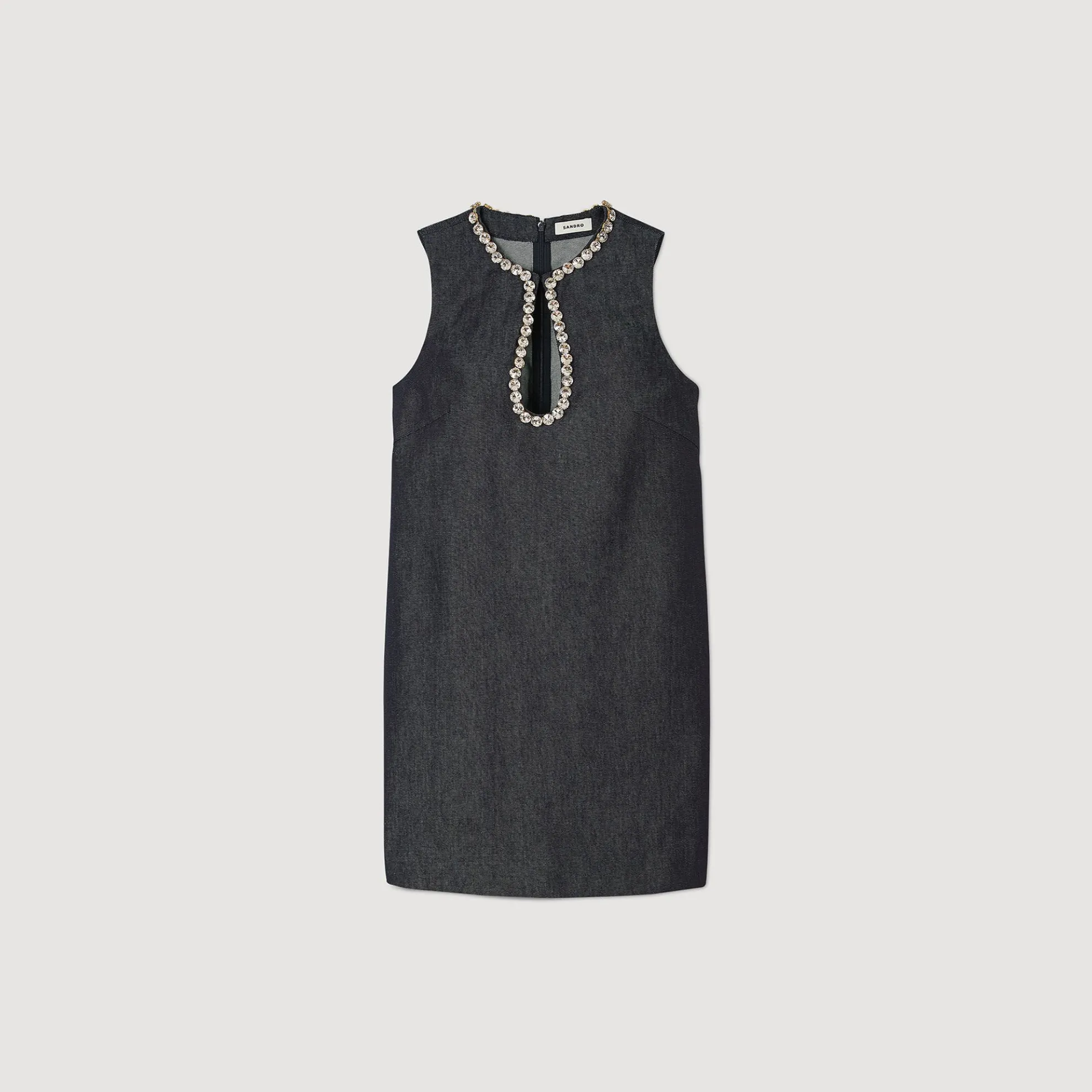 Mouwloze korte spijkerjurk met druppelvormige hals met stras.