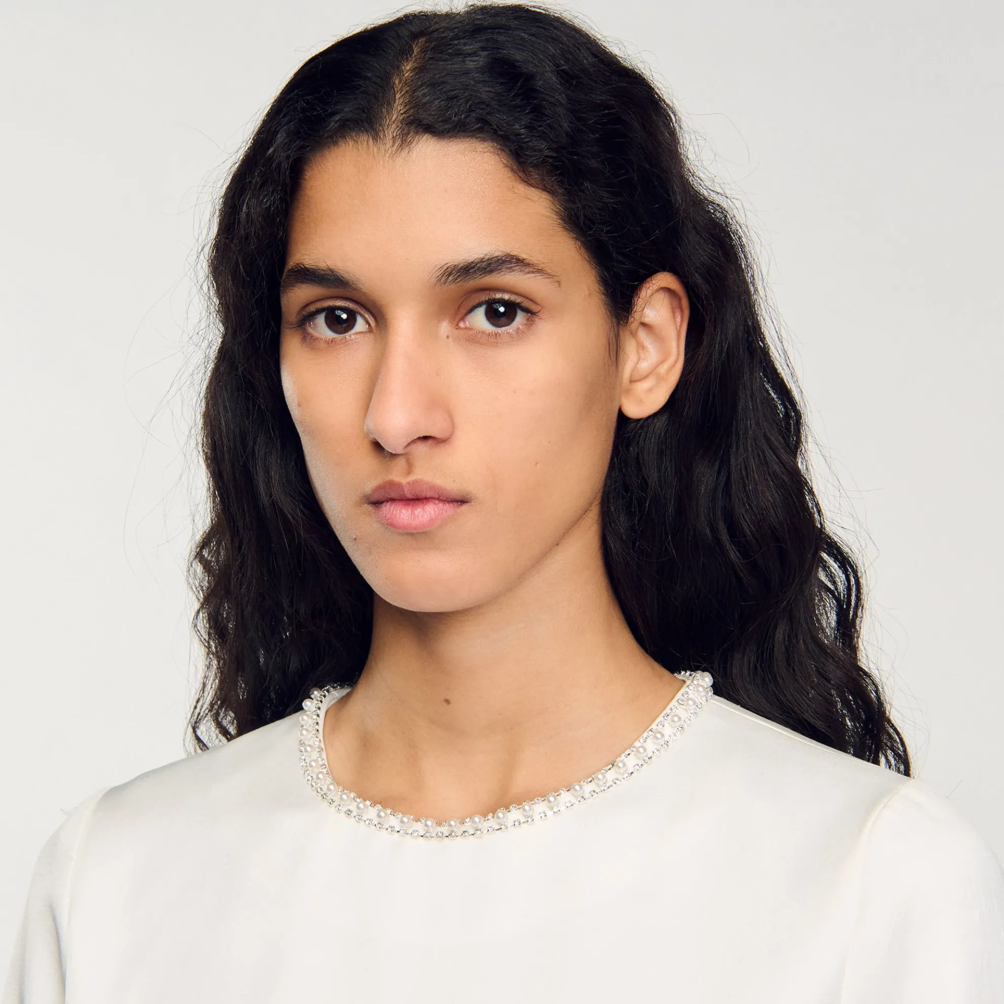 Korte, satijnen jurk met een ronde halslijn versierd met parels, lange mouwen en een geplooid rokgedeelte.